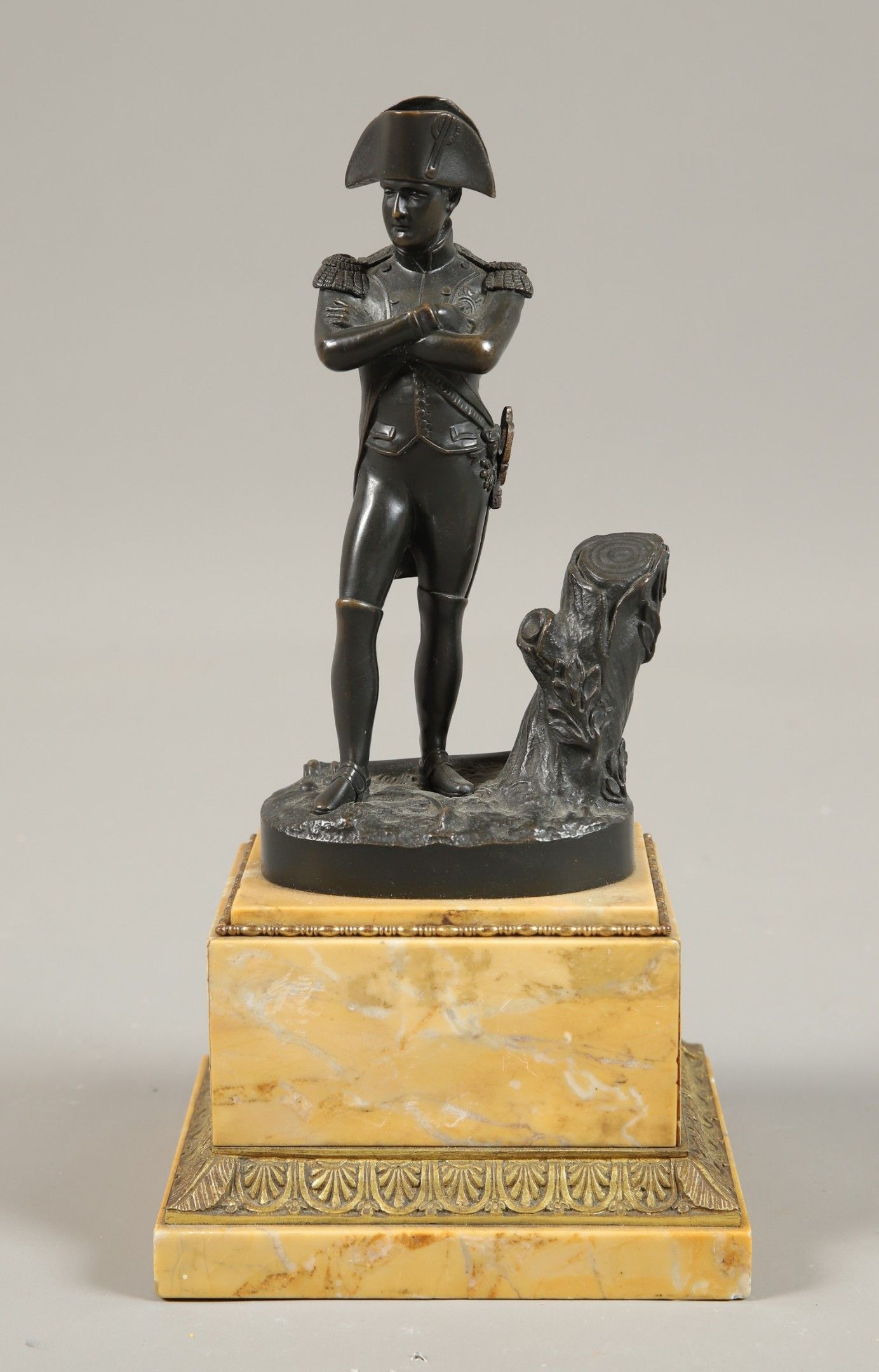 REYMONDAZ, 19th century. Portrait of Bonaparte, 1840. Bronze with brown patina, signed and dated, with the inscription "Bronze Paris". Sienna yellow marble base with bronze mounting. Height: 34 cm