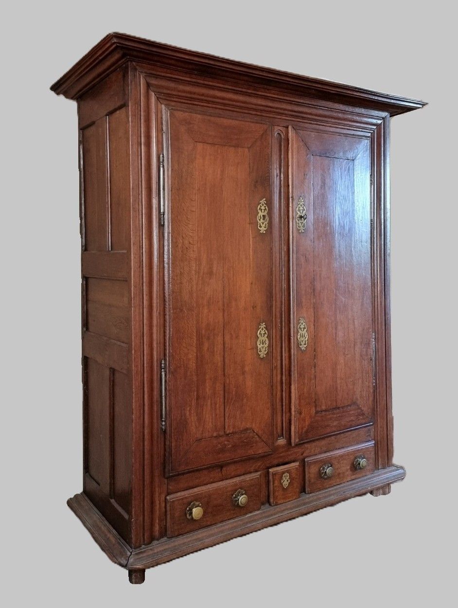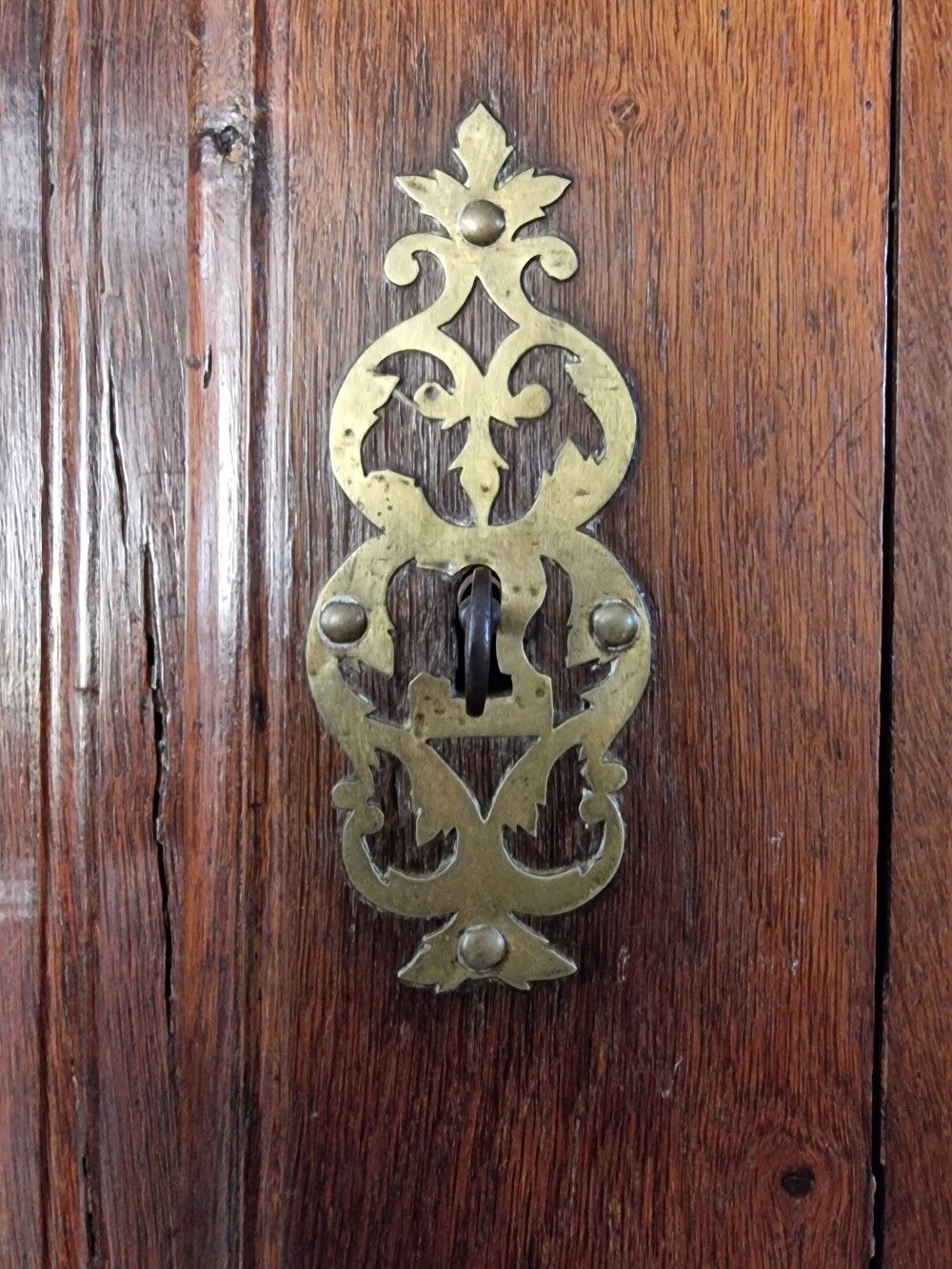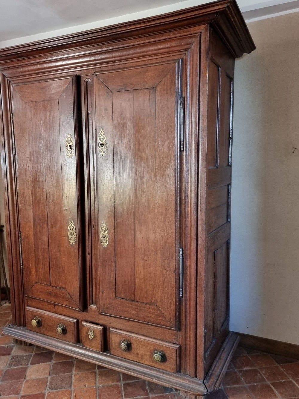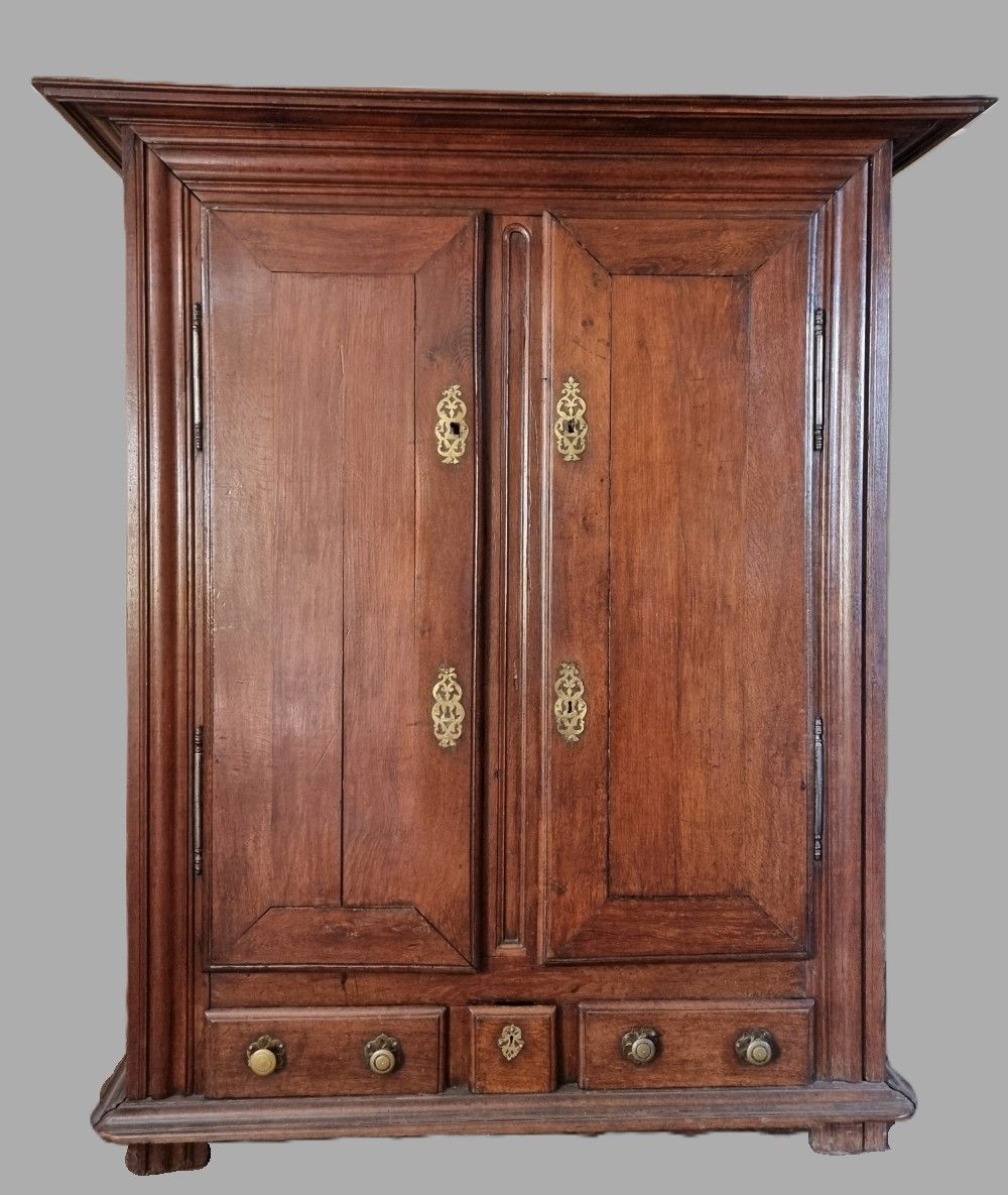 MALOUINE (Rance valley) chestnut panelled cupboard opening to two doors and three drawers; brass escutcheons and handles. Circa 1800. 225 x 190 x 80 cm