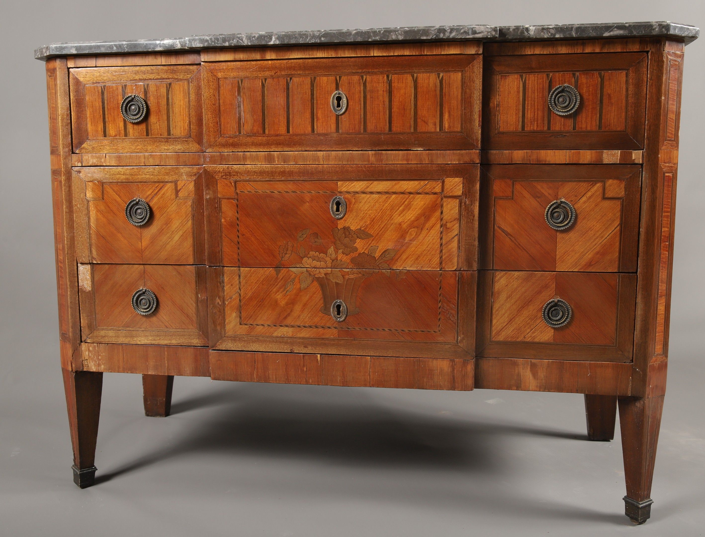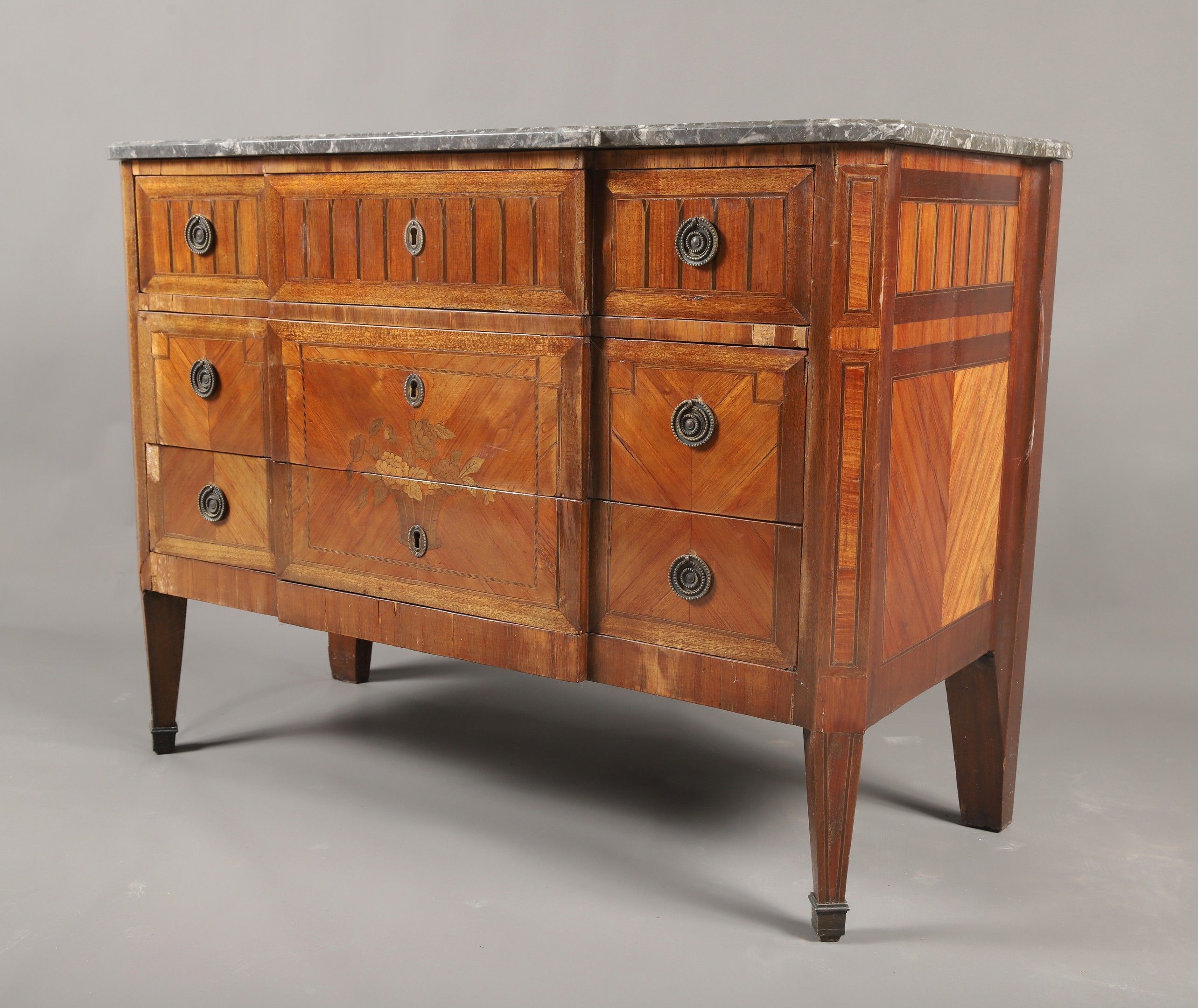Louis XVI style Napoleon III period 3-drawer chest of drawers with rosewood frieze, marquetry of flowers, bâtons rompus, simulated fluting and fillets, Sainte Anne grey marble top. 85 x 121 x 52 cm (missing veneer)