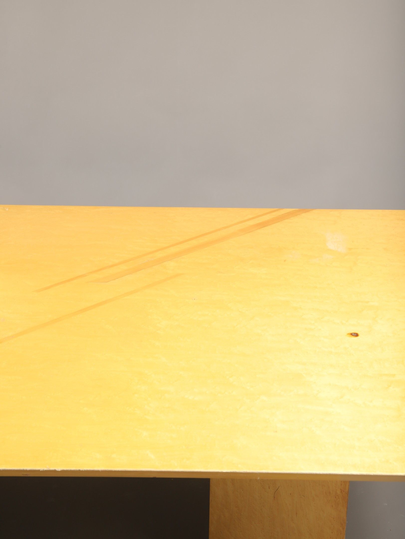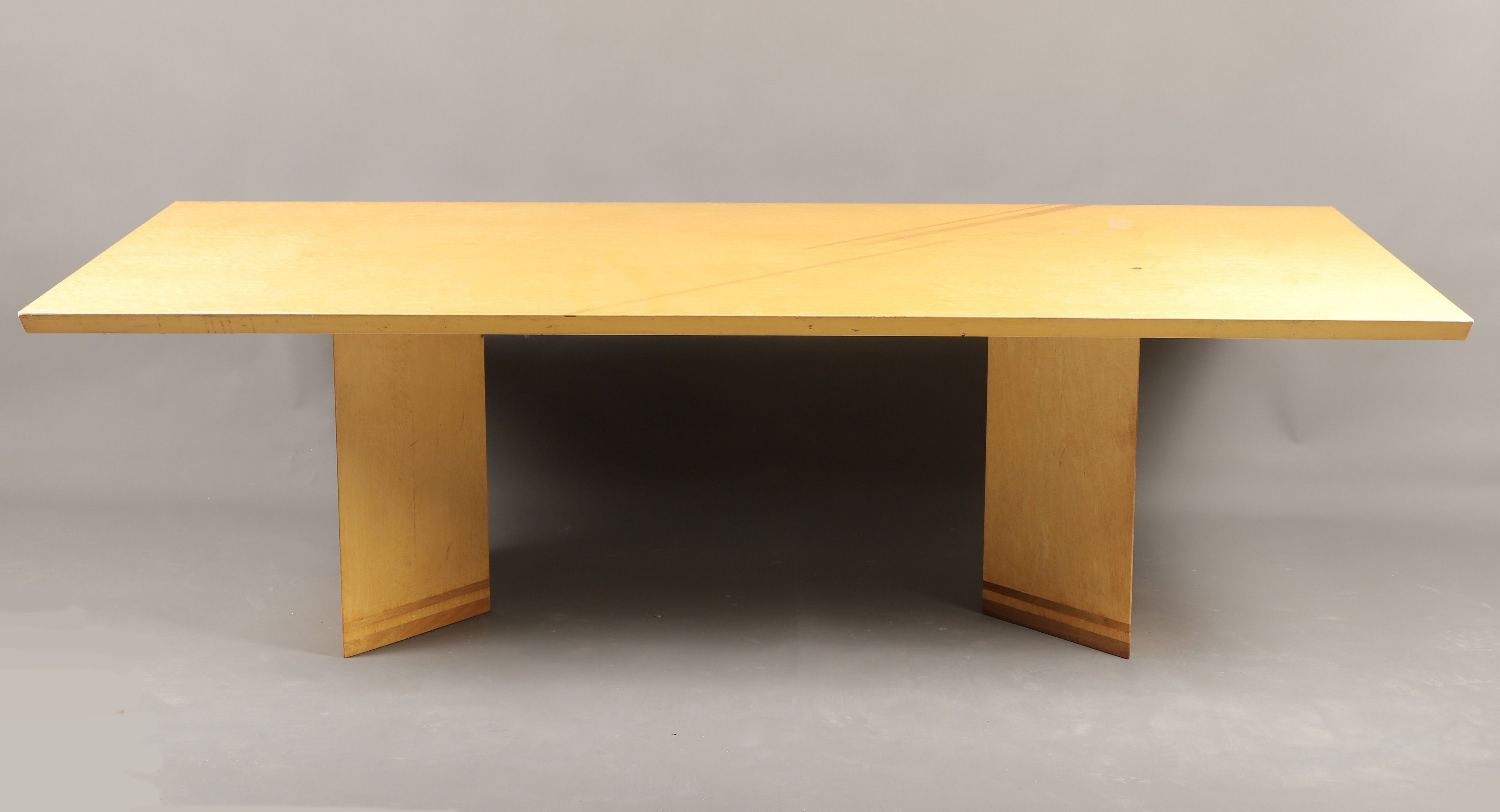 Maple veneered DINING TABLE, top inlaid with diagonal sticks, triangular uprights decorated with bands. 70 x 241 x 110 cm