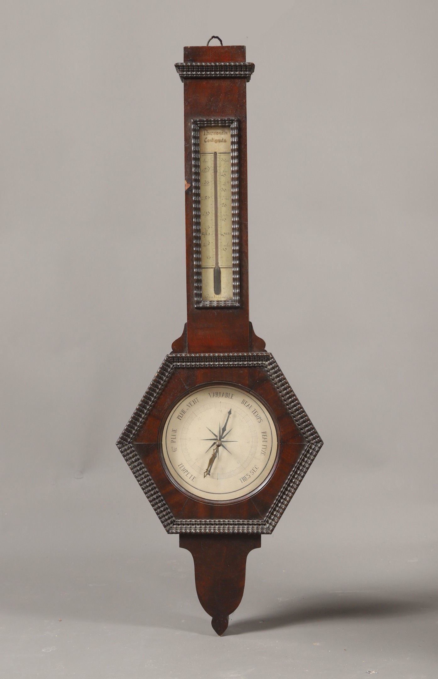 A Louis-Philippe period mahogany guilloche and mahogany veneer BAROMETER-THERMOMETER. Height: 90 cm