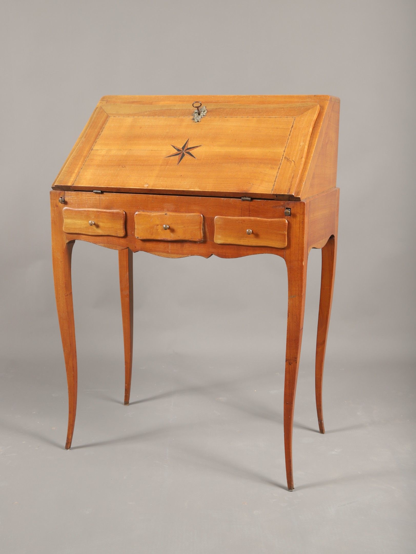 A Louis XV style small Eastern slope desk in cherry wood with star inlay opening to a drawer in the waist and a flap revealing 4 drawers, 4 compartments and a secret. 92 x 65 x 42 cm
