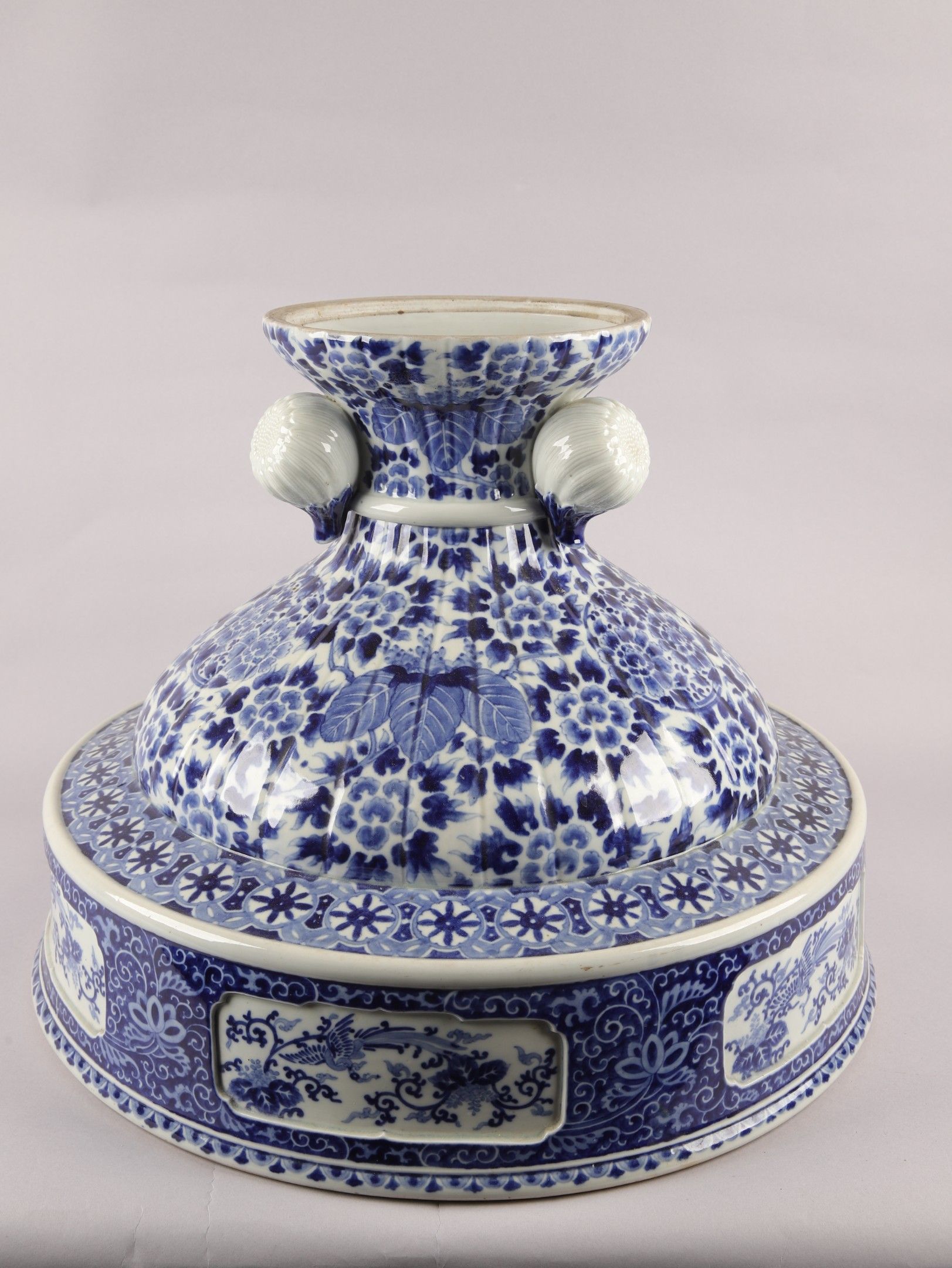 JAPAN, 19th century. IMPORTANT blue-white porcelain SUSPENSION with flower motif, ribbed body, moulded reserve wing. Height: 41 cm