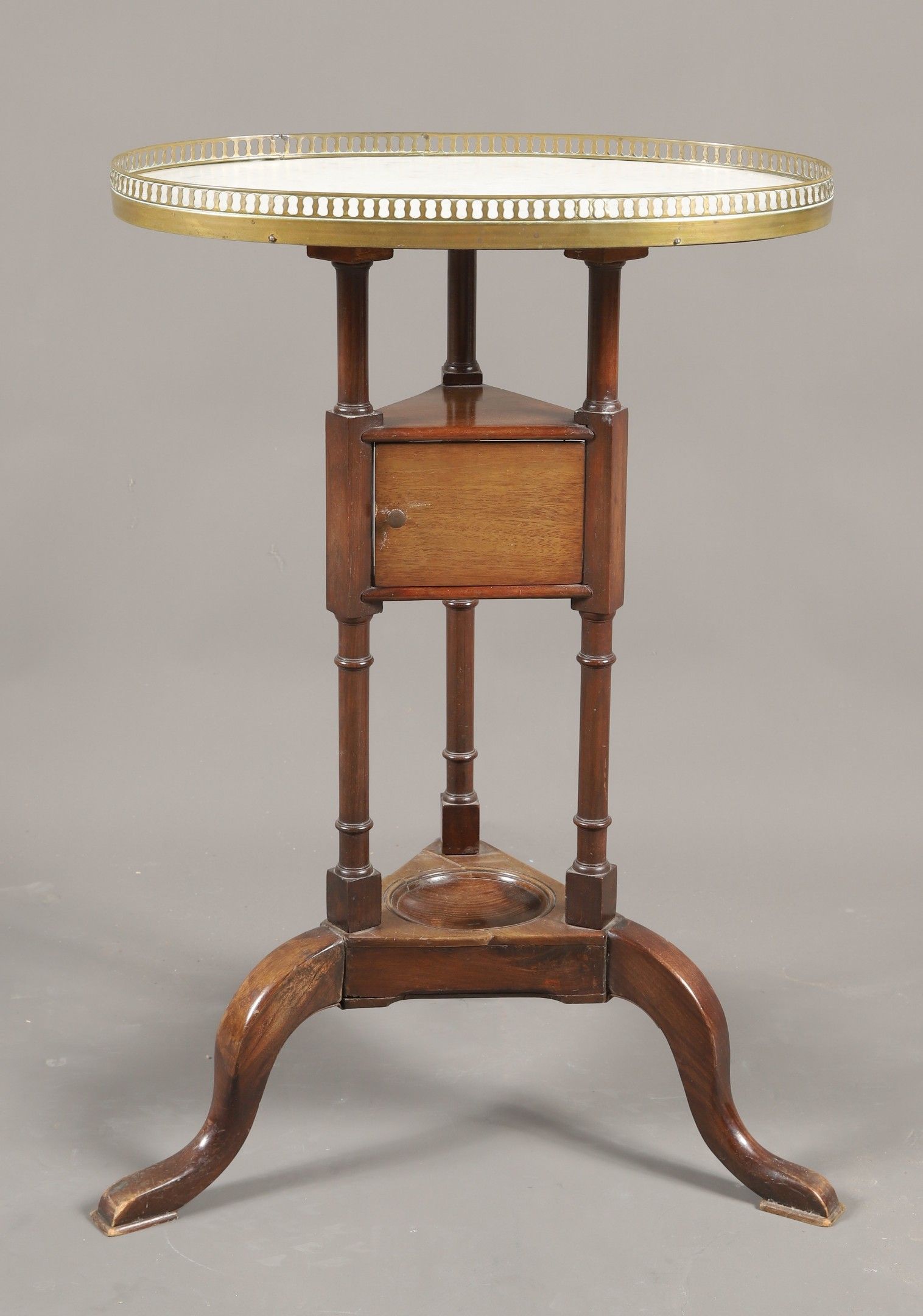 OVAL TRIPOD SALON GUERIDON in the Louis XVI style in mahogany resting on fine balusters with compartmented leaves (two leaves missing) and triangular curved shelf on cabriole legs, white marble top with brass openwork gallery. 75 x 50.5 x 34 cm