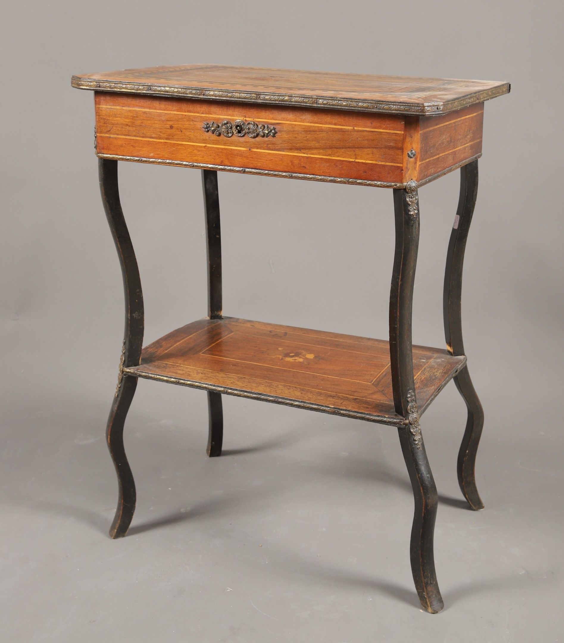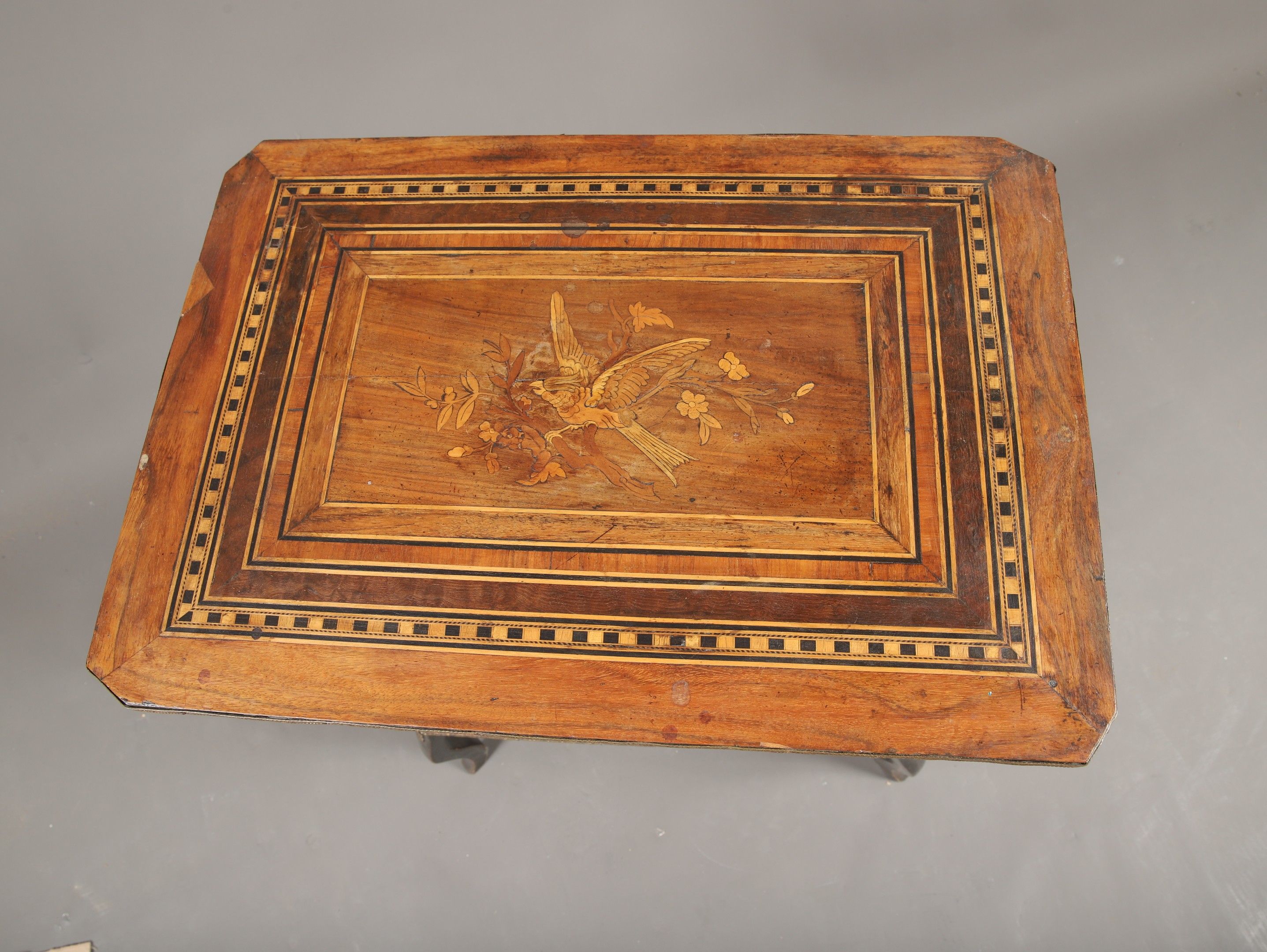 Napoleon III period rosewood and bird and flower marquetry side table, blackened wood sinuous legs. 73 x 55 x 39 cm (restorations and missing)