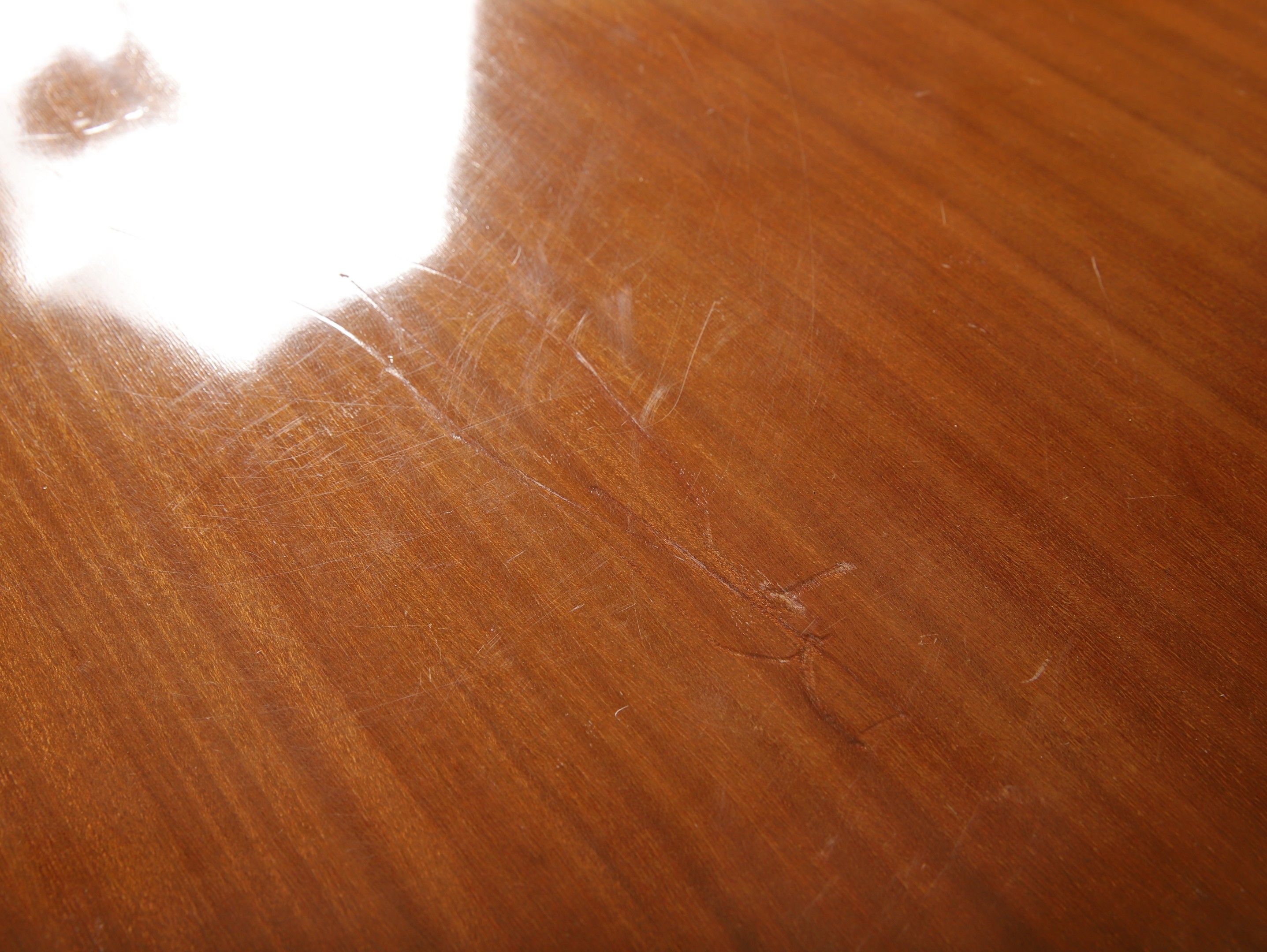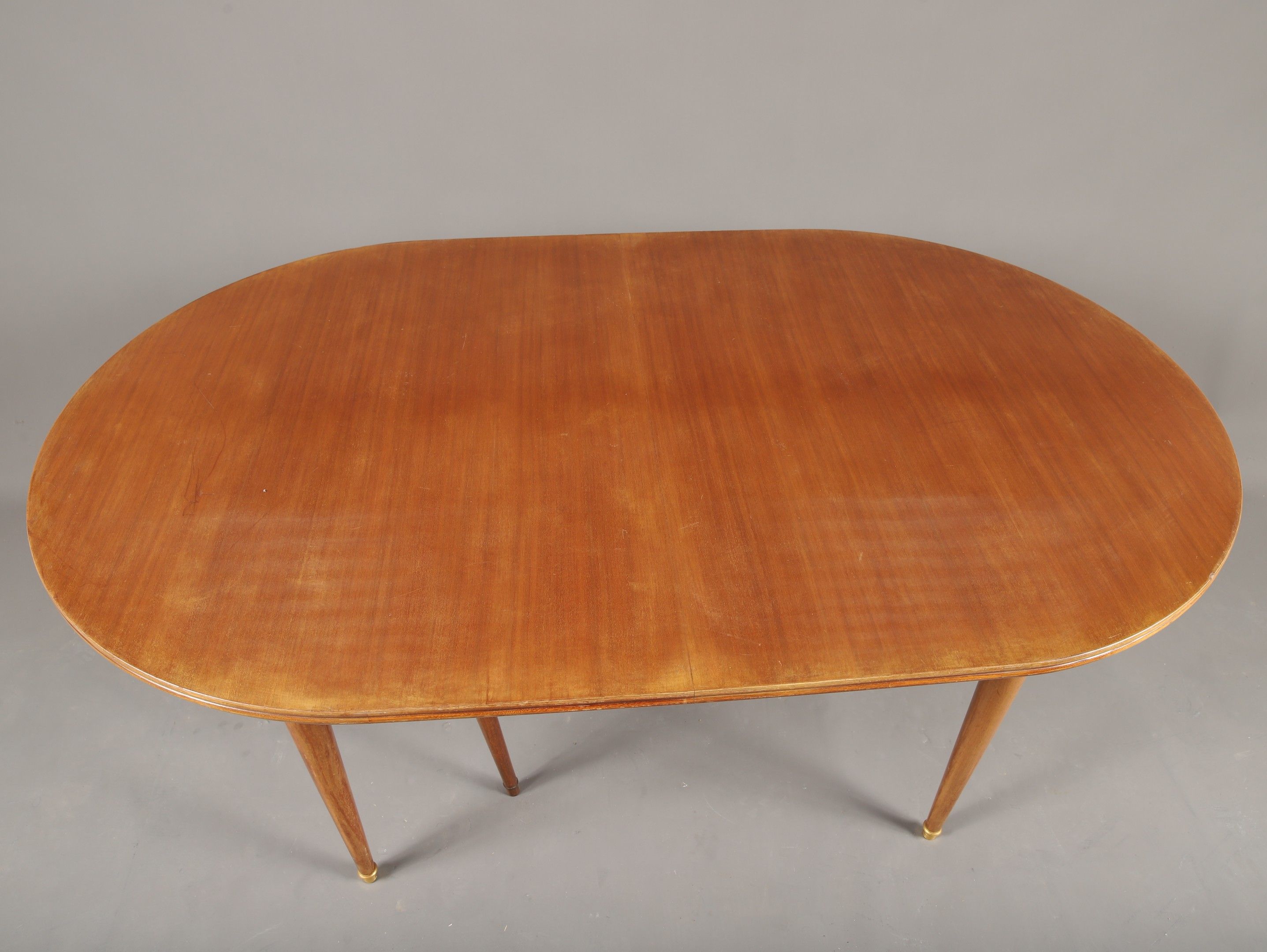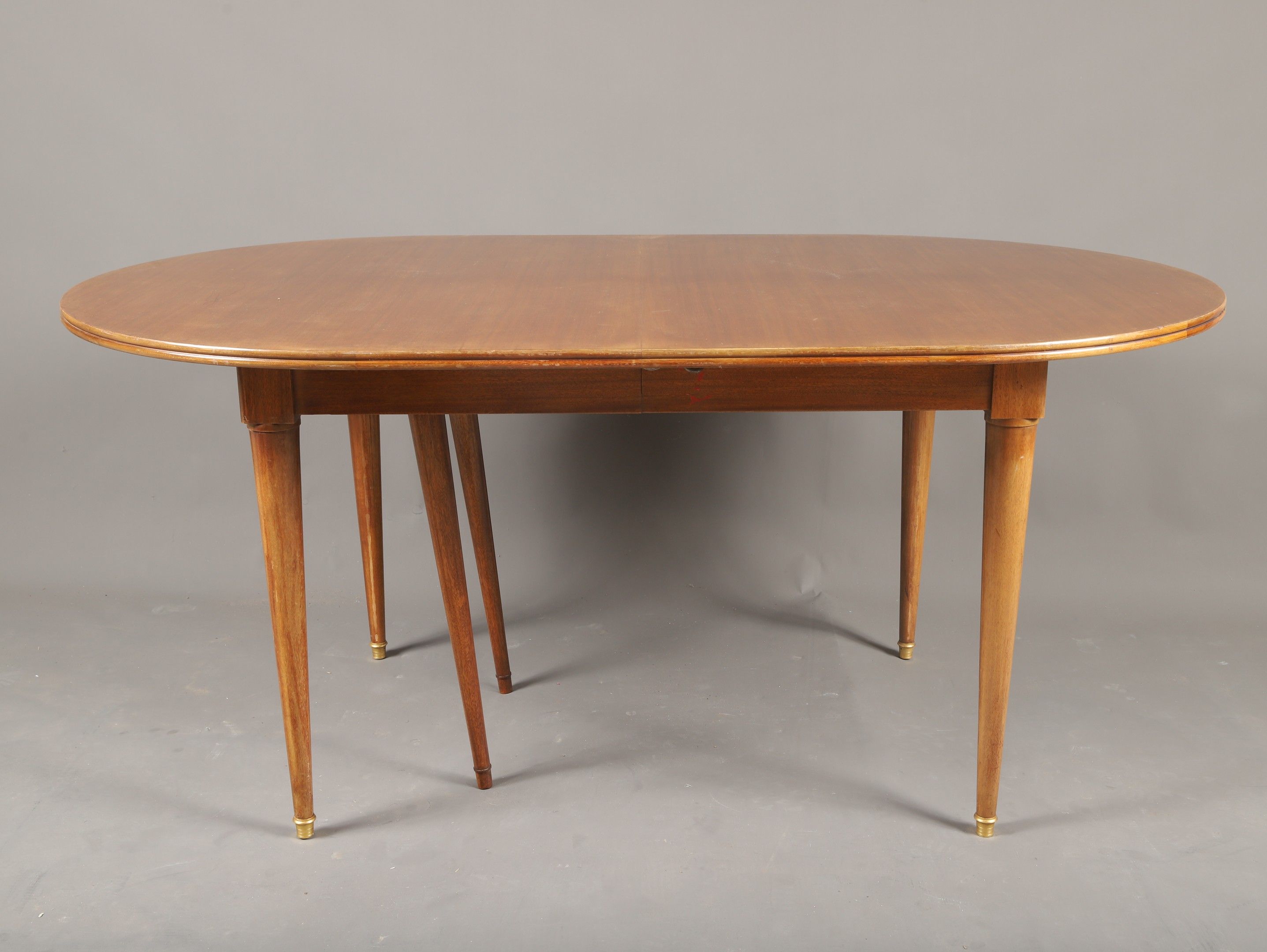 1950s teak ALLONGES DINING TABLE stamped by Jean MOCQUE in Paris standing on 6 tapered legs. Stamped by the Union nationale de l'industrie française de l'ameublement. 71 x 160 x 95 cm (extensions missing)