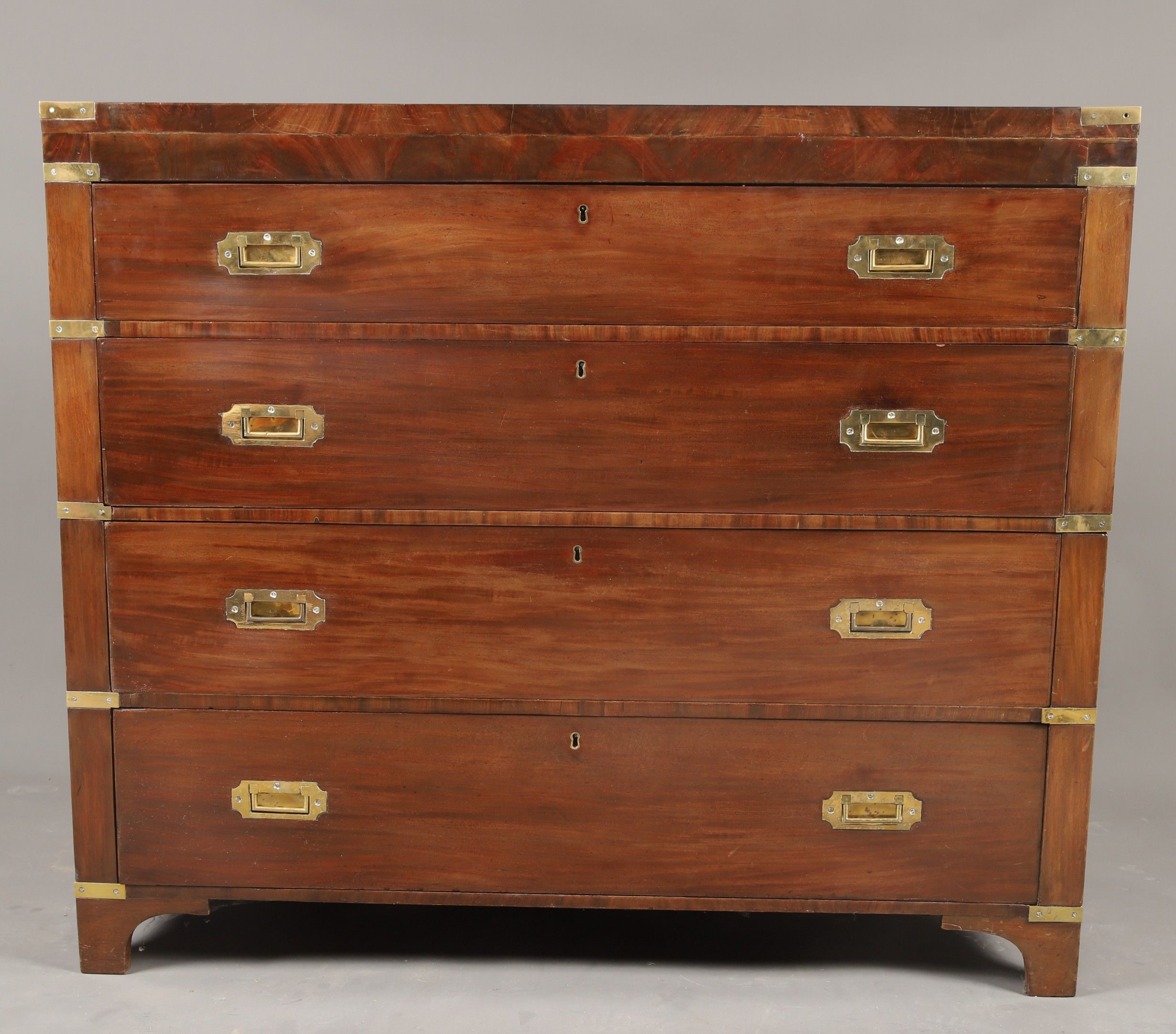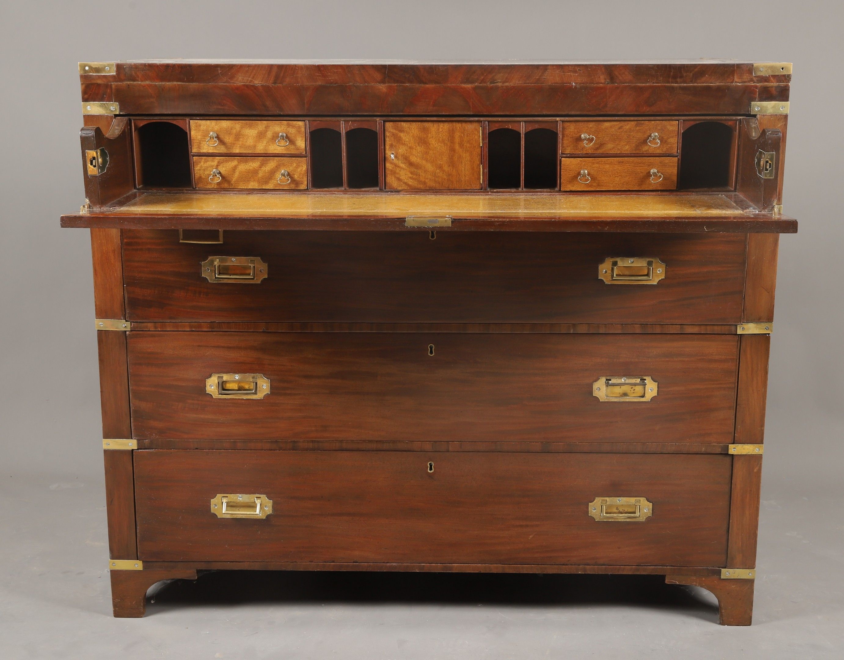 Victorian MARINE SECRETARY COMMODE in solid mahogany with 4 drawers, the top drawer with leather flap revealing drawers and arched compartments, brass fittings (handles and angles). 102 x 122 x 52 cm
