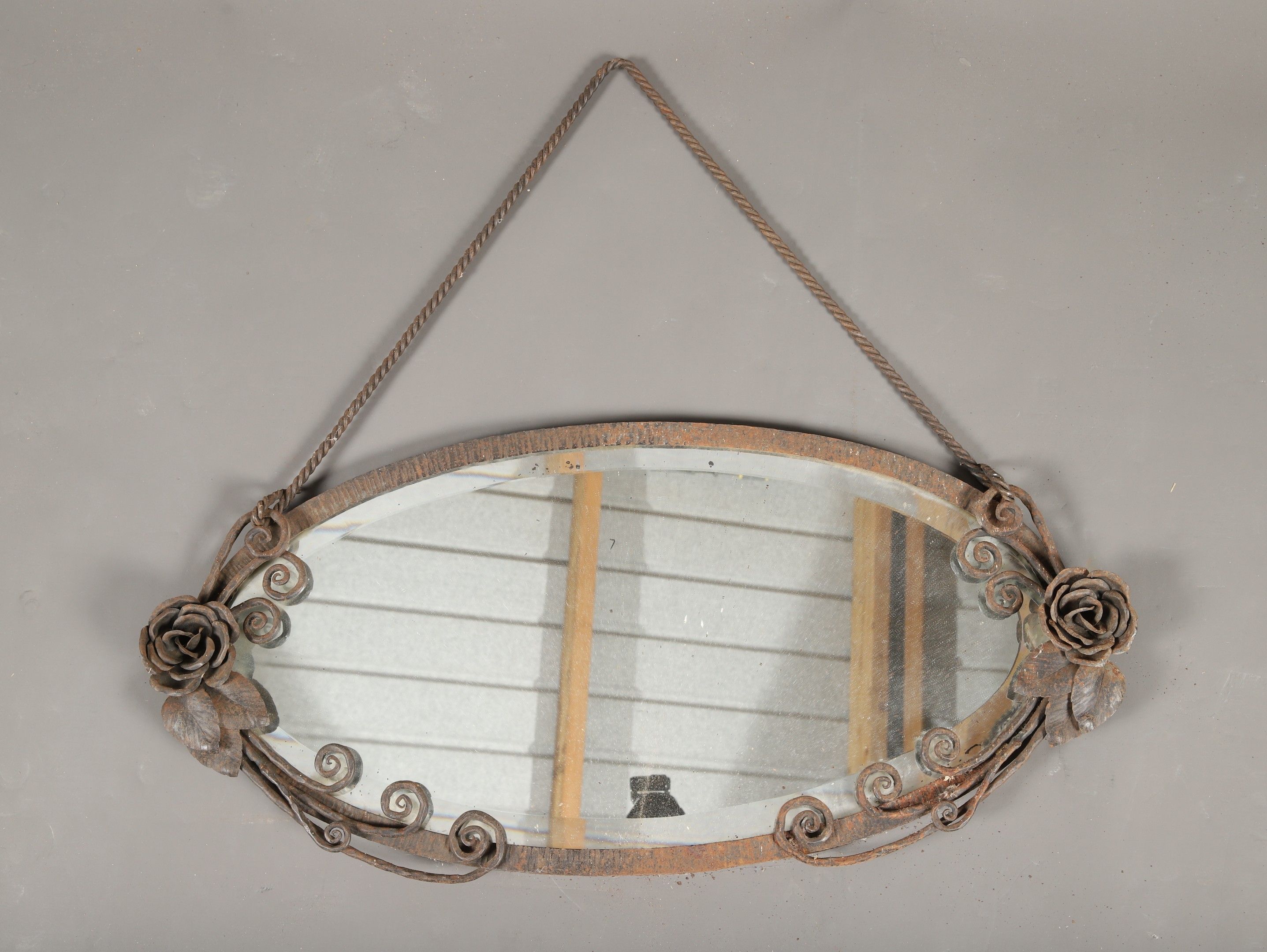 Oval Art Deco wrought iron MIRROR with wrought iron cord.