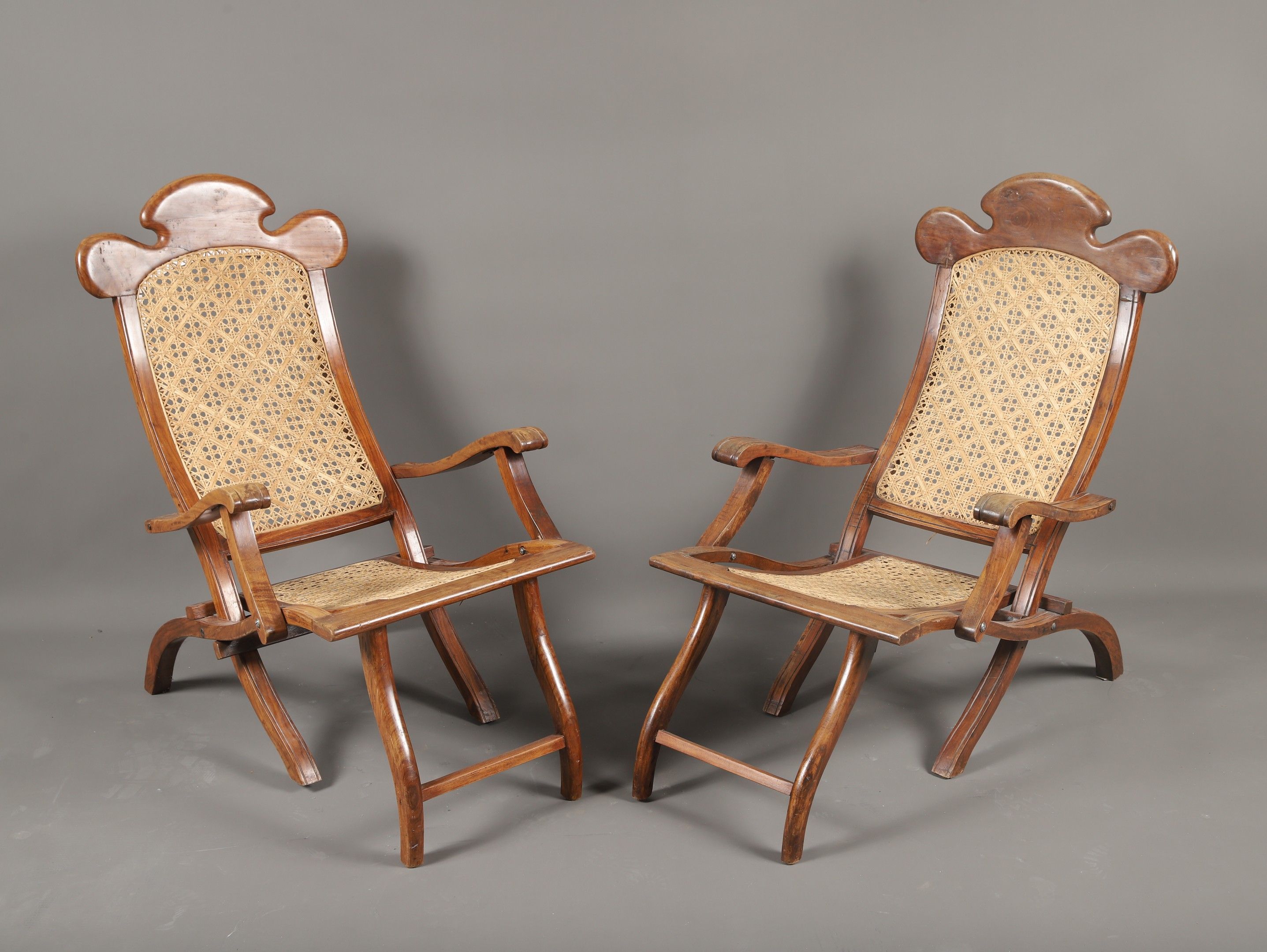 Pair of folding caned armchairs in natural wood with triple back. Height: 97 cm