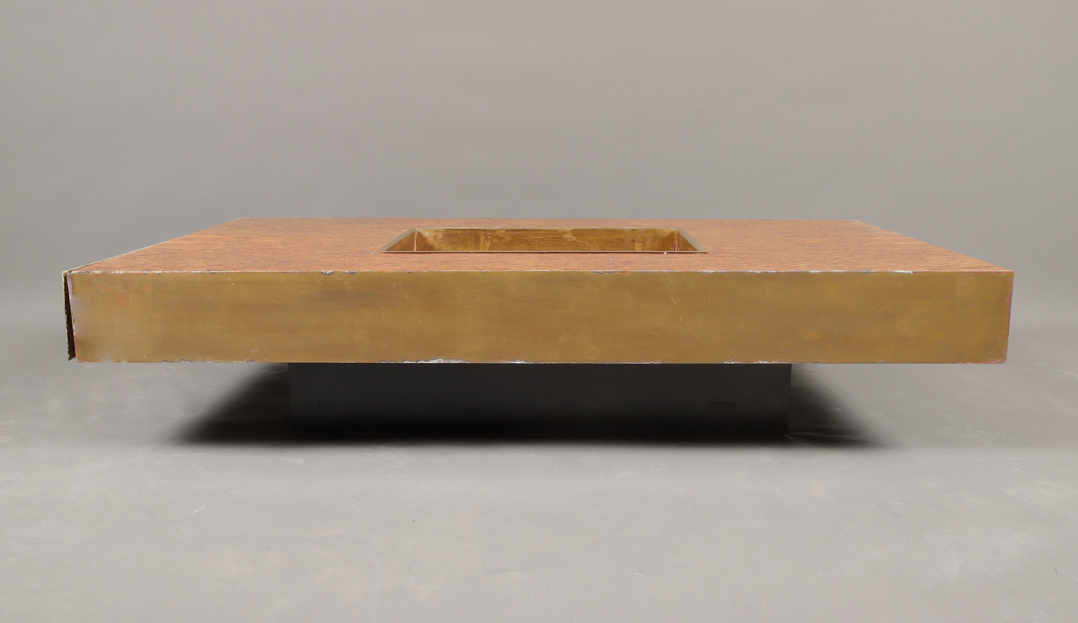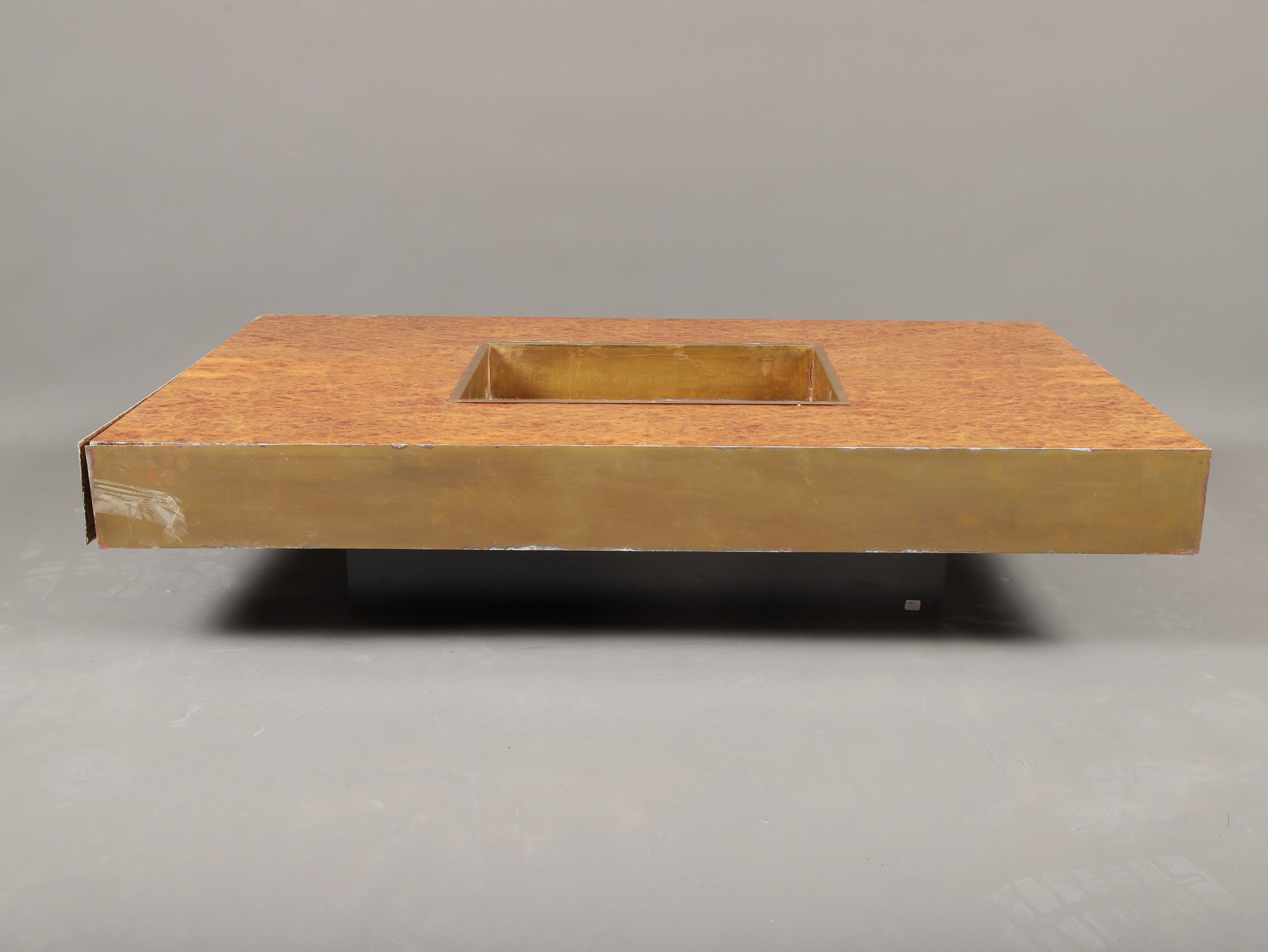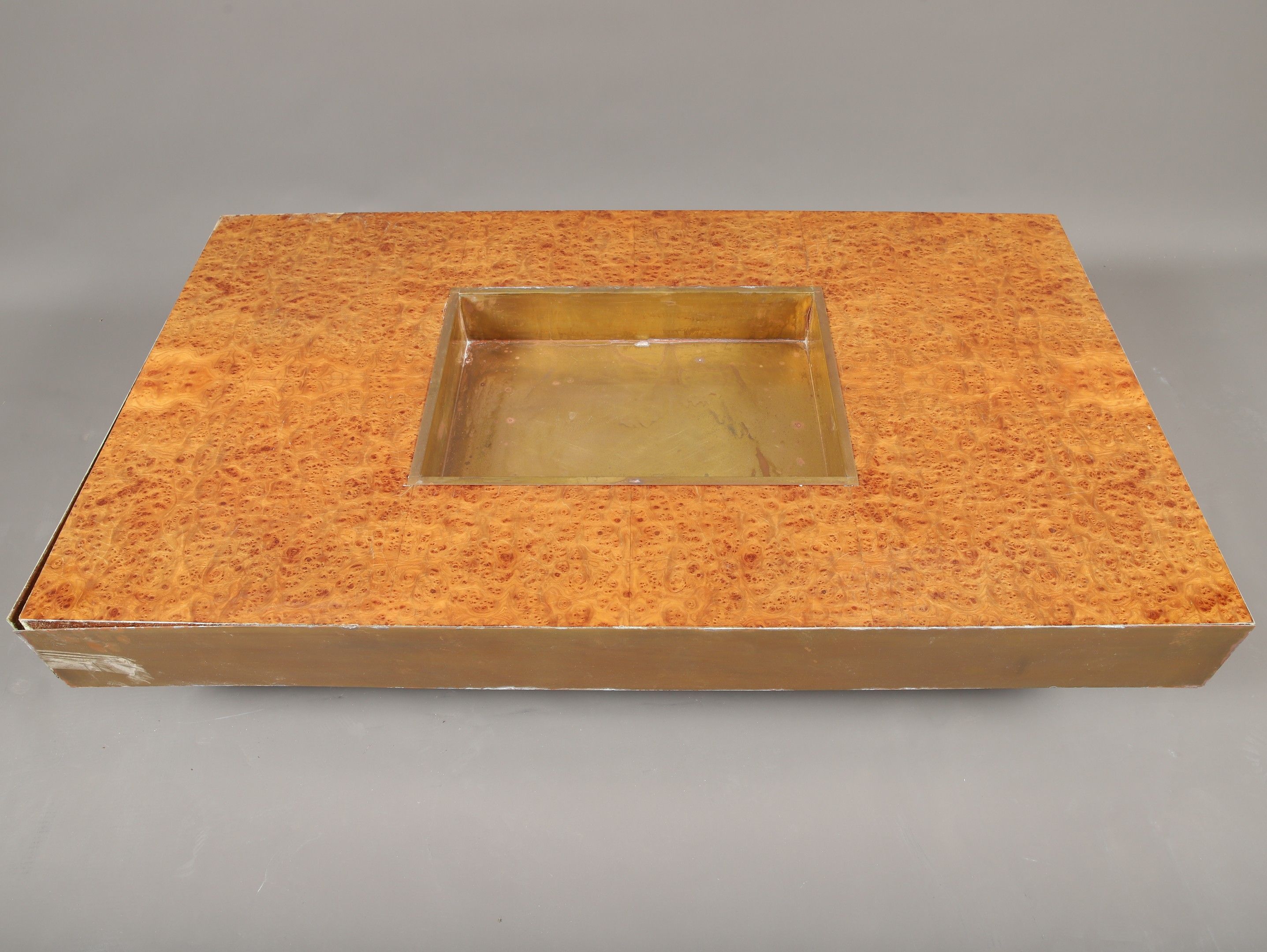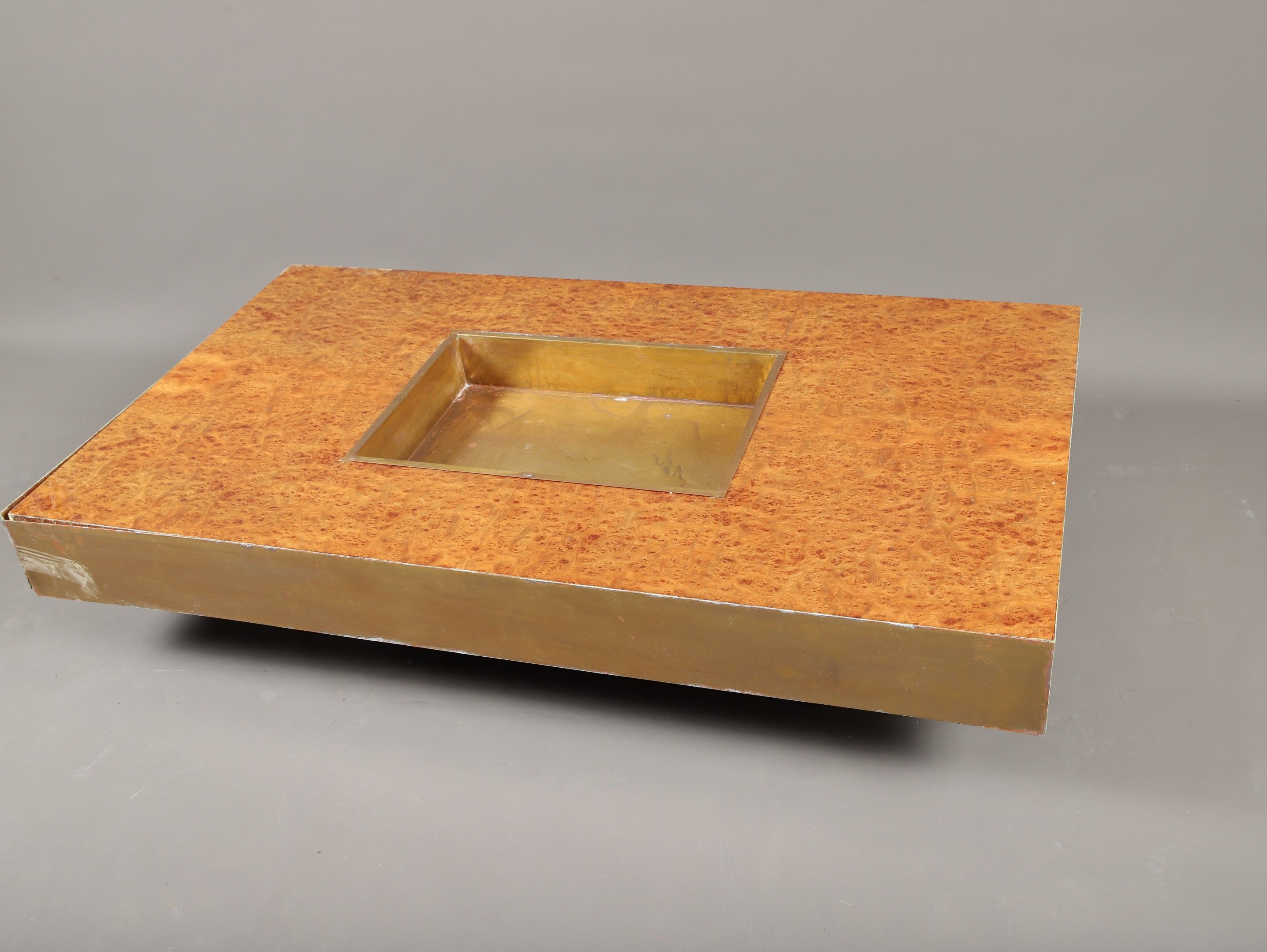 In the Willy RIZZO style. Rectangular coffee table in burr walnut with brass-lined sides and interior, base in blackened wood. 30 x 140 x 80 cm
