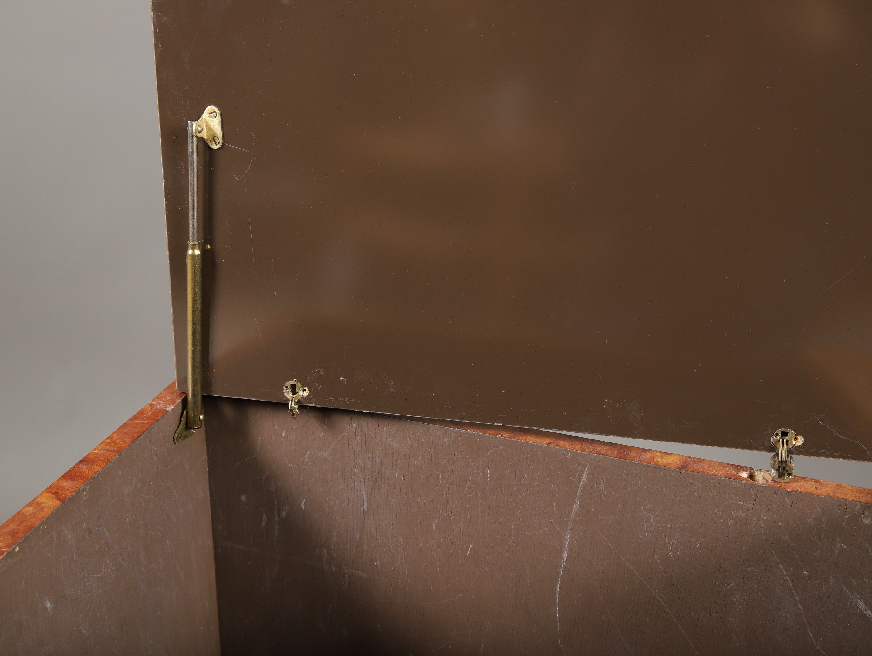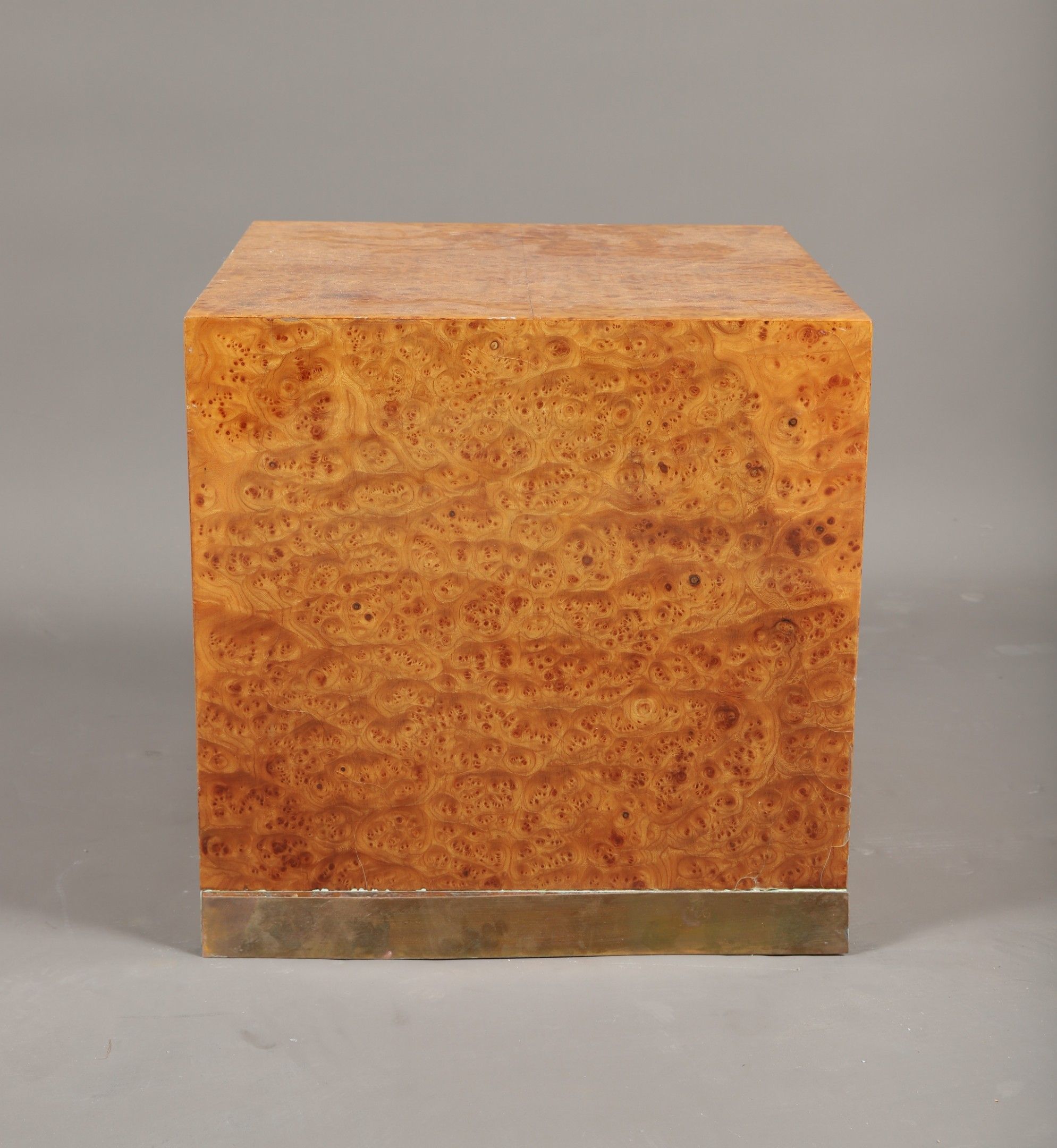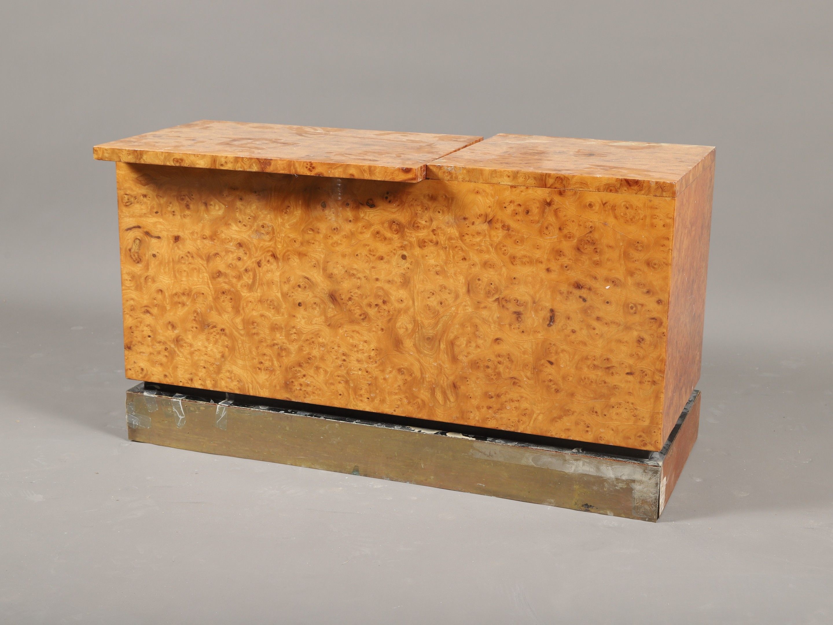 In the Willy RIZZO style. 1) Burr walnut chest opening with a flap, blackened wood choked base on brass lined pedestal. 48 x 85 x 35 cm (hinges to be revised). 2) Burr-walnut bollard with brass strips (missing) 44 x 44 x 44 cm