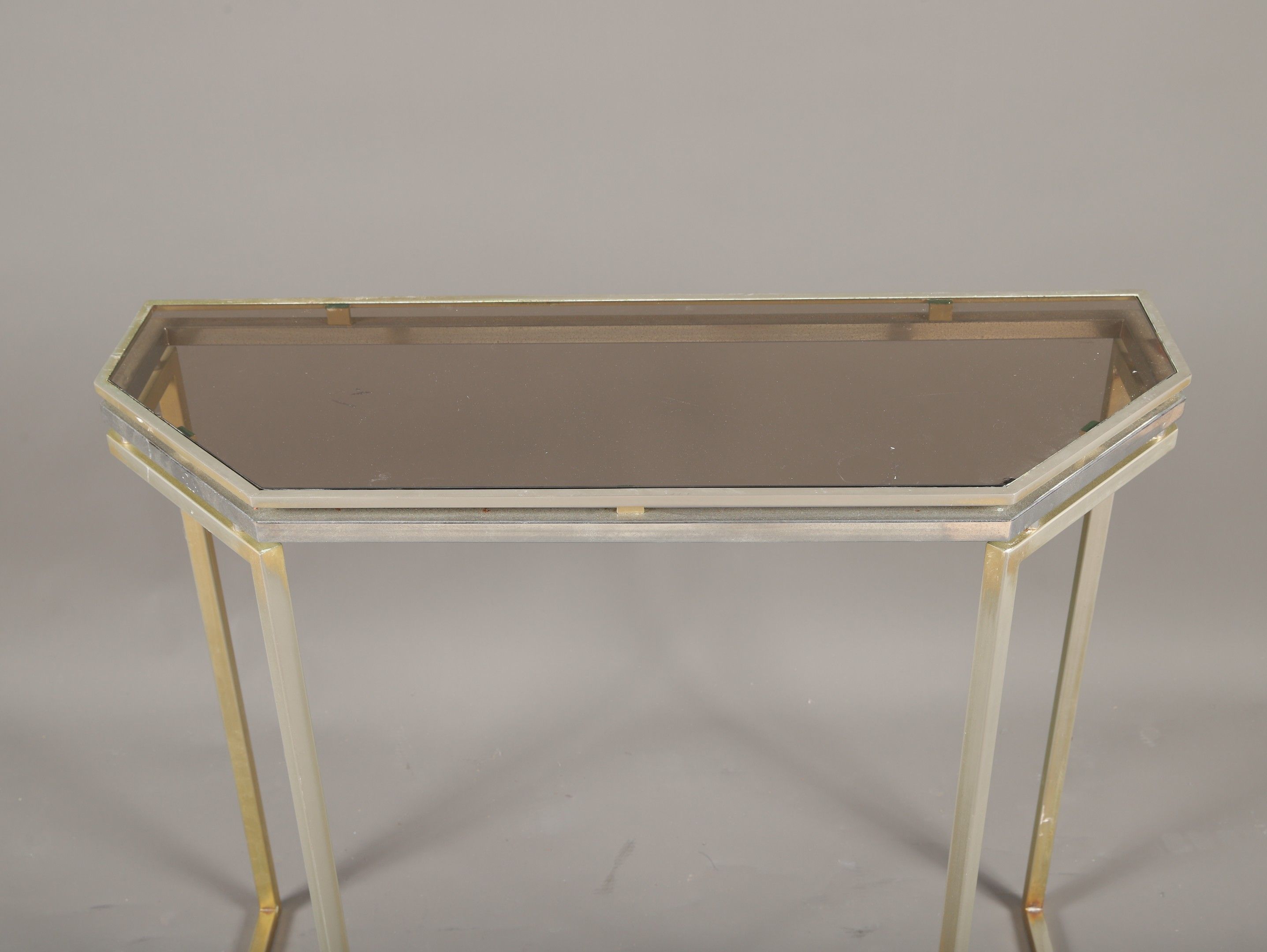 CONSOLE and mirror in chromed metal and brass from the 1970s, console top in smoked glass. Dimensions: H mirror: 80 cm. Console: 80 x 90 x 32 cm