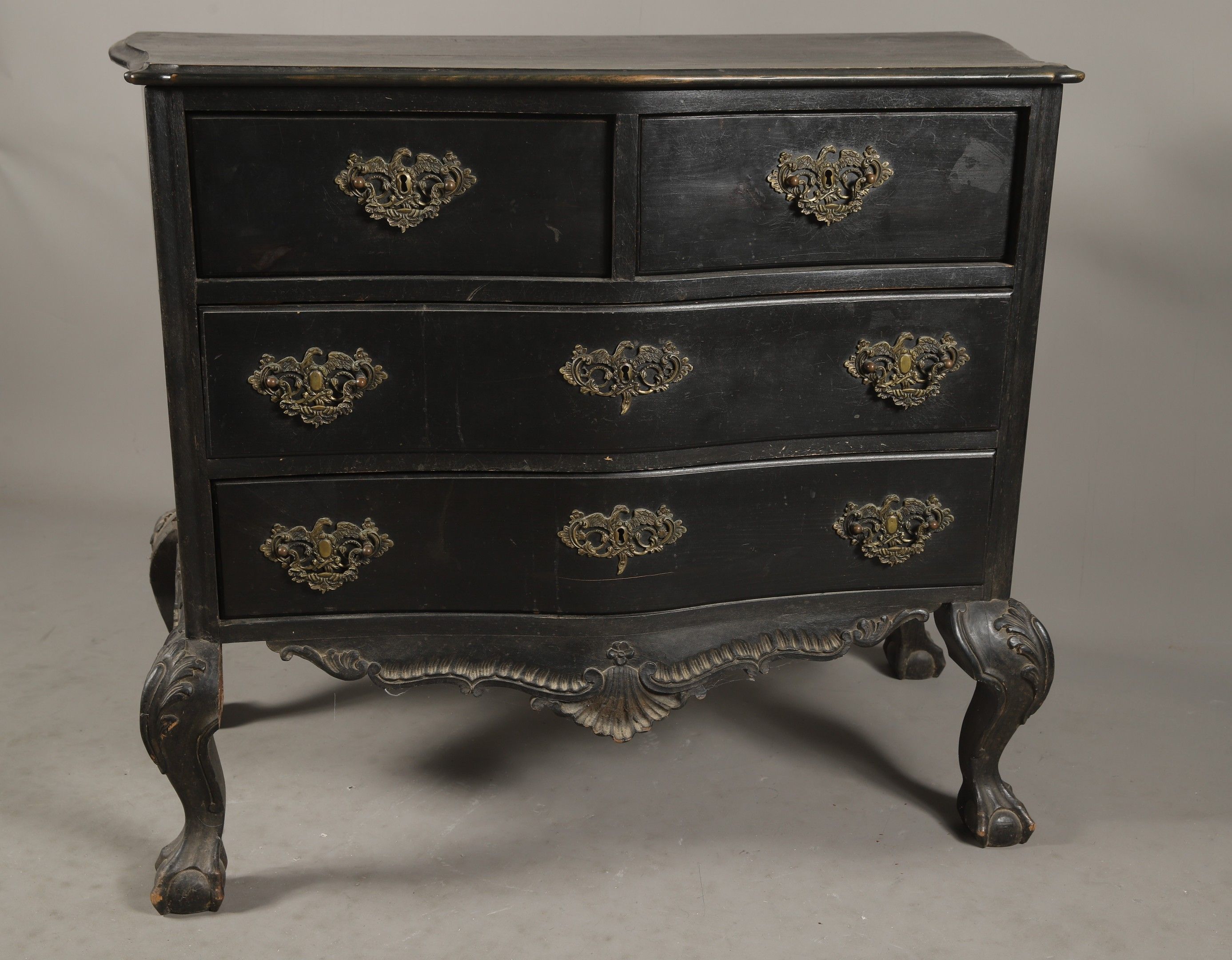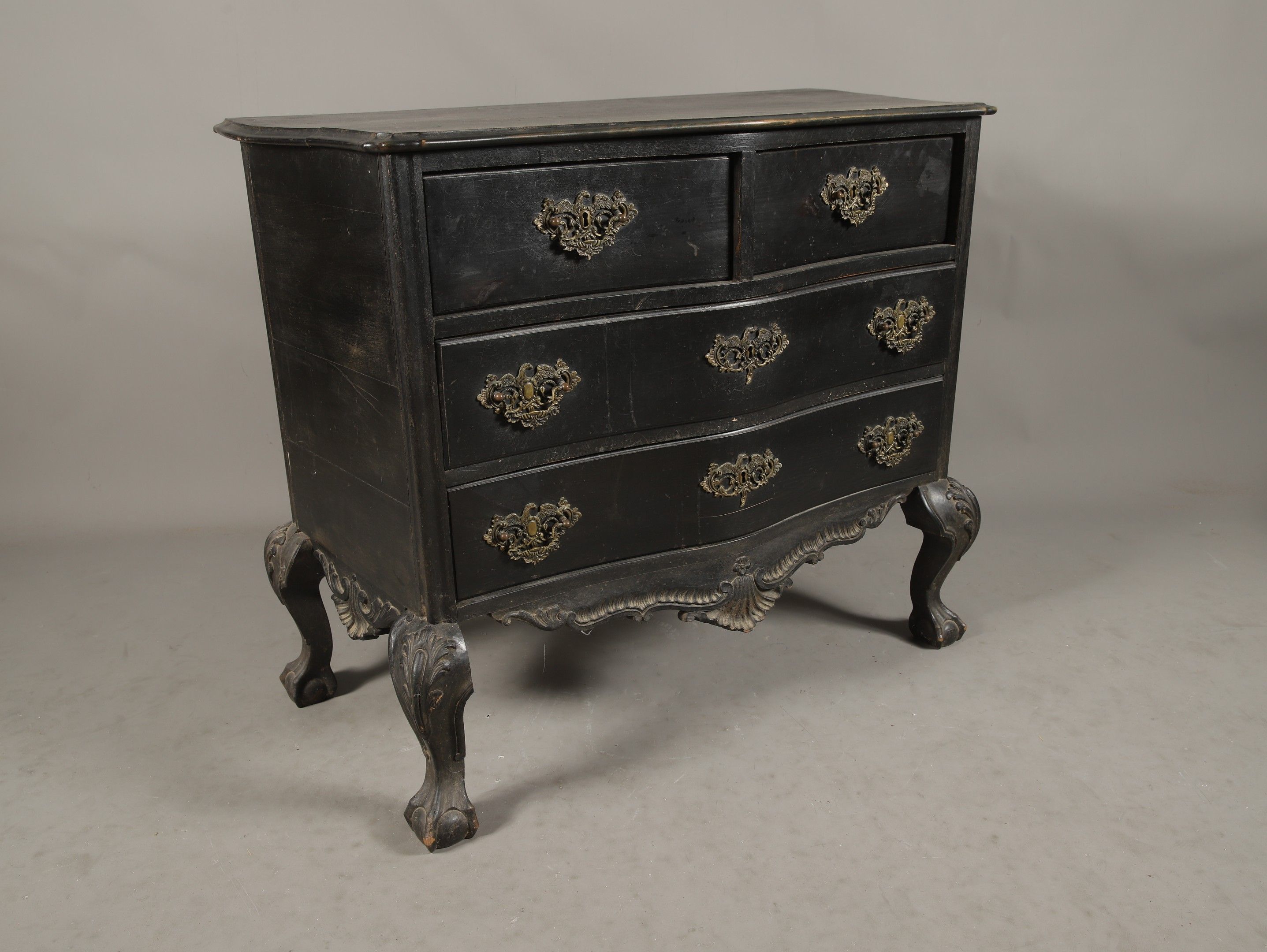 Baroque-style blackened wood PORTUGUESE COMMODE with curved front opening to 4 drawers in three rows, curved apron on curved claw and sphere feet. 90 x 101 x 53 cm