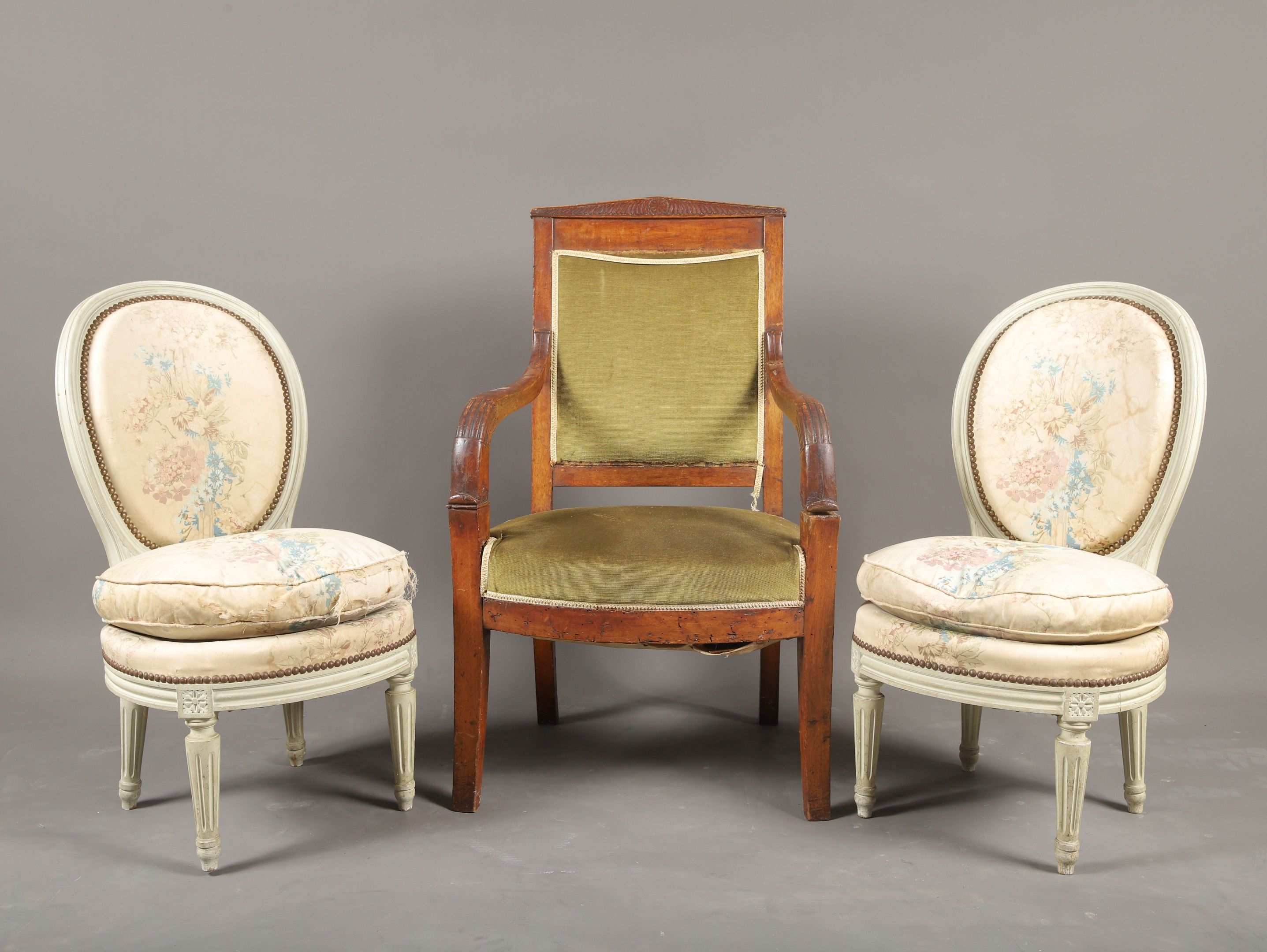 Restoration period moulded and carved ntaurel wood flat-back armchair (H: 96 cm) and pair of Louis XVI style light green lacquered cabriolet armchairs with checks.