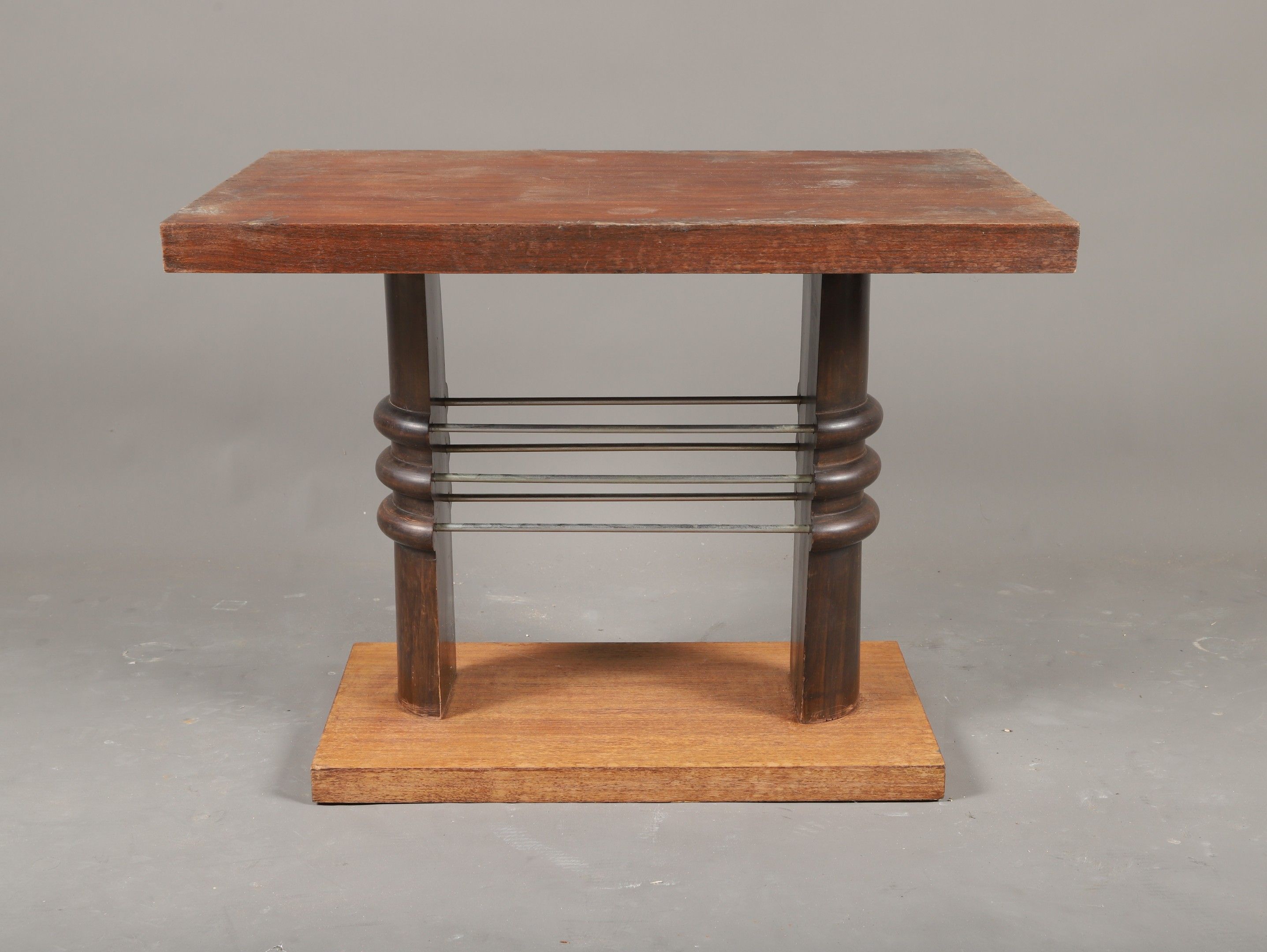 Teak veneered SALON TABLE circa 1970, blackened wood upright…