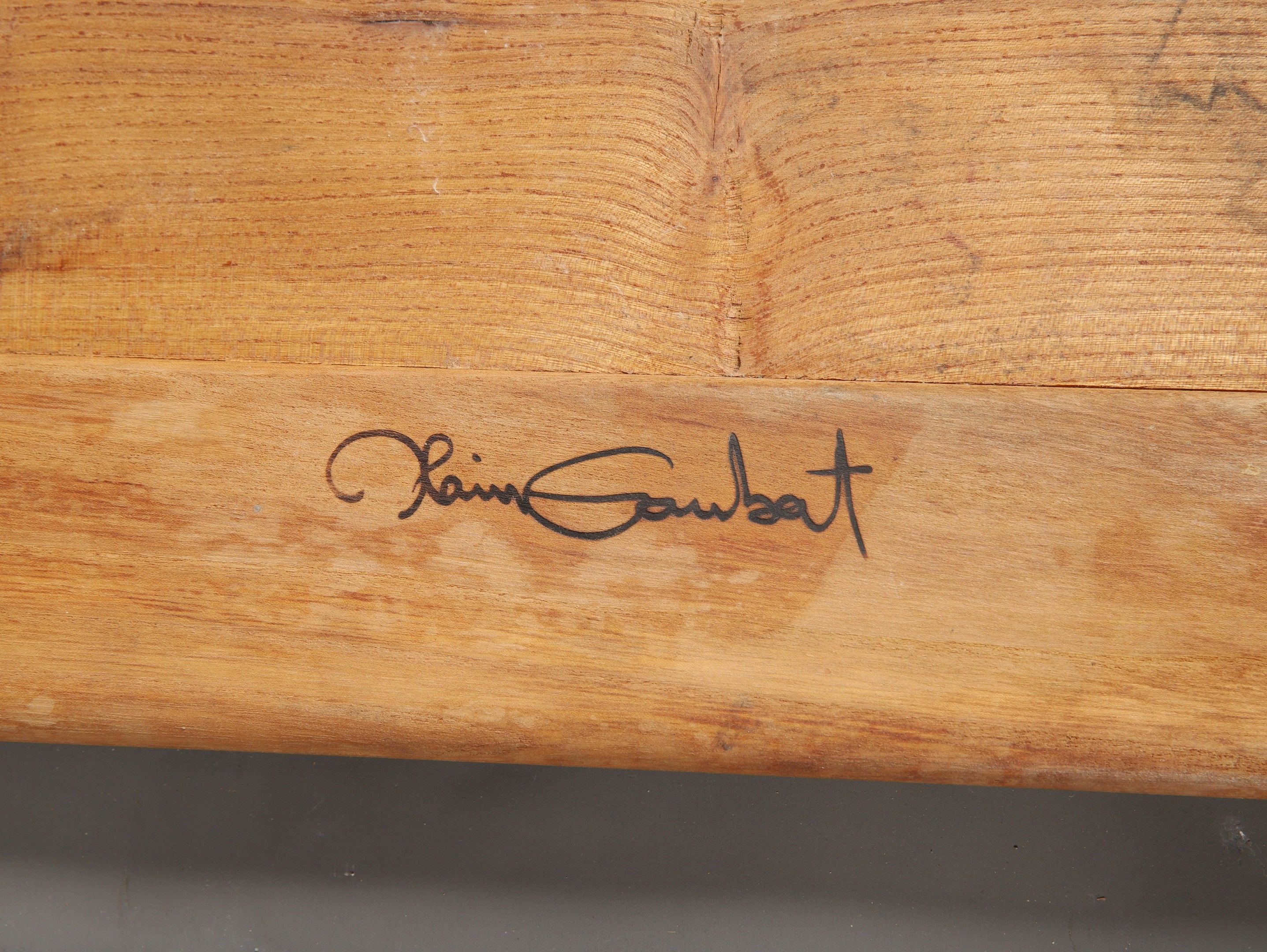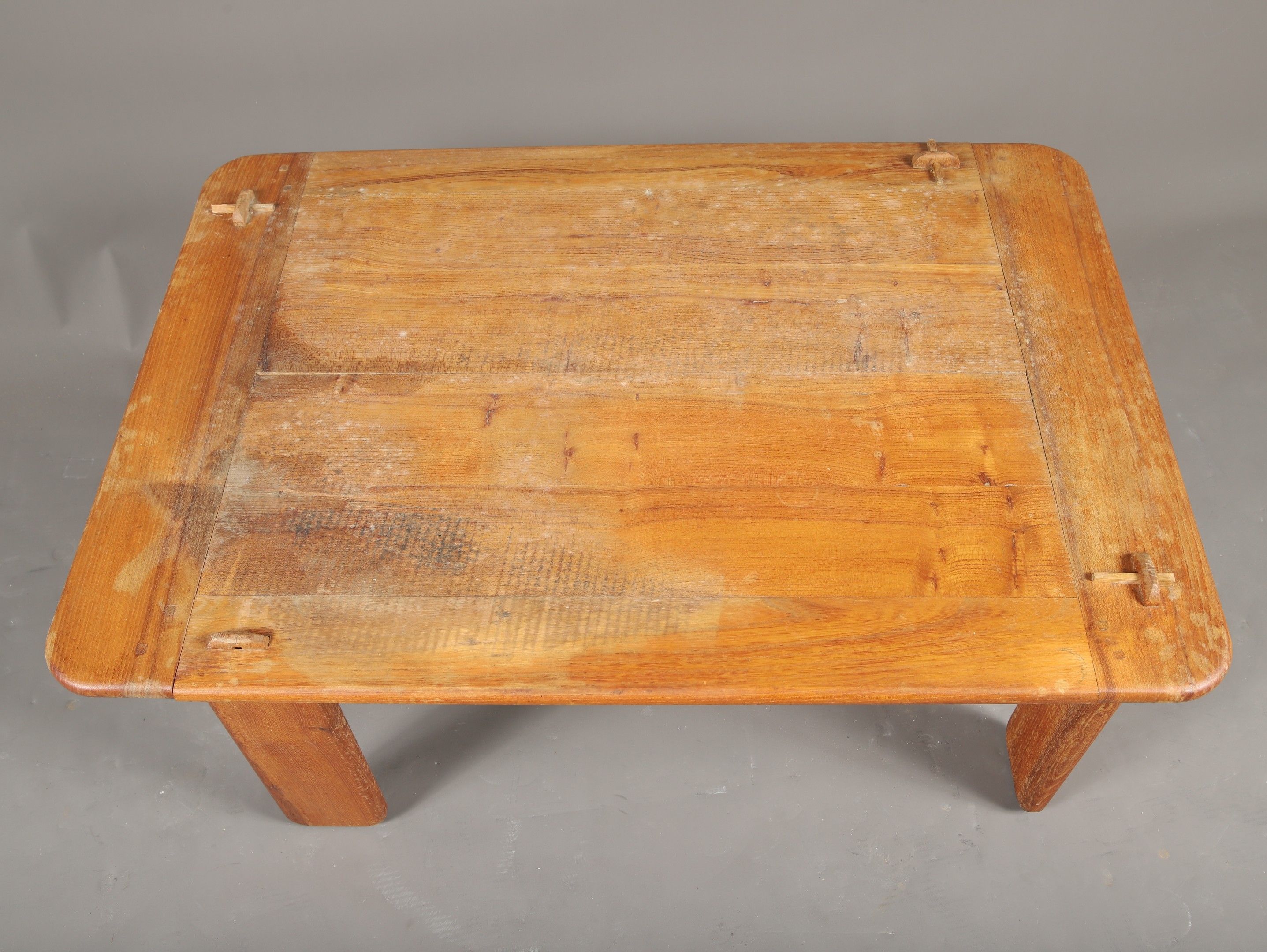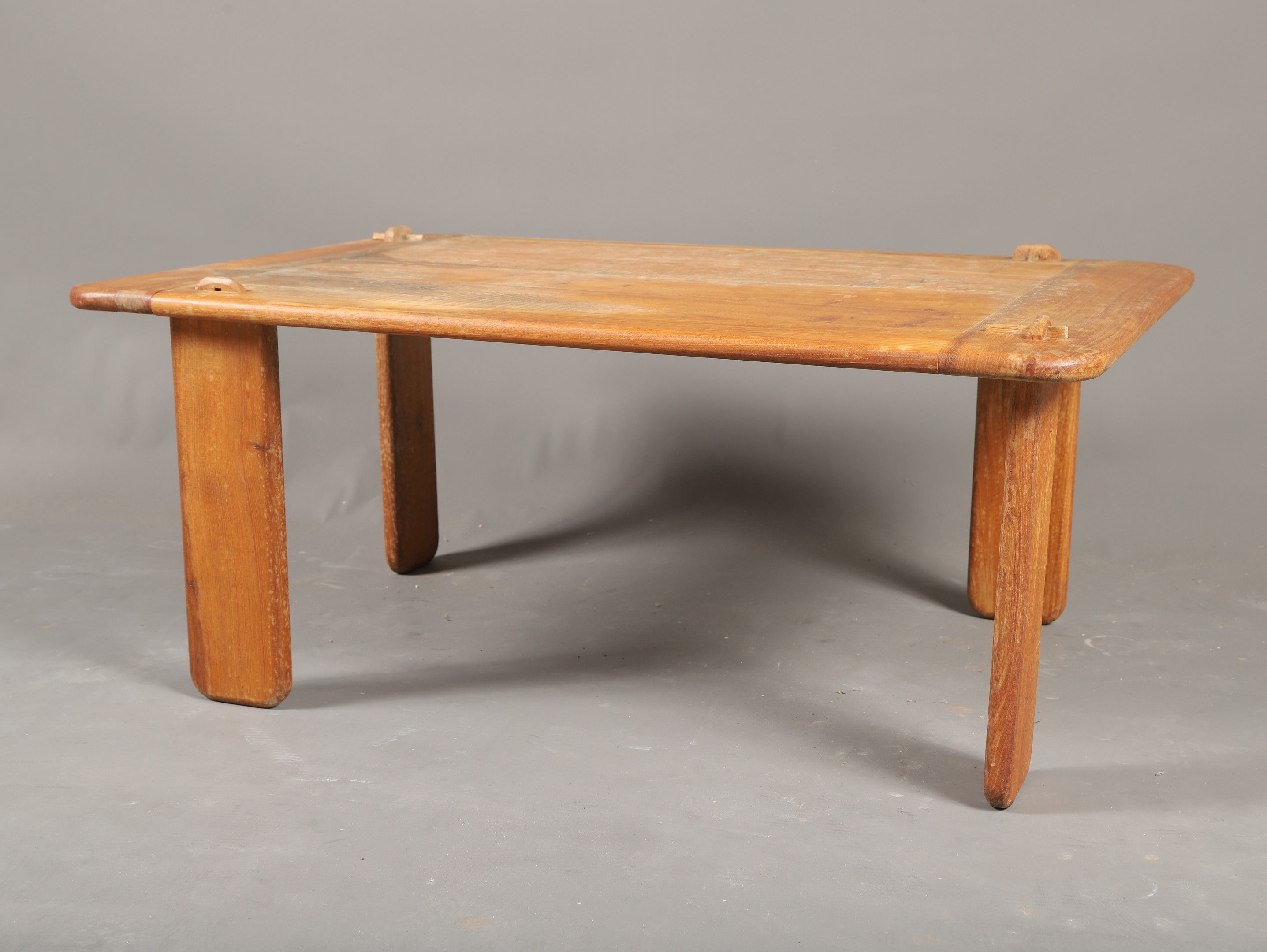 Alain GAUBERT (Ateliers de Marolles). RECTANGULAR LOW TABLE in natural wood, blade-shaped legs and asymmetrical brackets. Signed. 42 x 97 x 68 cm