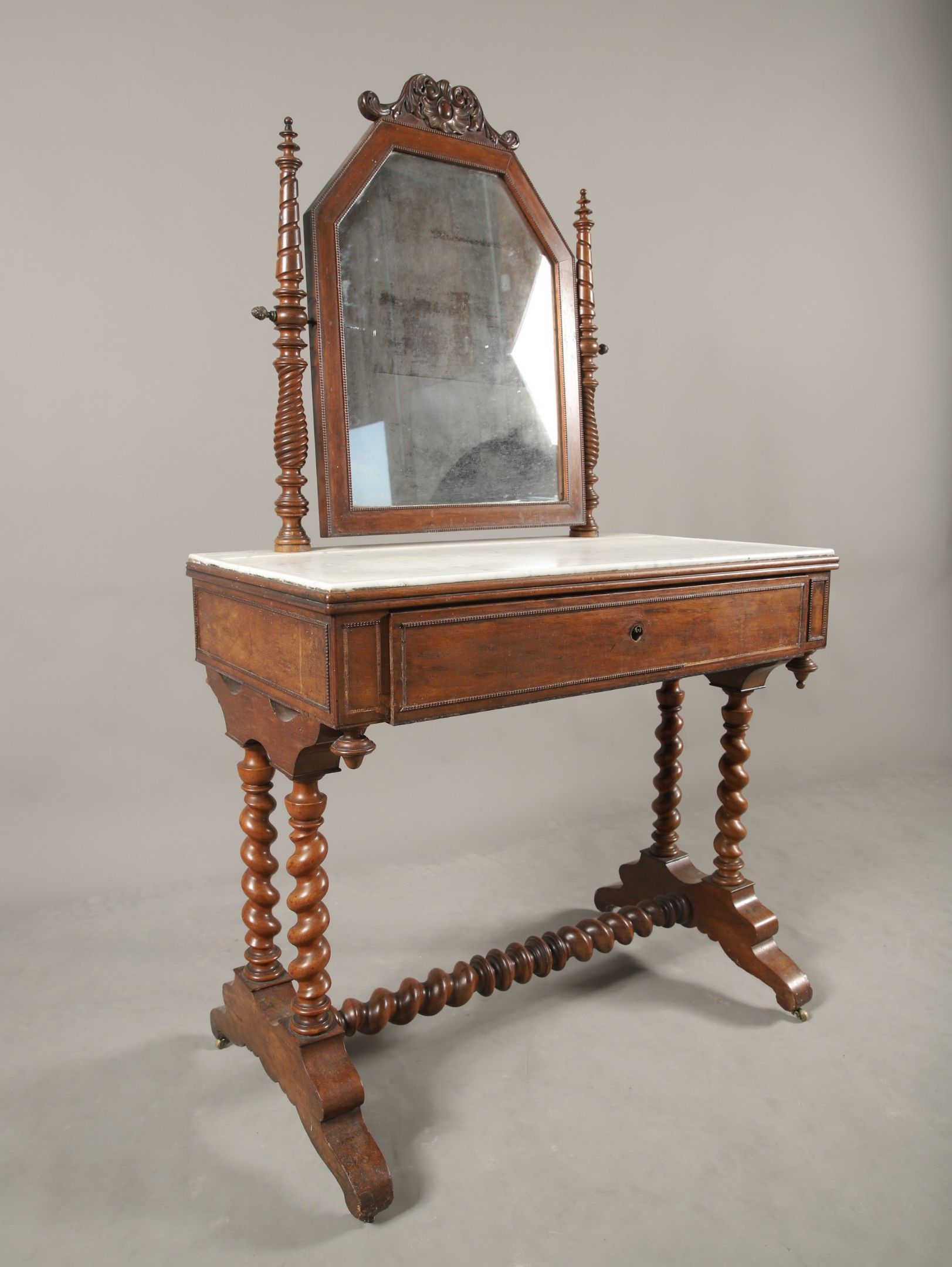 Louis-Philippe period TOILETTE in carved and guilloché mahogany and mahogany veneer opening to a drawer in the waist, twisted uprights on a base with braces, white marble top. 141 x 81 x 47 cm (missing)