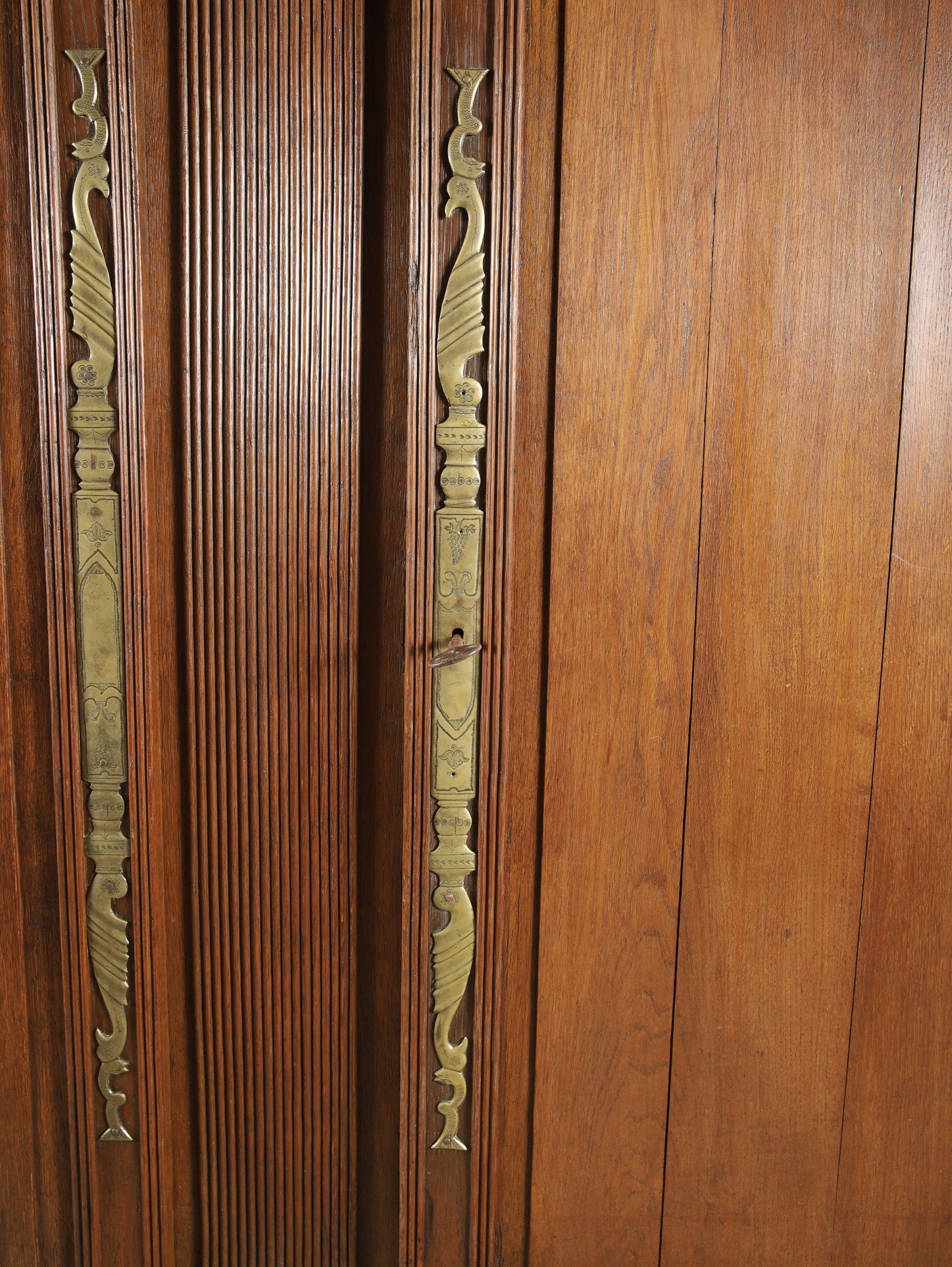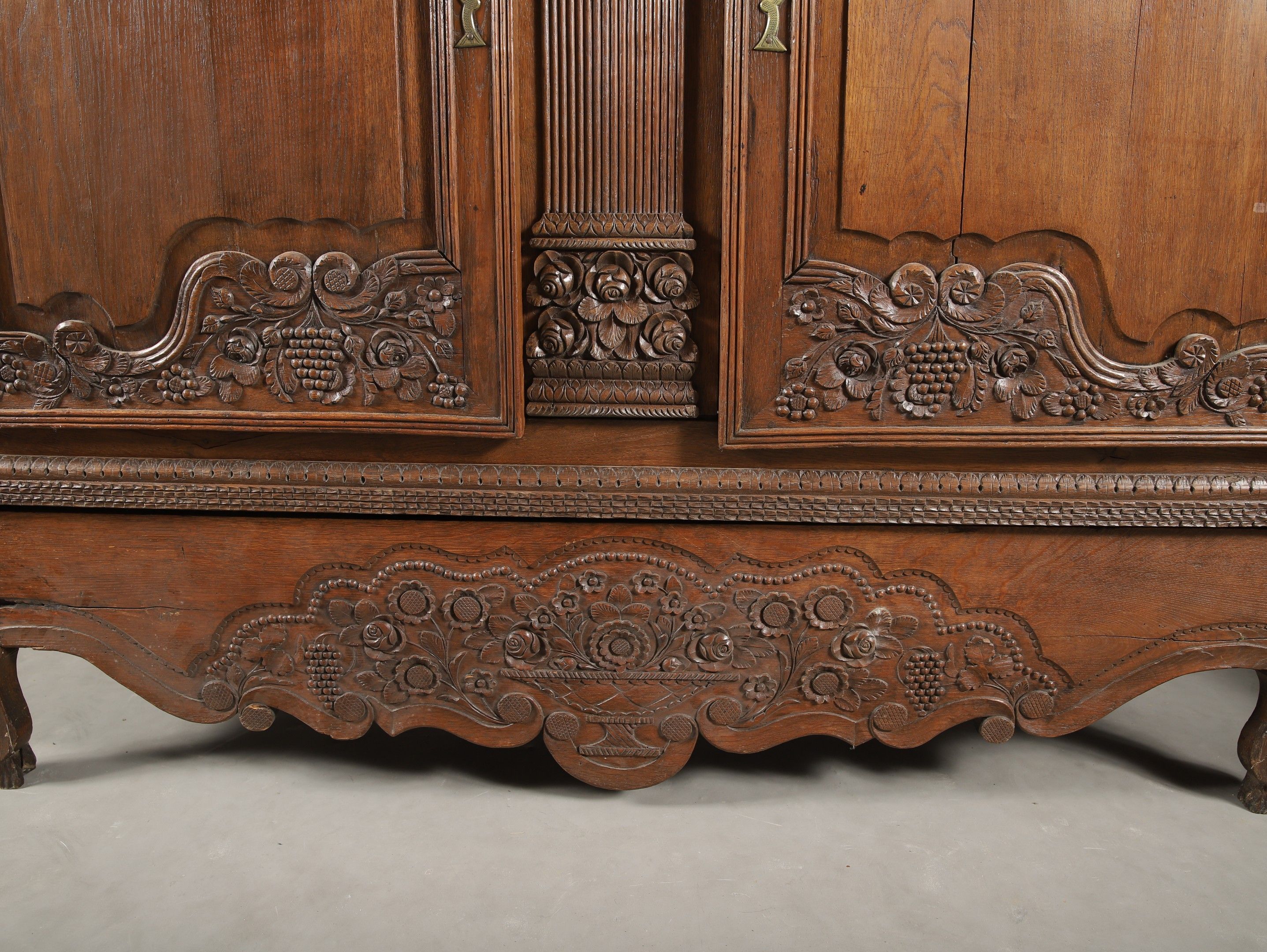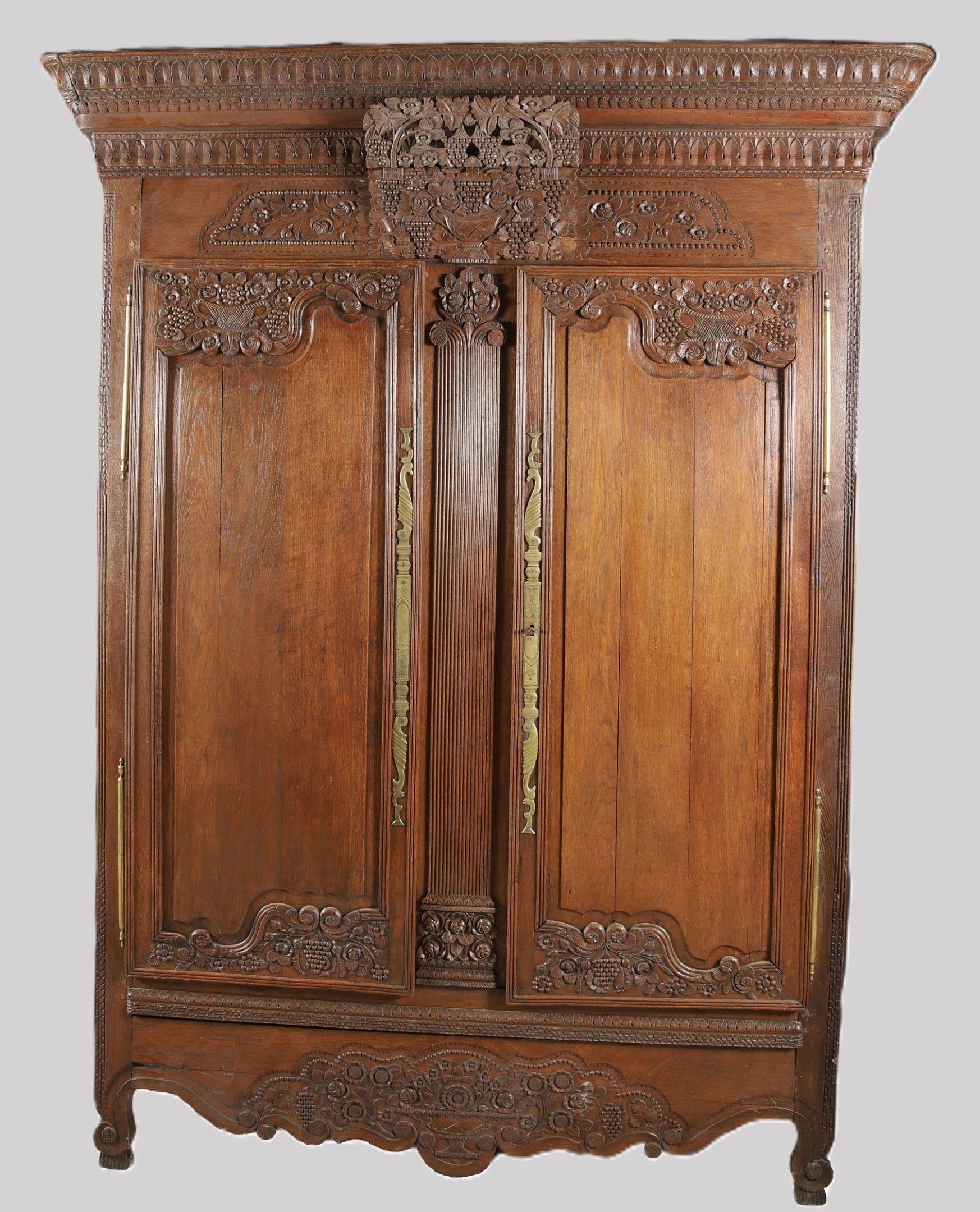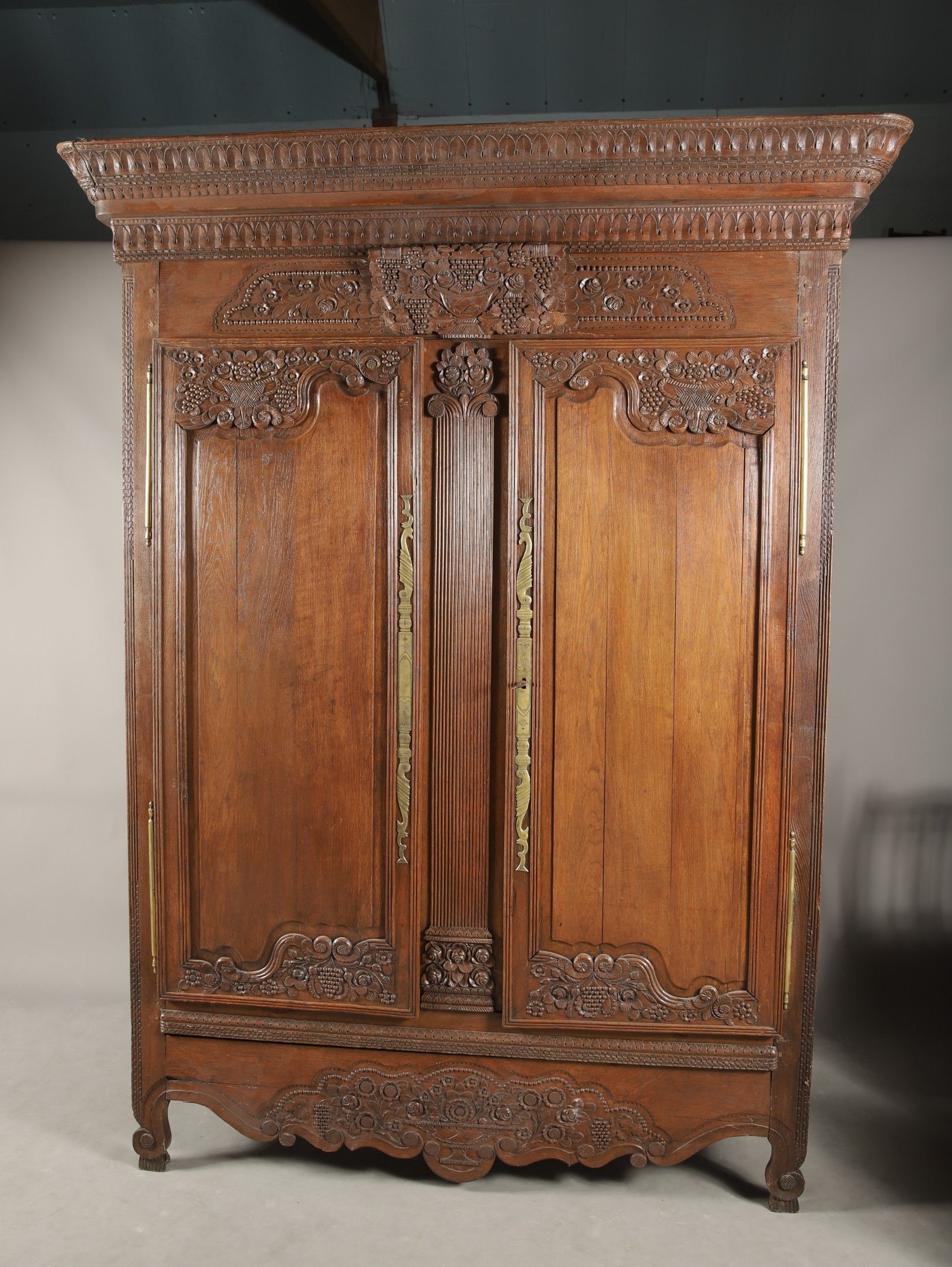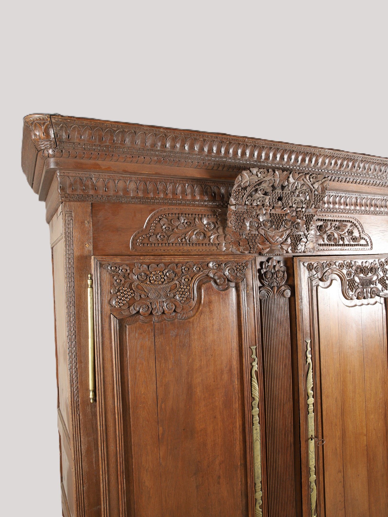 CHERBOURG CABINET in moulded and carved oak with meplat decoration of pampers and flowered baskets from the first half of the 19th century, opening with fluted pilaster central doorframe above a drawer housed in the curved apron, scrolled front legs, entablature decorated with a frieze echoing the cornice. Brass insert from Villedieu-les-Poêles. 230 x 170 x 60 cm