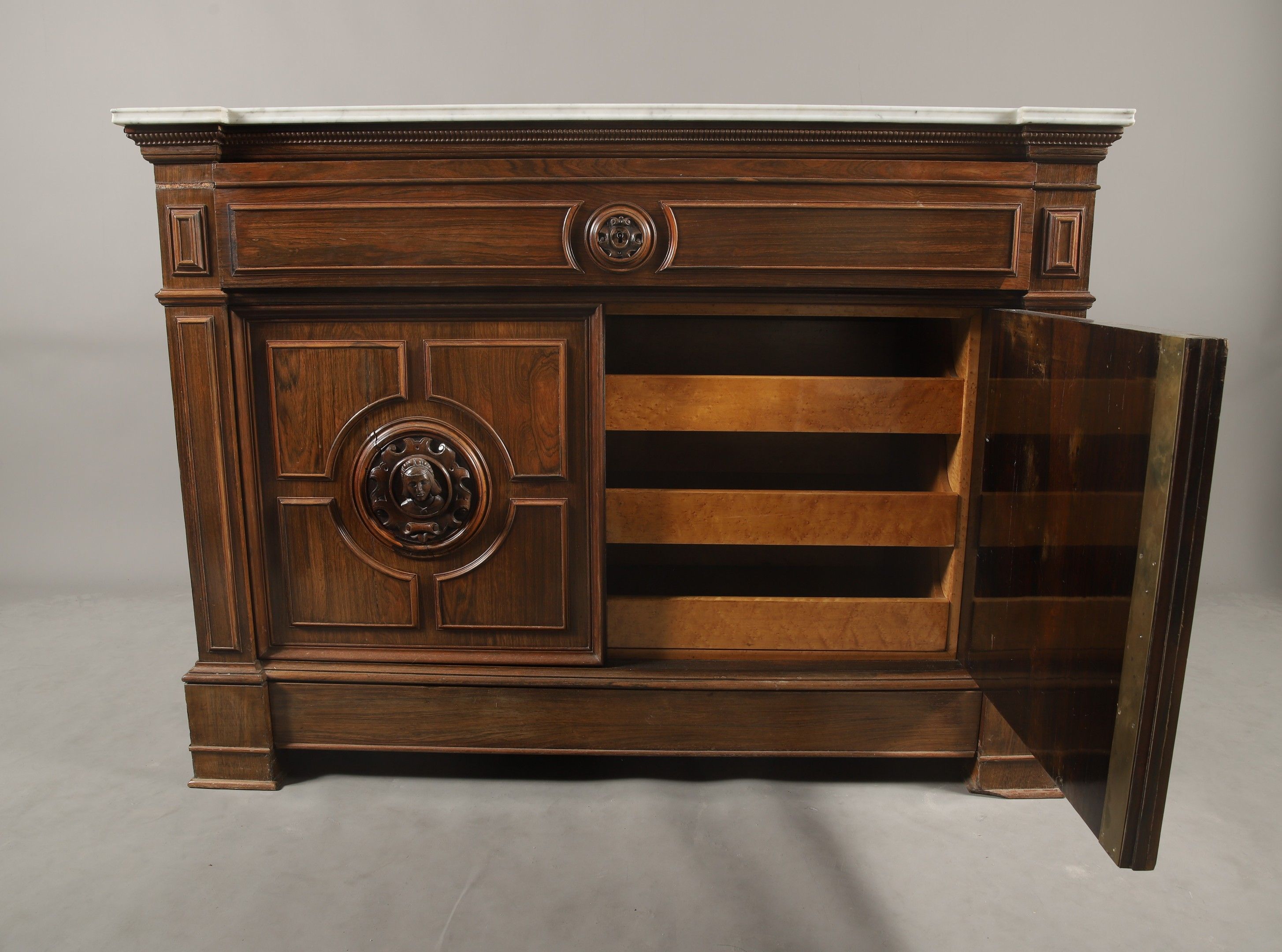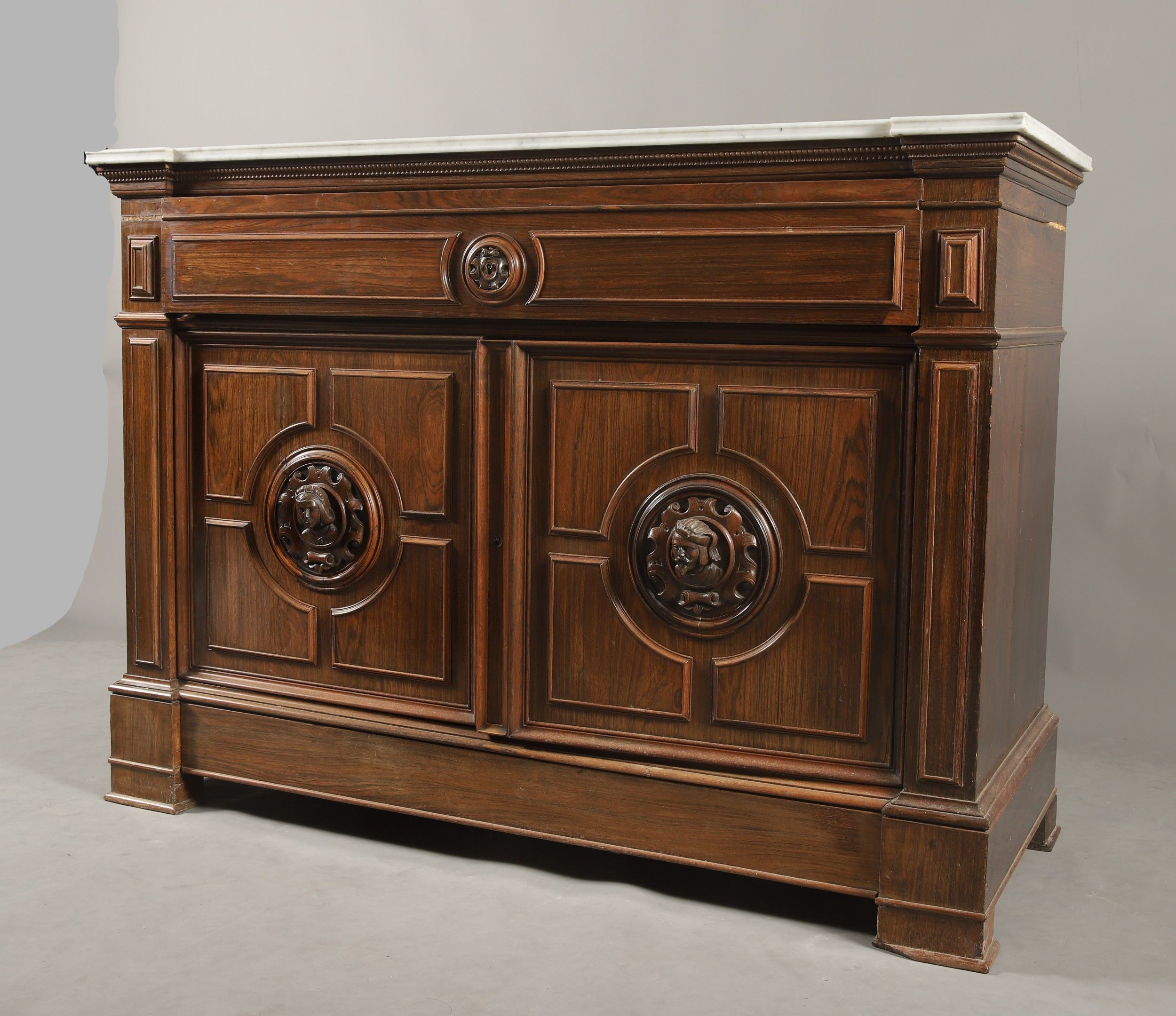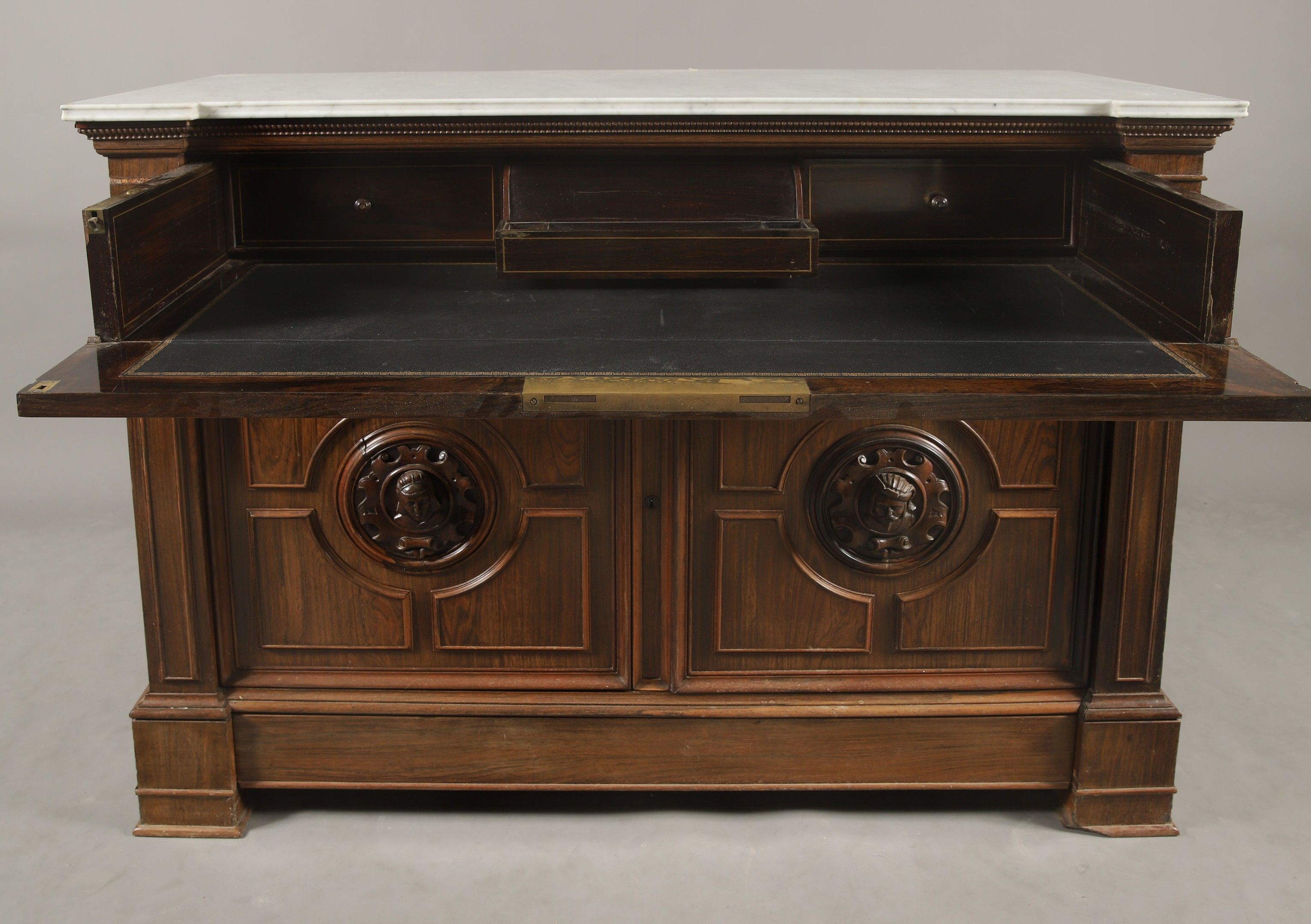 Louis-Philippe period moulded and carved rosewood and rosewood veneer SECRETARY COMMODE opening to a dark green leather flap drawer adorned with hot stamping revealing an interior with a writing desk and two drawers, two leaves revealing a flamed maple veneered interior with three English-style drawers and a drawer in the lower part. Pilaster jambs decorated with a troubadour style pair of busts in high relief in the style of the Middle Ages. Veined white marble top. 99 x 136 x 58 cm (missing)