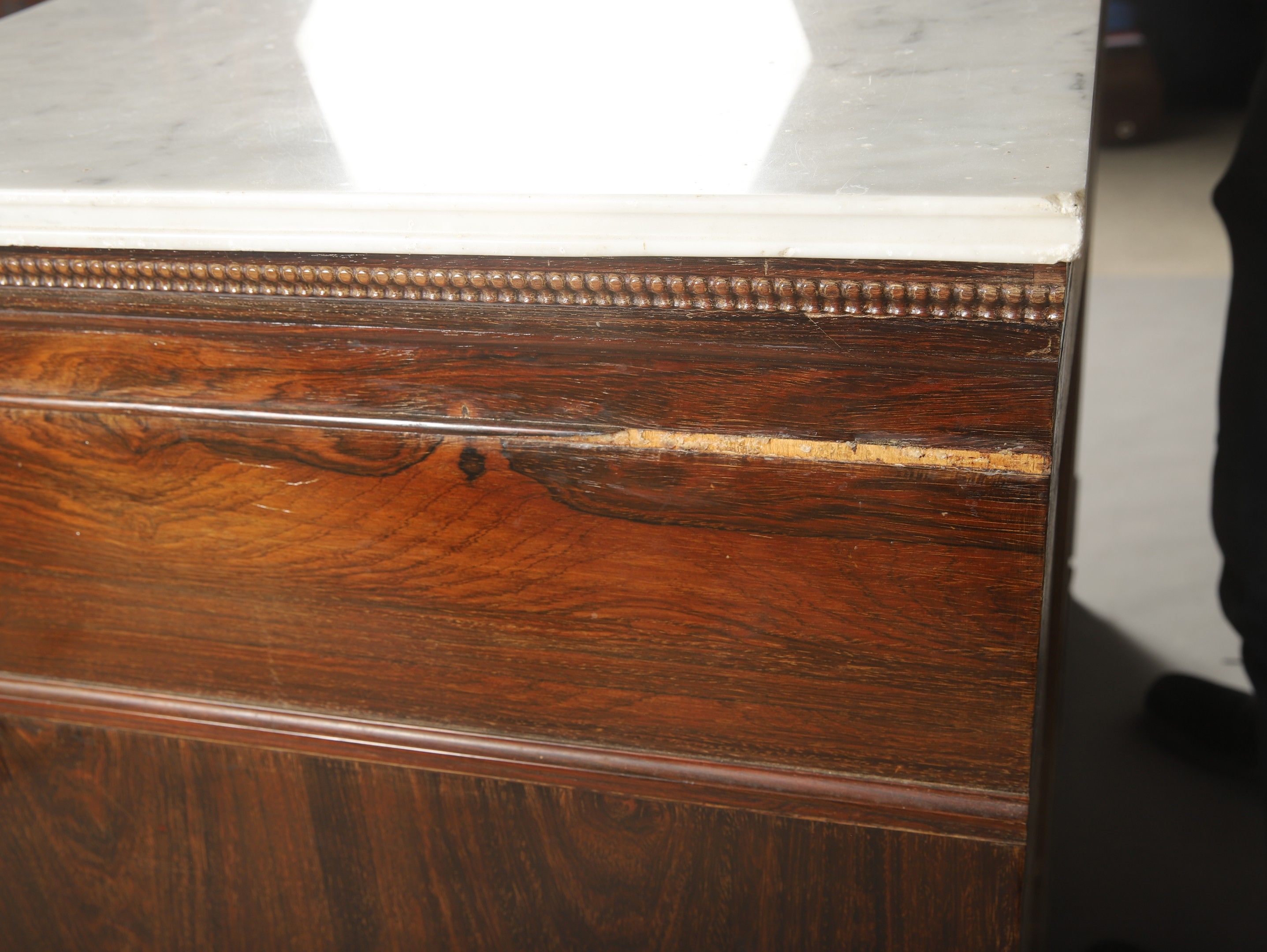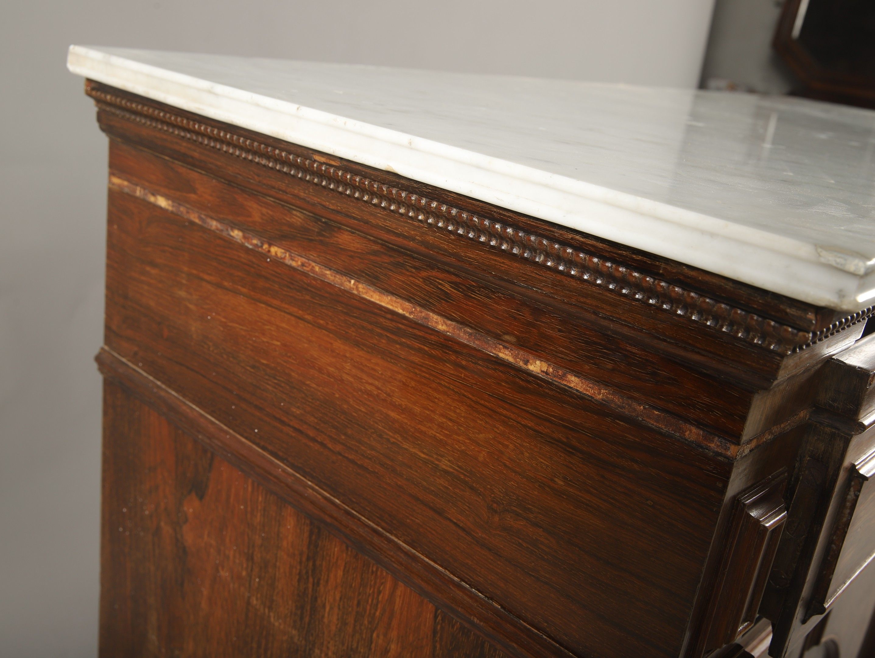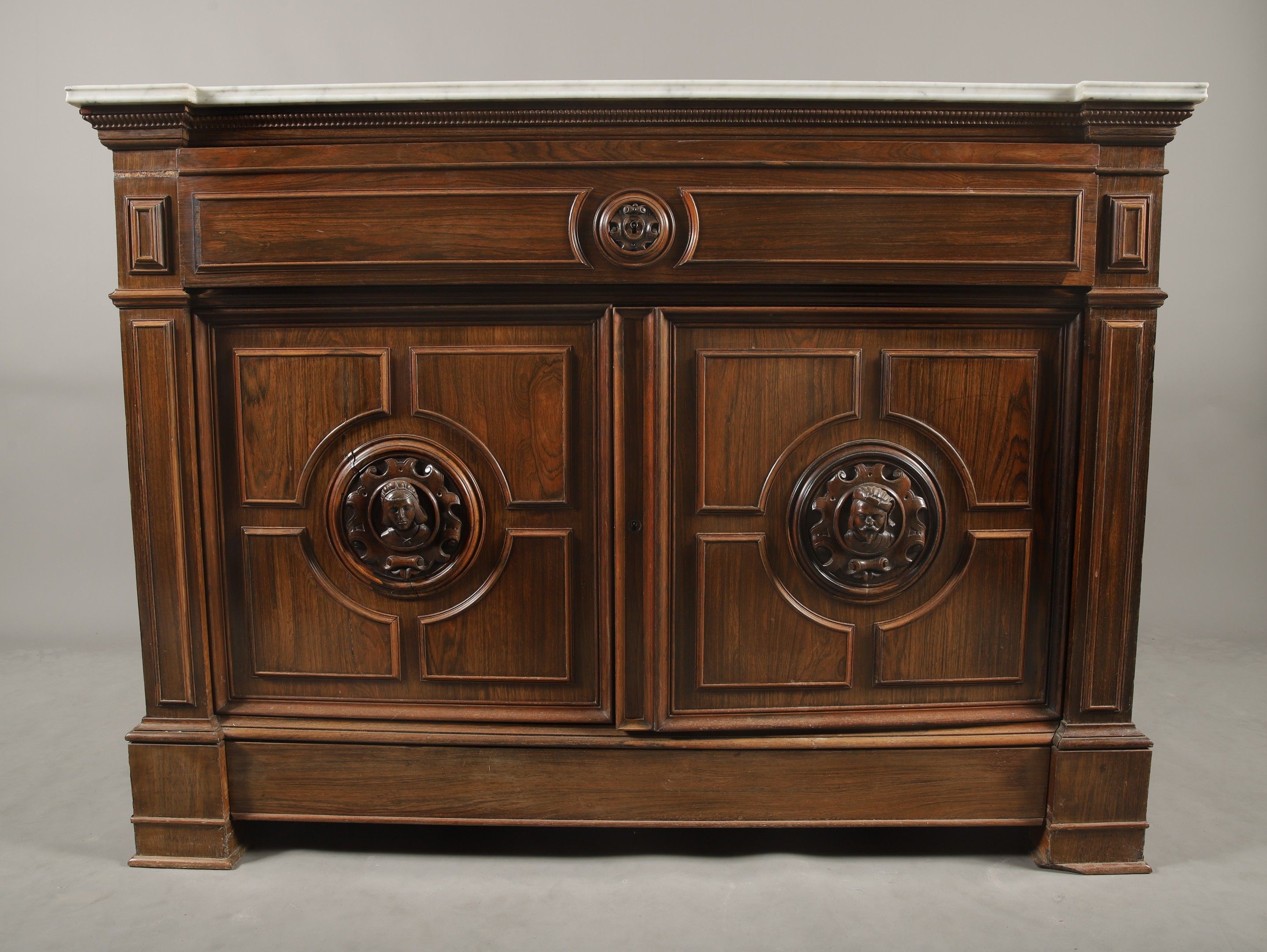 Louis-Philippe period moulded and carved rosewood and rosewood veneer SECRETARY COMMODE opening to a dark green leather flap drawer adorned with hot stamping revealing an interior with a writing desk and two drawers, two leaves revealing a flamed maple veneered interior with three English-style drawers and a drawer in the lower part. Pilaster jambs decorated with a troubadour style pair of busts in high relief in the style of the Middle Ages. Veined white marble top. 99 x 136 x 58 cm (missing)