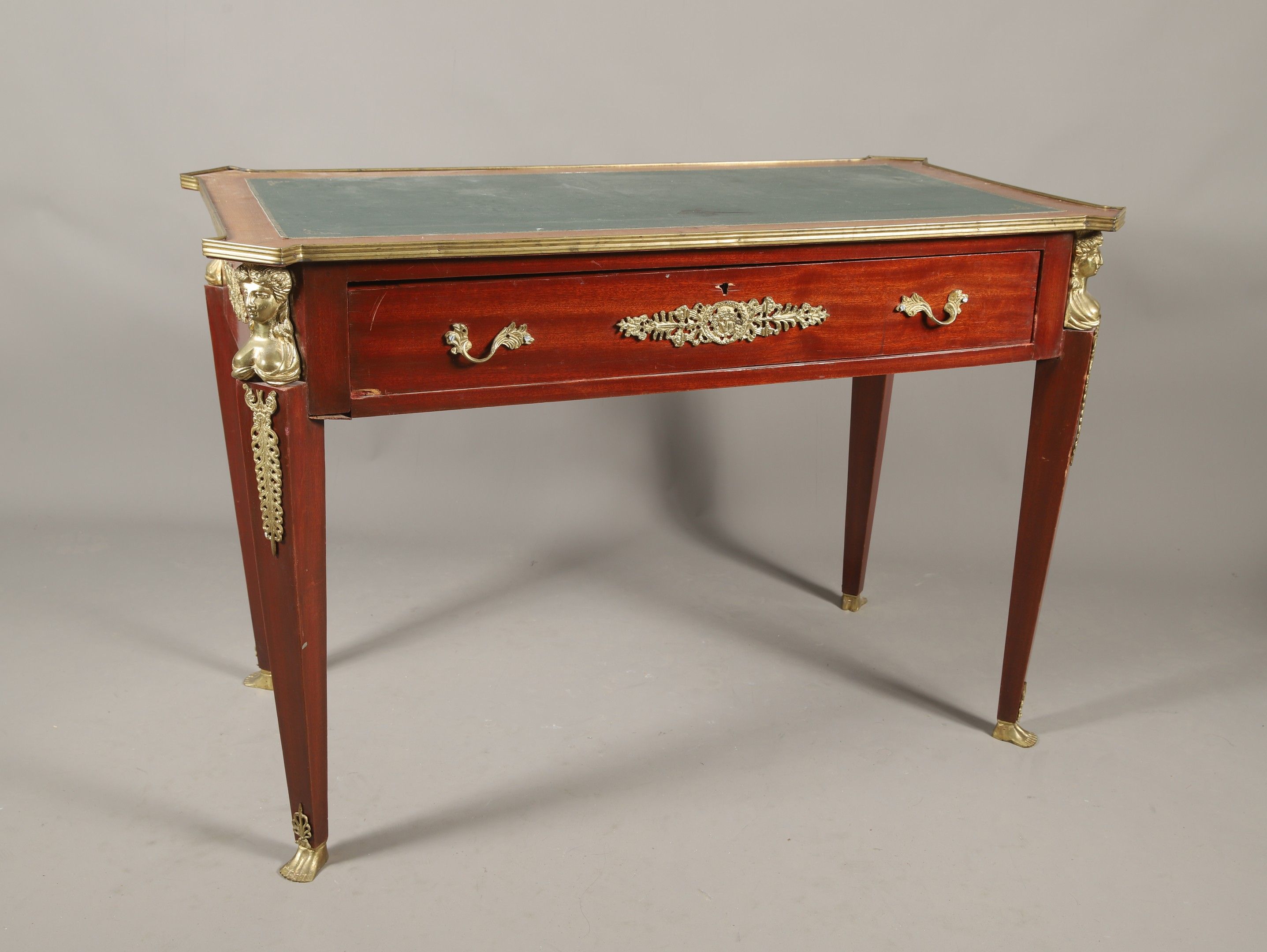 A mahogany and mahogany veneer WRITING TABLE in the Retour d'Egypte style, top darkened with green leather, spandrel feet in the shape of a sheathed sphinx. 81 x 120 x 63.5 cm (accidents)