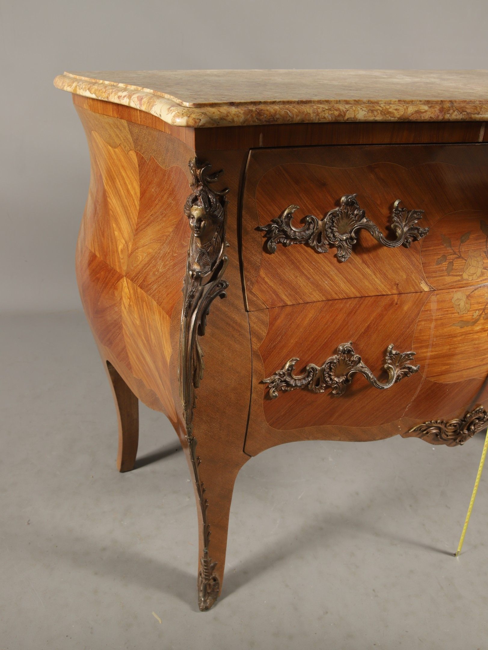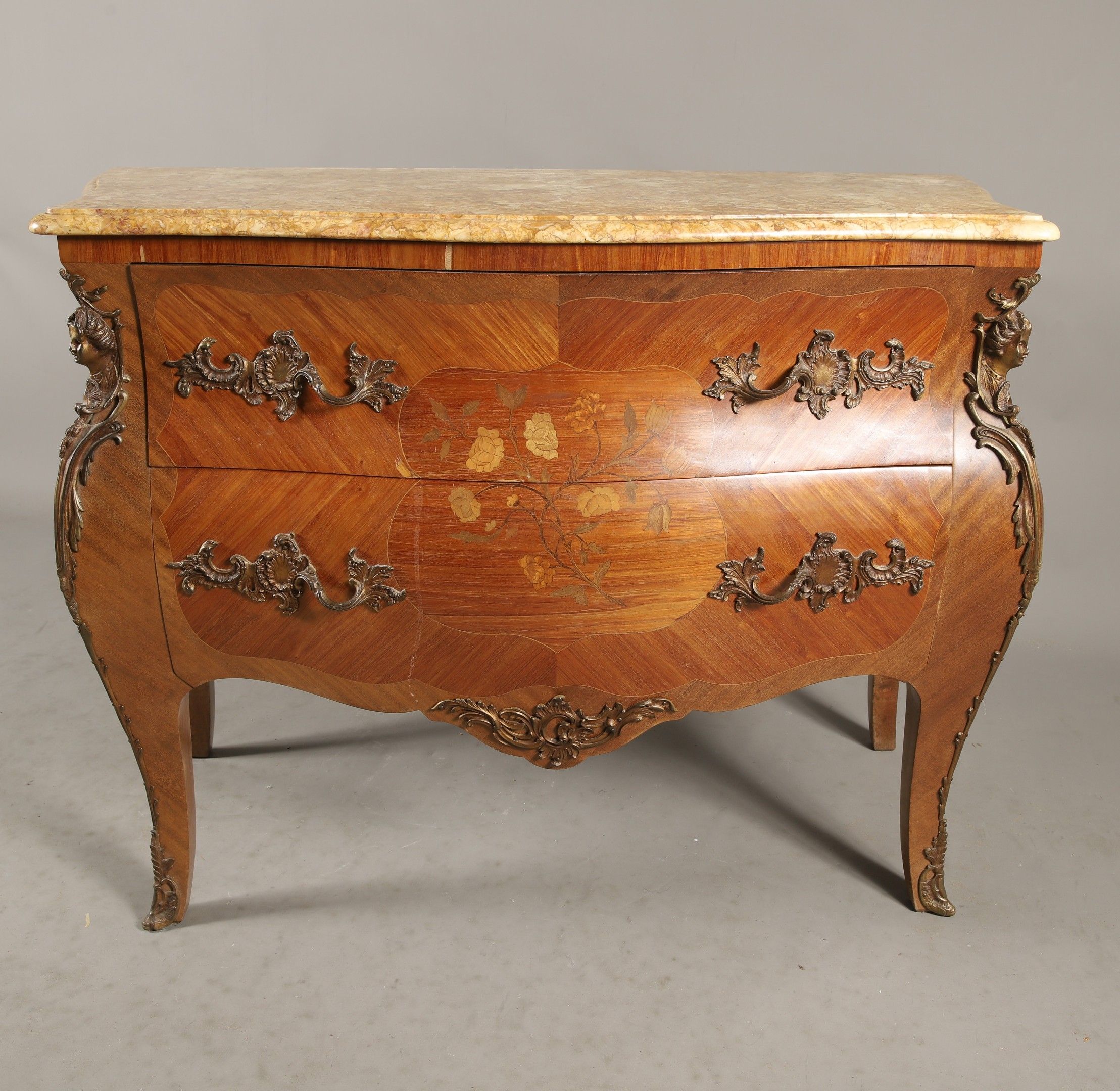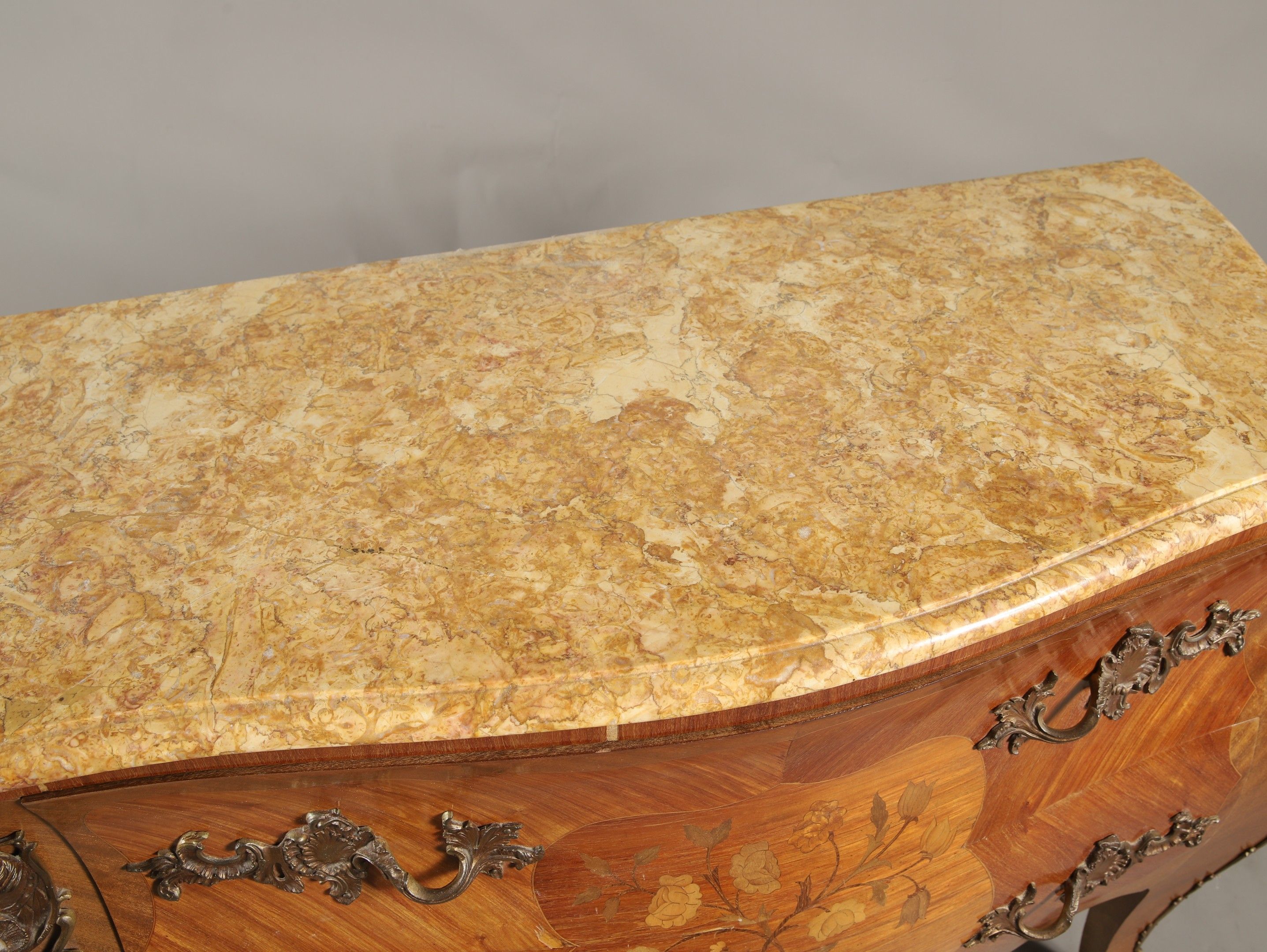 A Louis XV style curved commode with two drawers and no crossbeam. Rosewood frieze and flower marquetry in amaranth and maple fillet frames. Bronze ornamentation: espagnolette falls, rocaille handles and apron. 88 x 119 x 53 cm