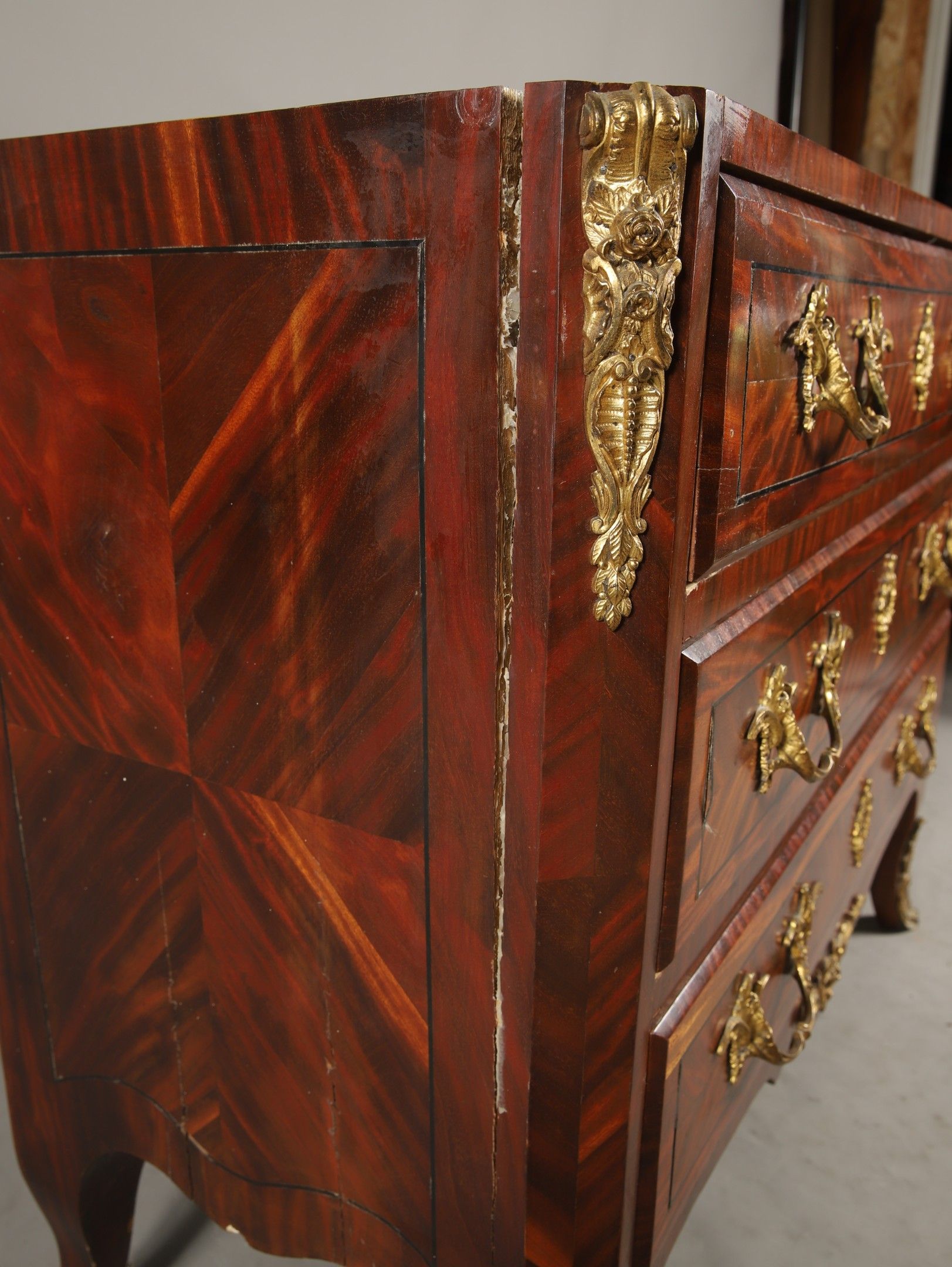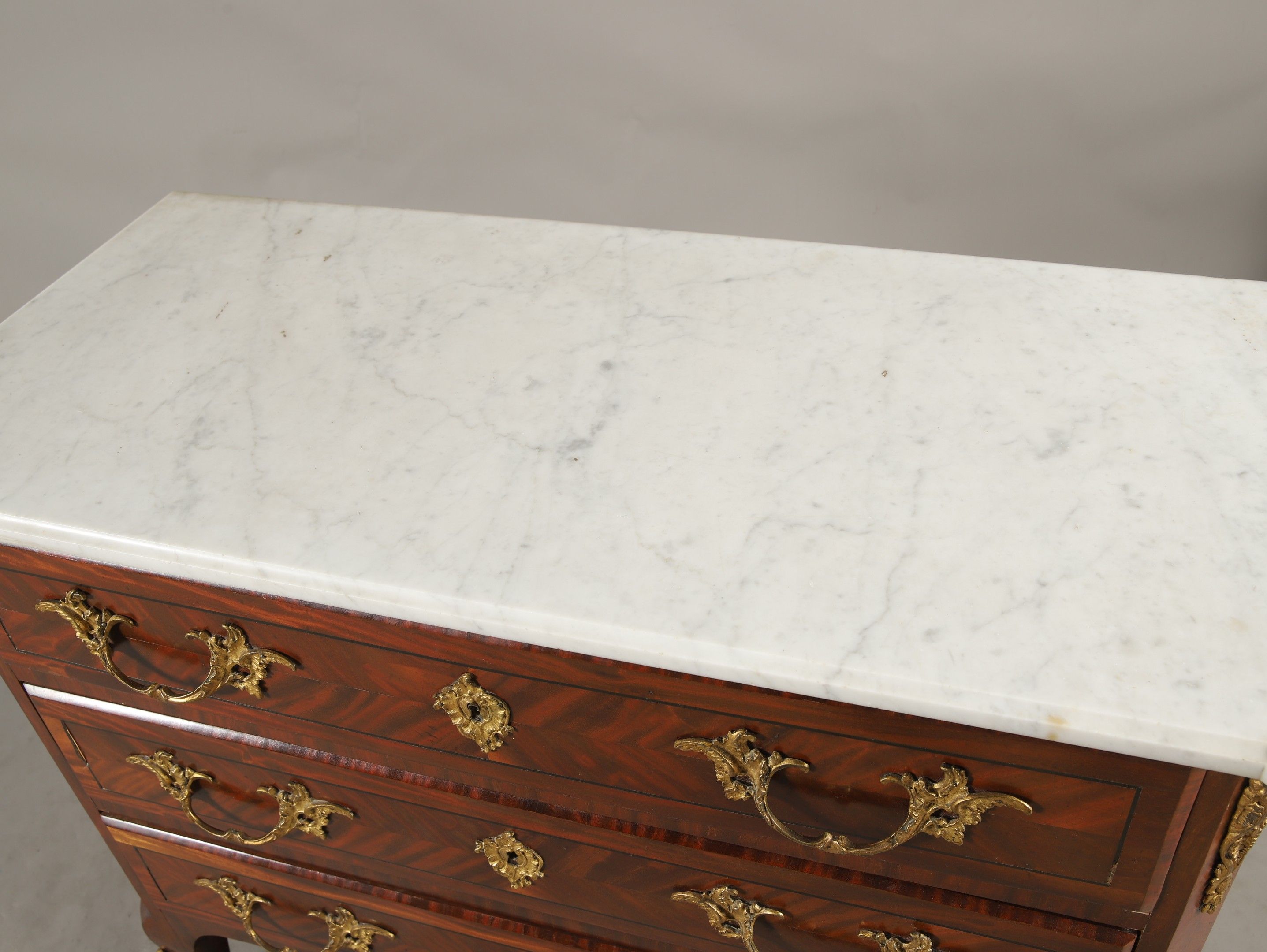 RECTANGULAR STYLE TRANSITION CABINET stamped EV, opening to three drawers, Napoleon III period, rosewood frieze in blackened wood fillets, curved legs, white marble top. 86 x 107 x 49 cm (accident on the left side, crack on the right side and veneering accidents).