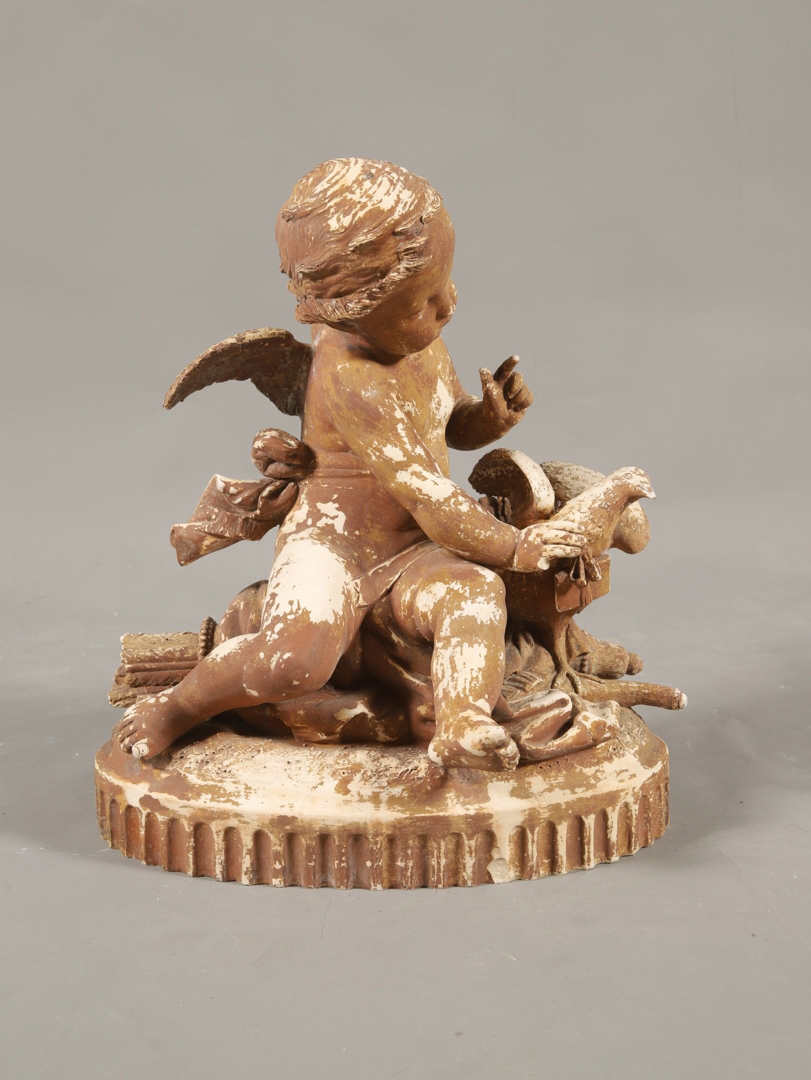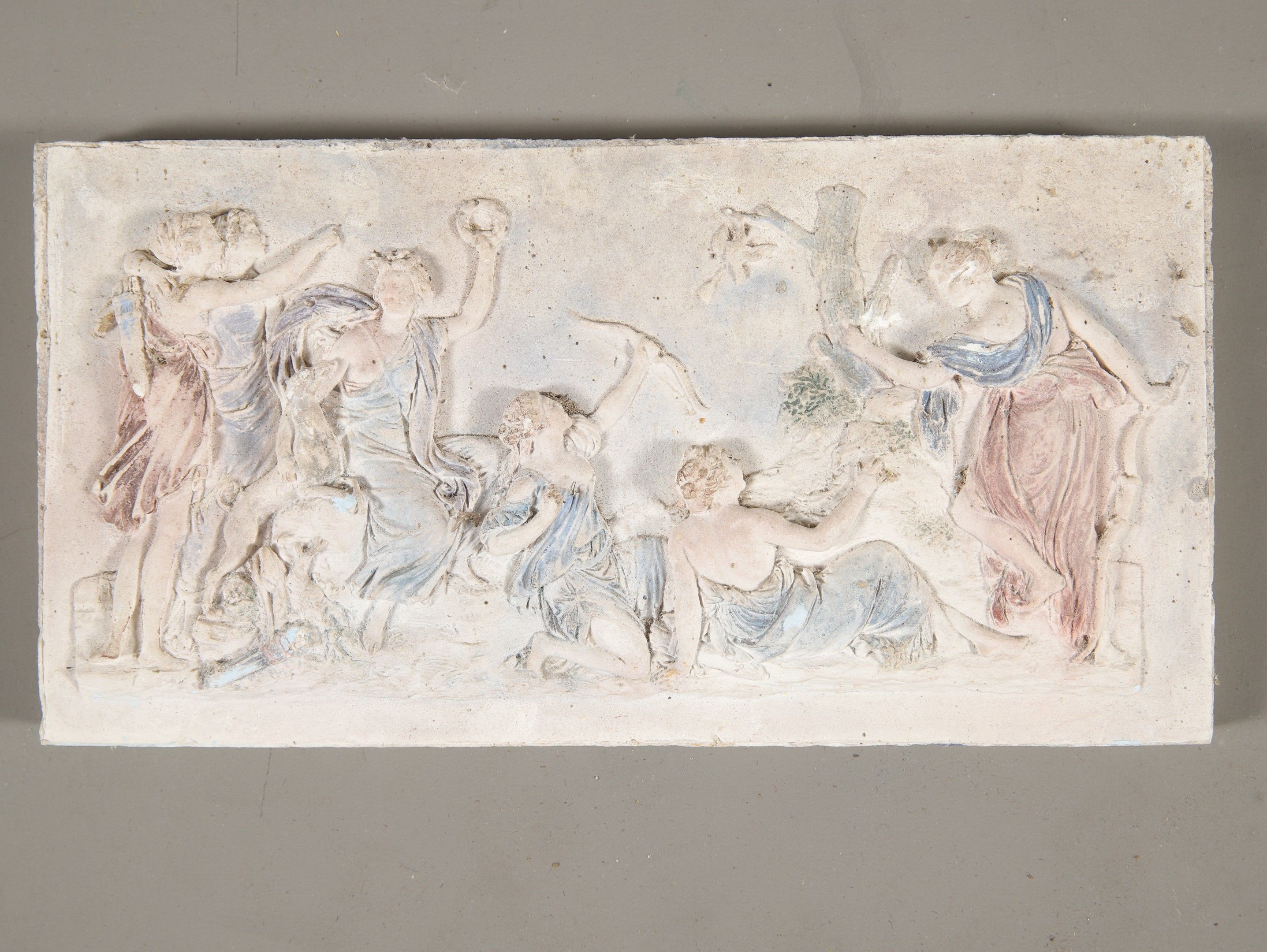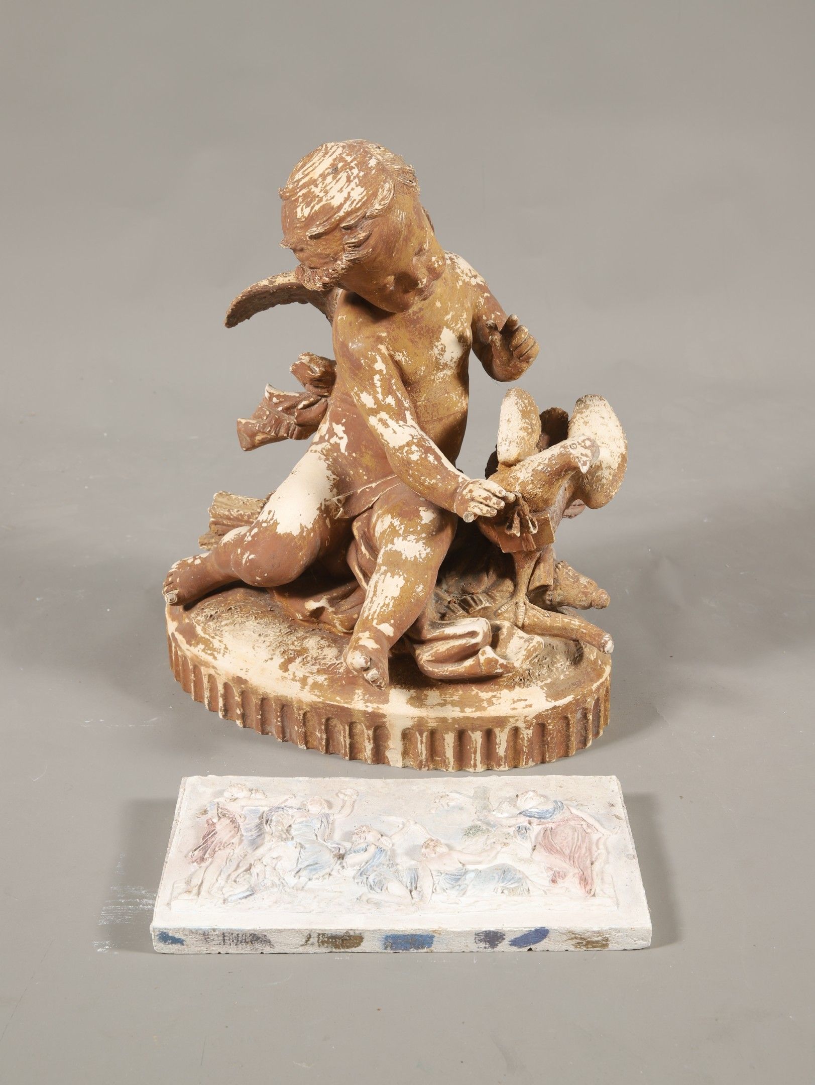 Jean-Baptiste LEBROC (1825-1870). Love with a dove. Patinated plaster signed. H: 42 cm (one wing glued back) // Bas-relief of Diana and her retinue. W: 30 cm