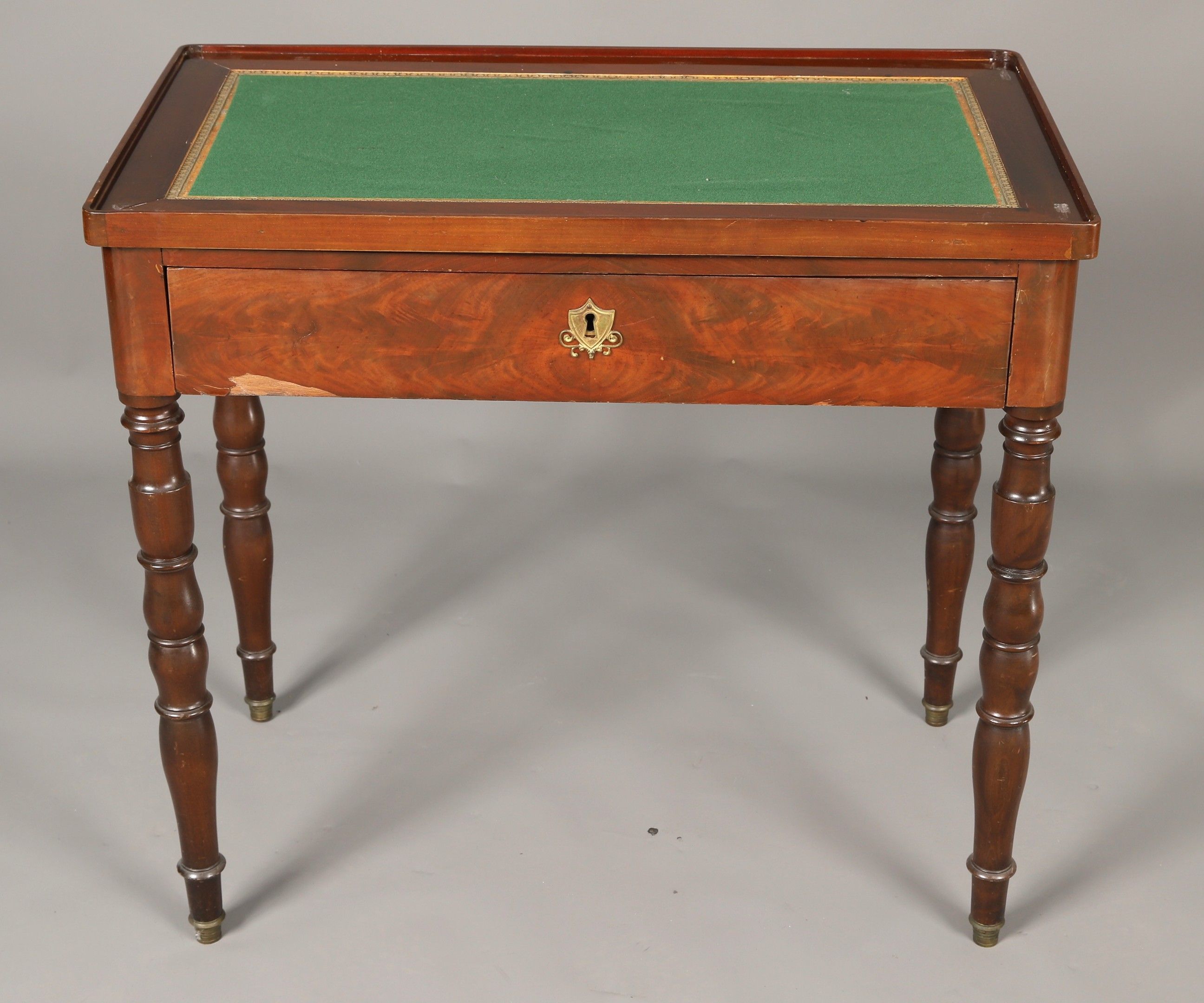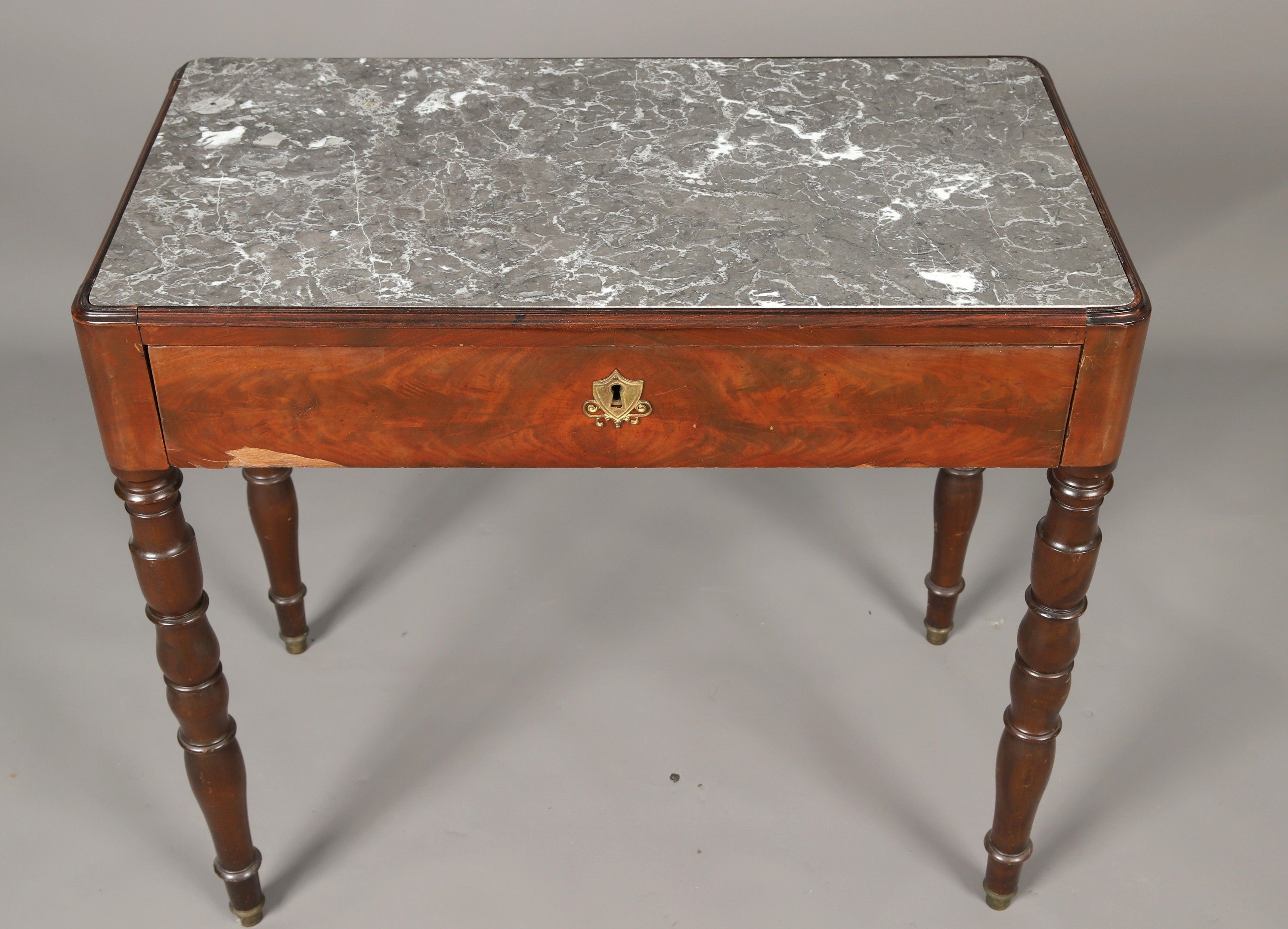 Restoration period mahogany and mahogany veneer DOUBLE-SIDED MOBILE PLATE TABLE opening to a drawer, baluster legs. Dark green leather and felt top resting on a grey marble seat. 73 x 79 x 44 cm (veneer missing)