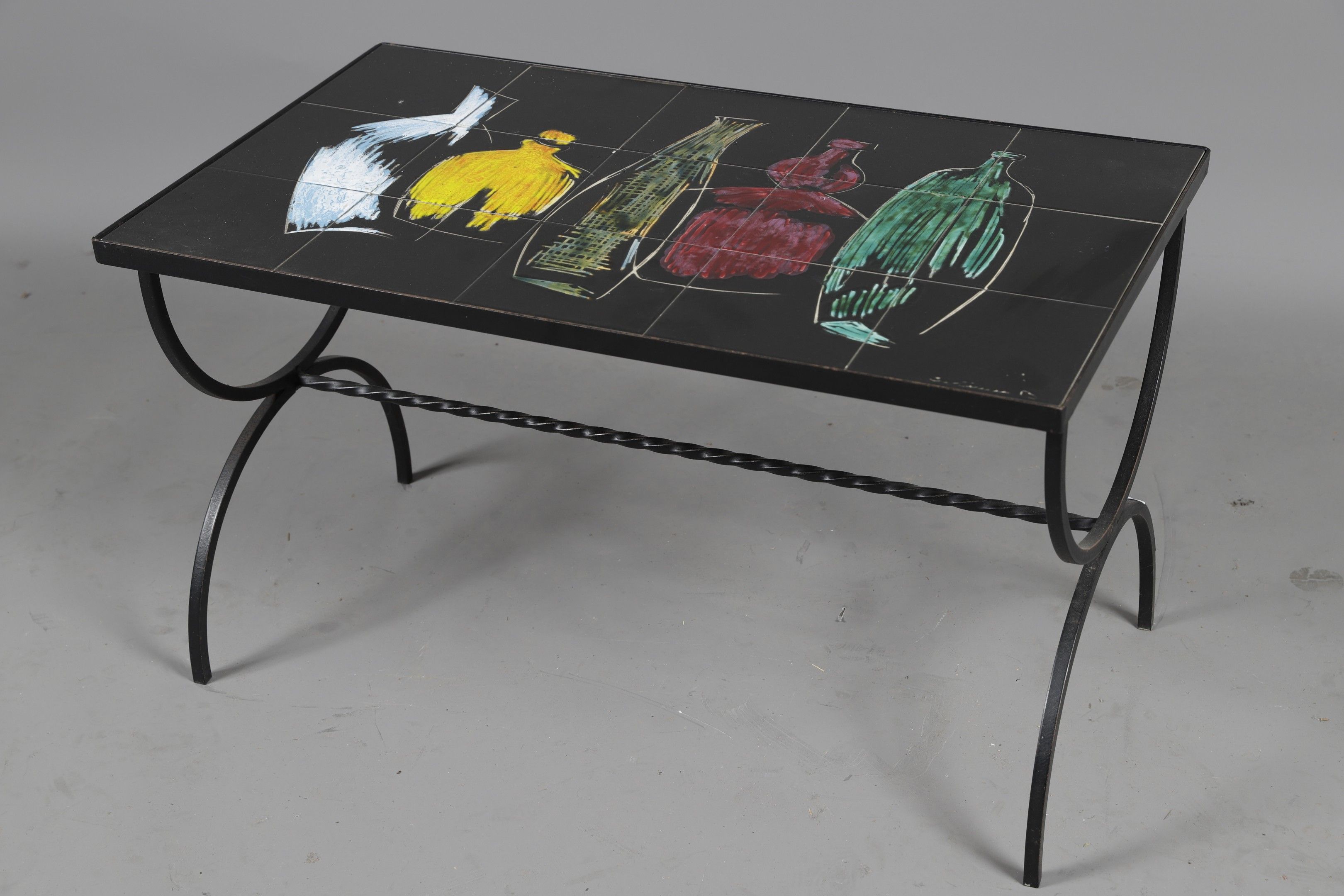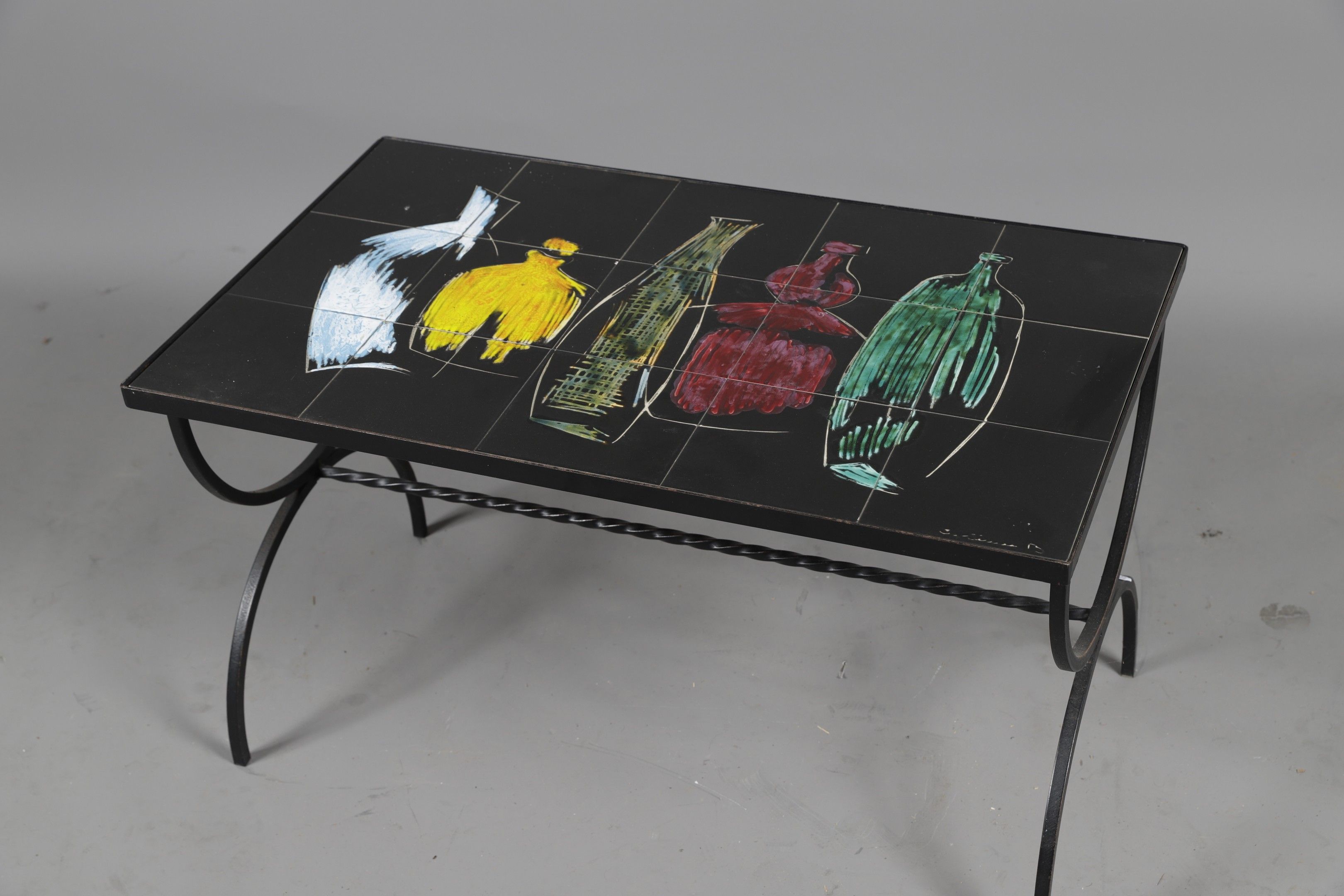 Wrought iron LOW TABLE circa 1970, tiled top signed S. SIMA B? SIMA B?, curved legs with twisted braces. 44 x 76 x 46 cm