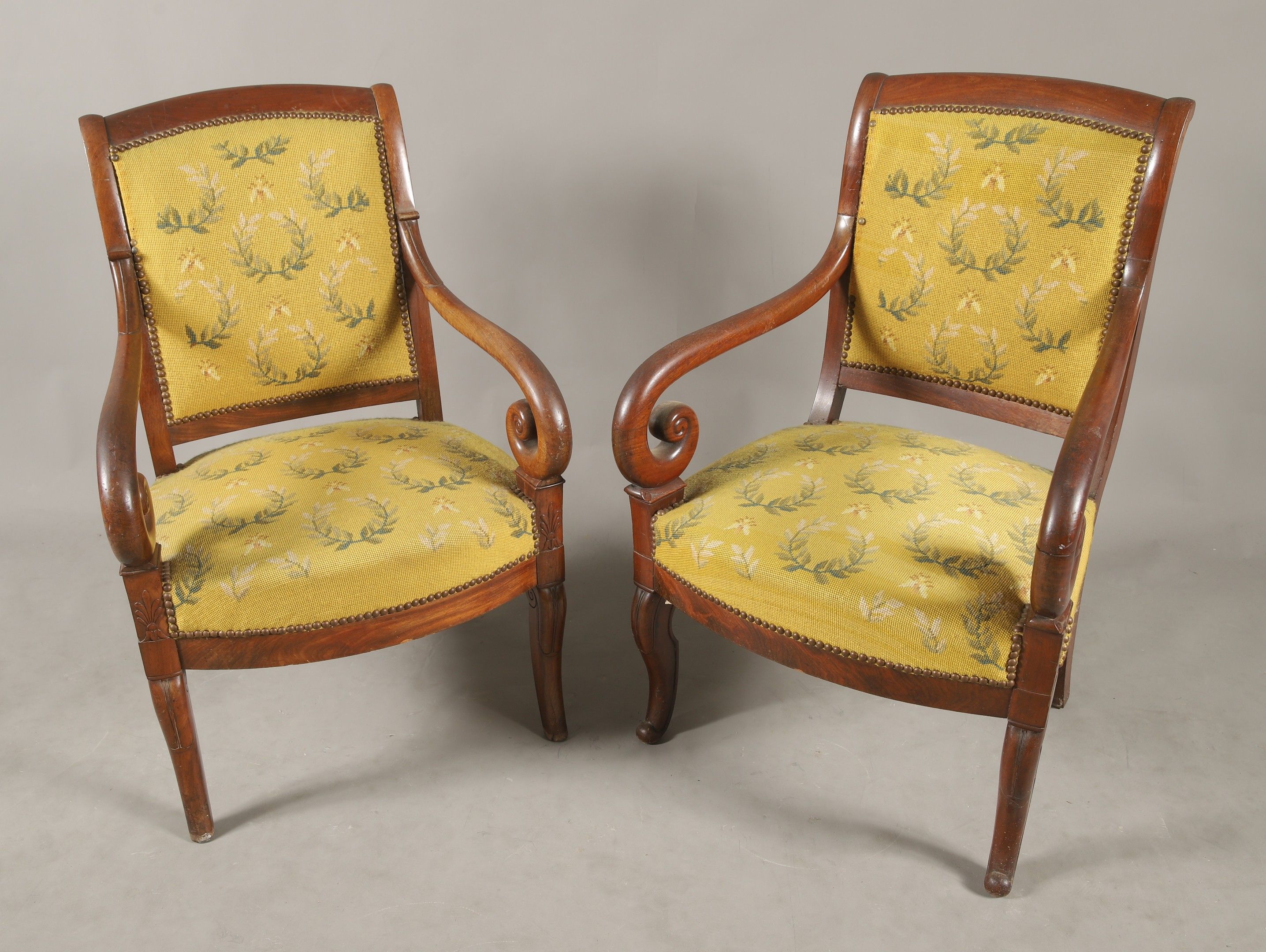 A PAIR of mahogany and mahogany veneered armchairs of the Re…