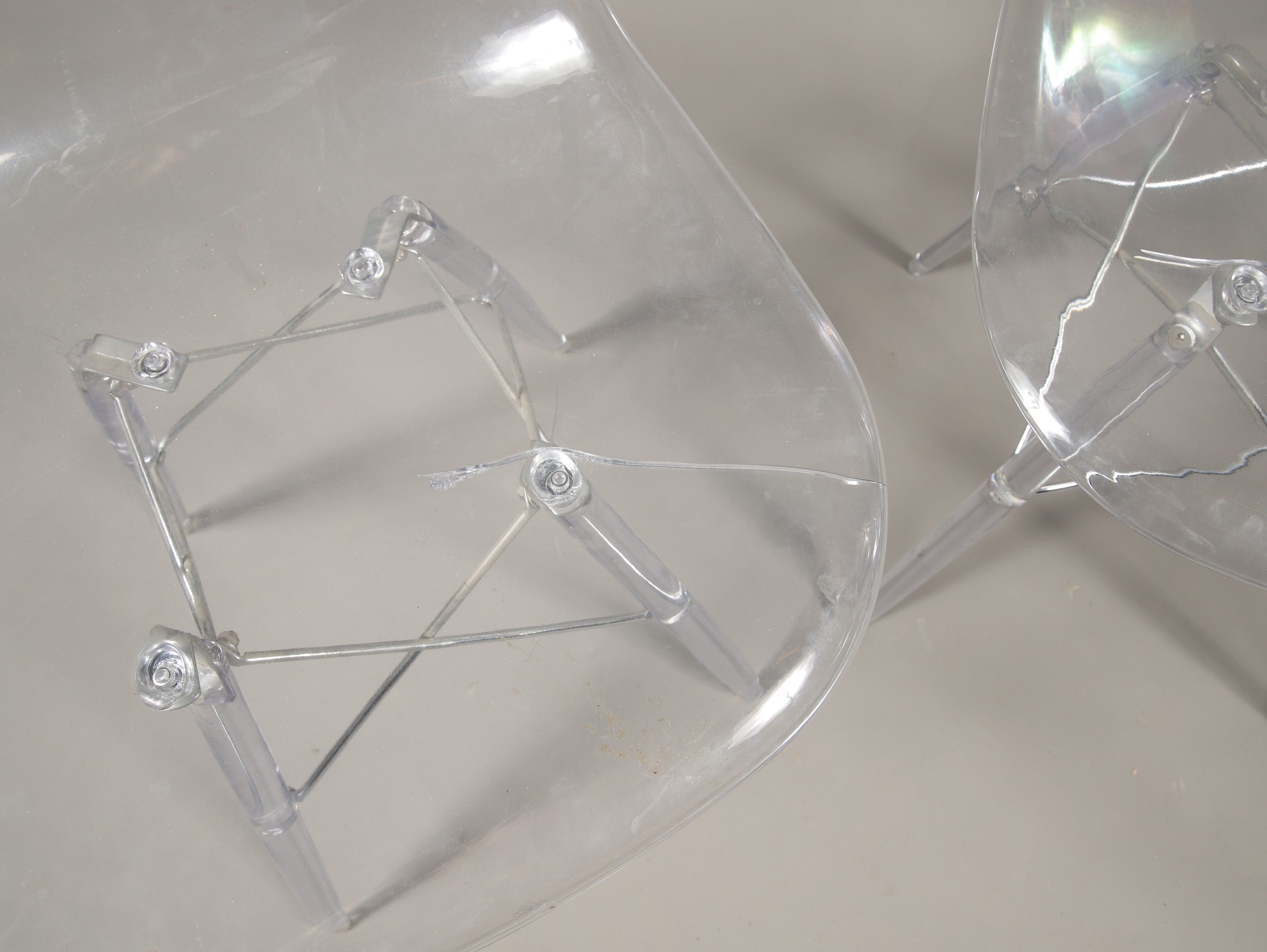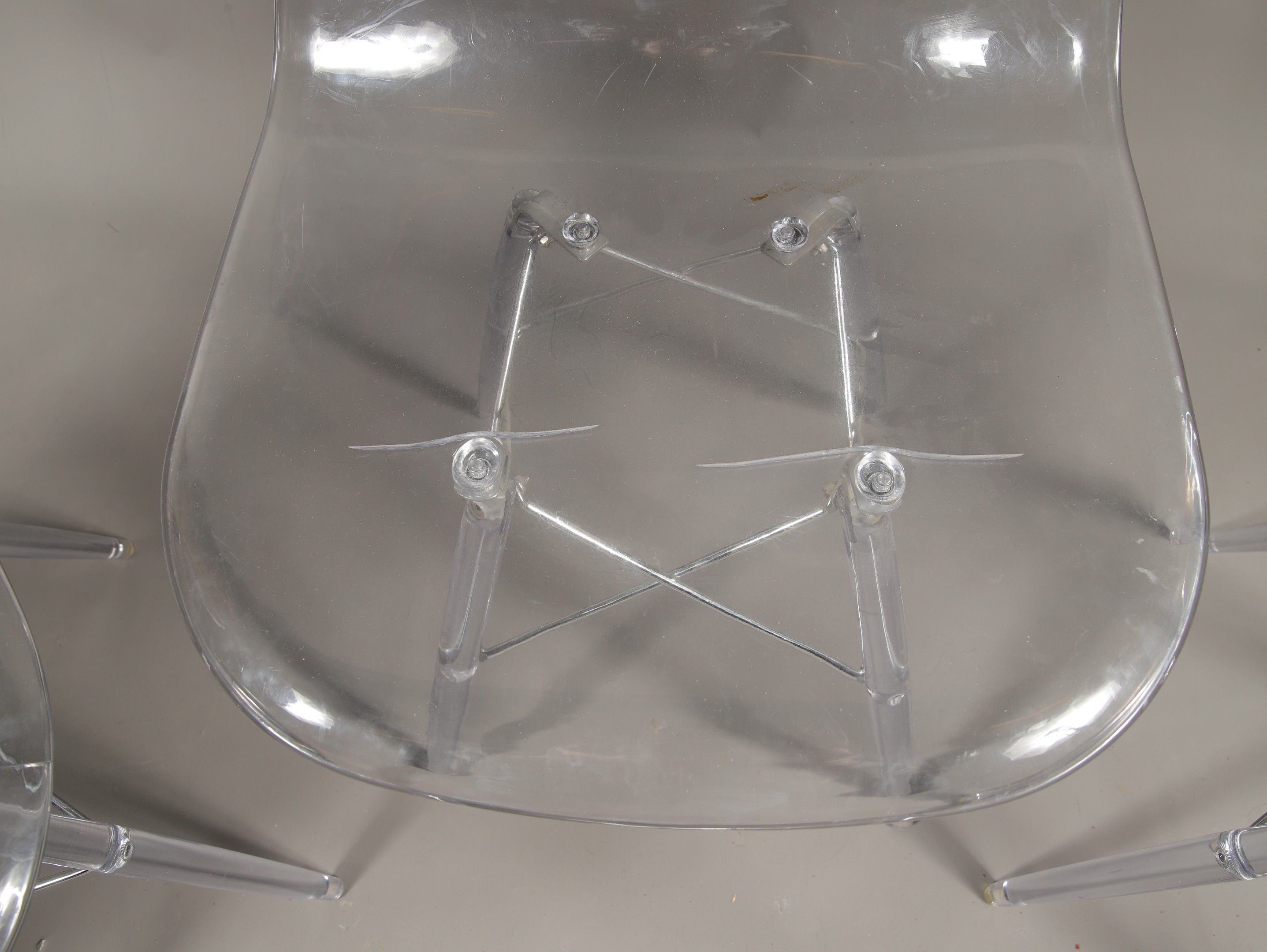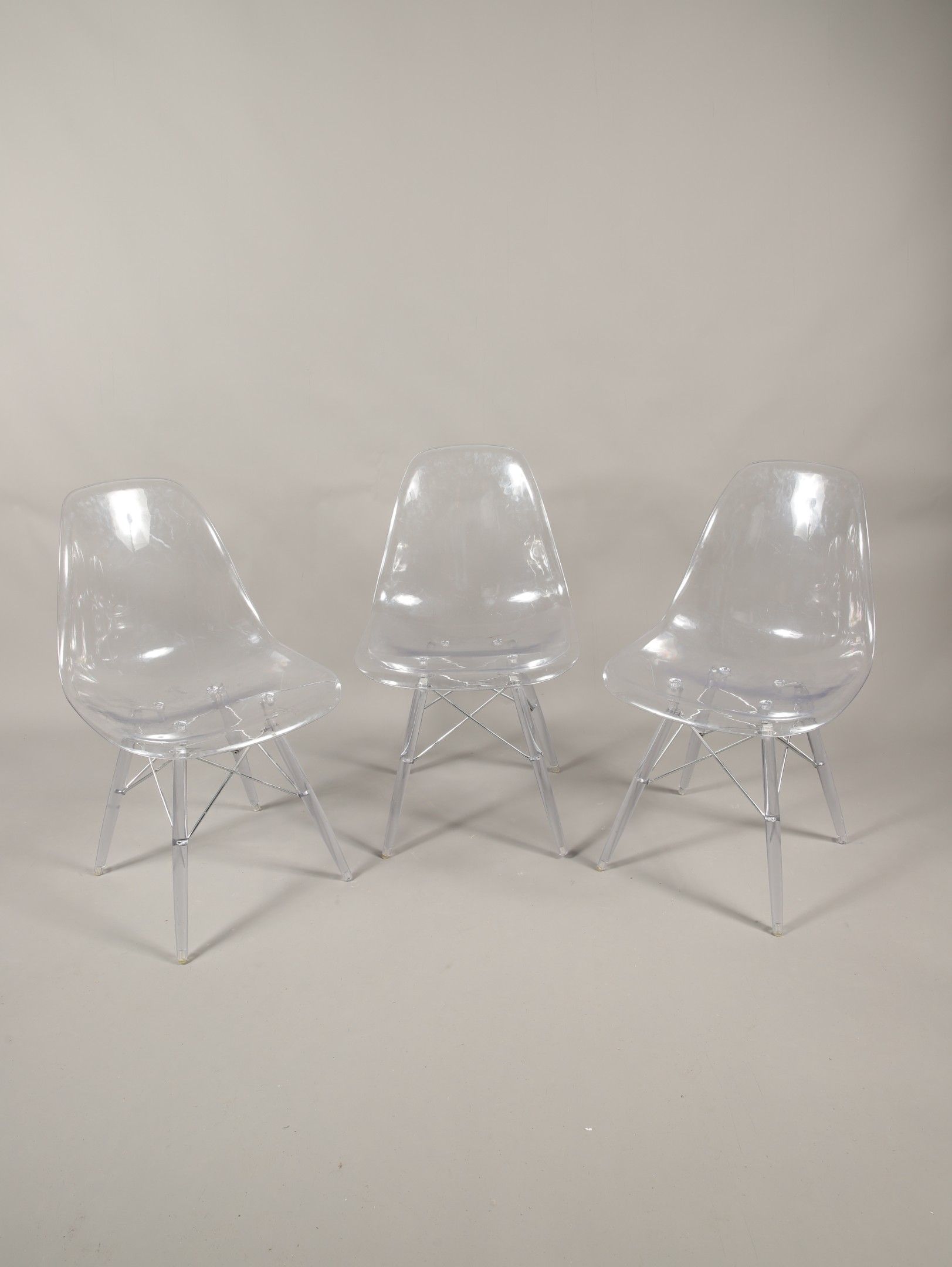 SET of THREE Plexiglas and steel CHAIRS with Eiffel Tower legs in the style of Charles Eames. H: 80 cm (accidents)