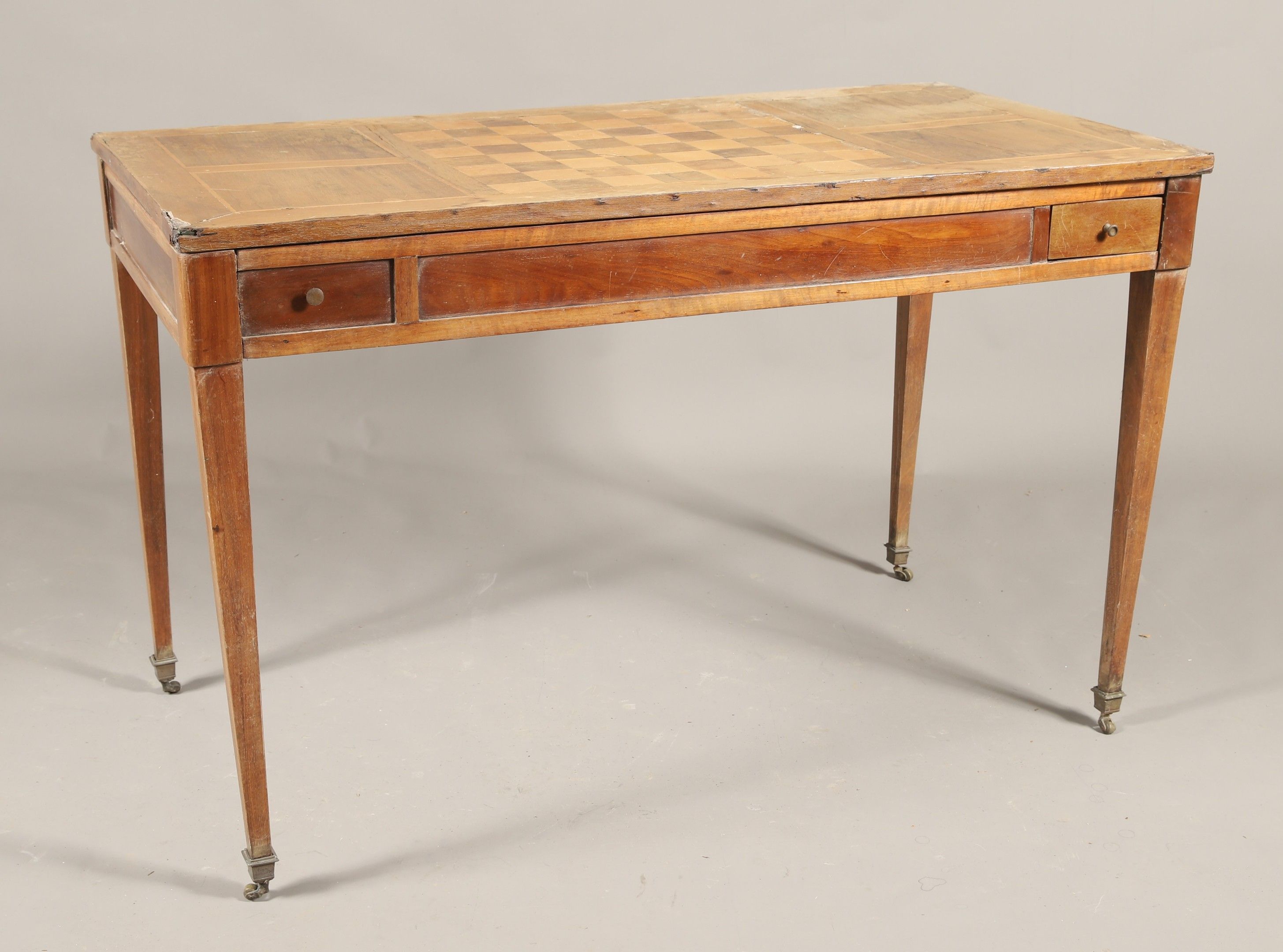 Rectangular Louis XVI style 19th century mahogany GAME TABLE opening to two drawers and two false drawers, top inlaid with a cherry and walnut checkerboard. Sheath legs on castors. 71 x 112.5 x 58.5 cm