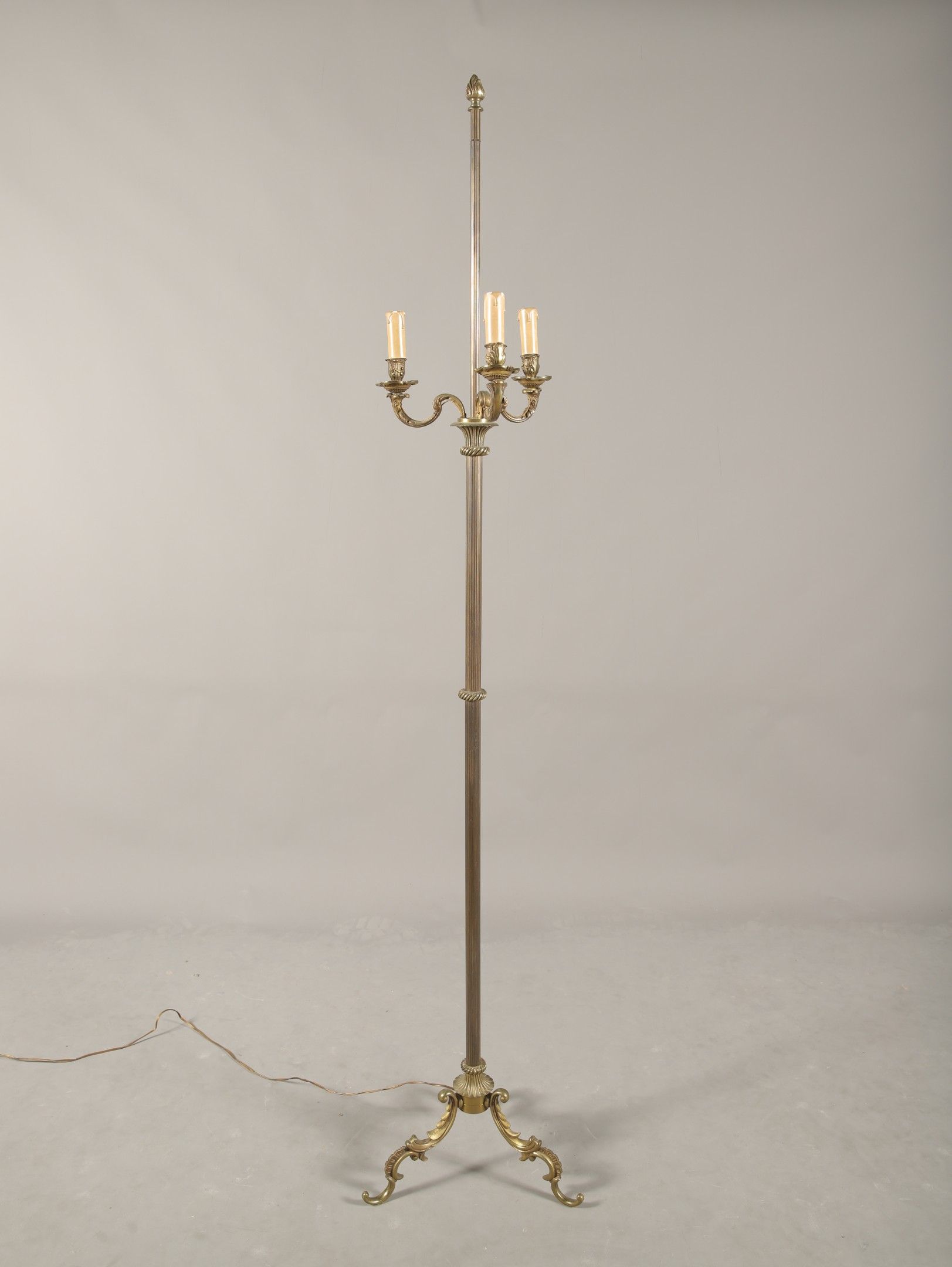 Three-light LAMPADAIRE from the 1950s, fluted shaft on Rocaille tripod base. Height: 180 cm