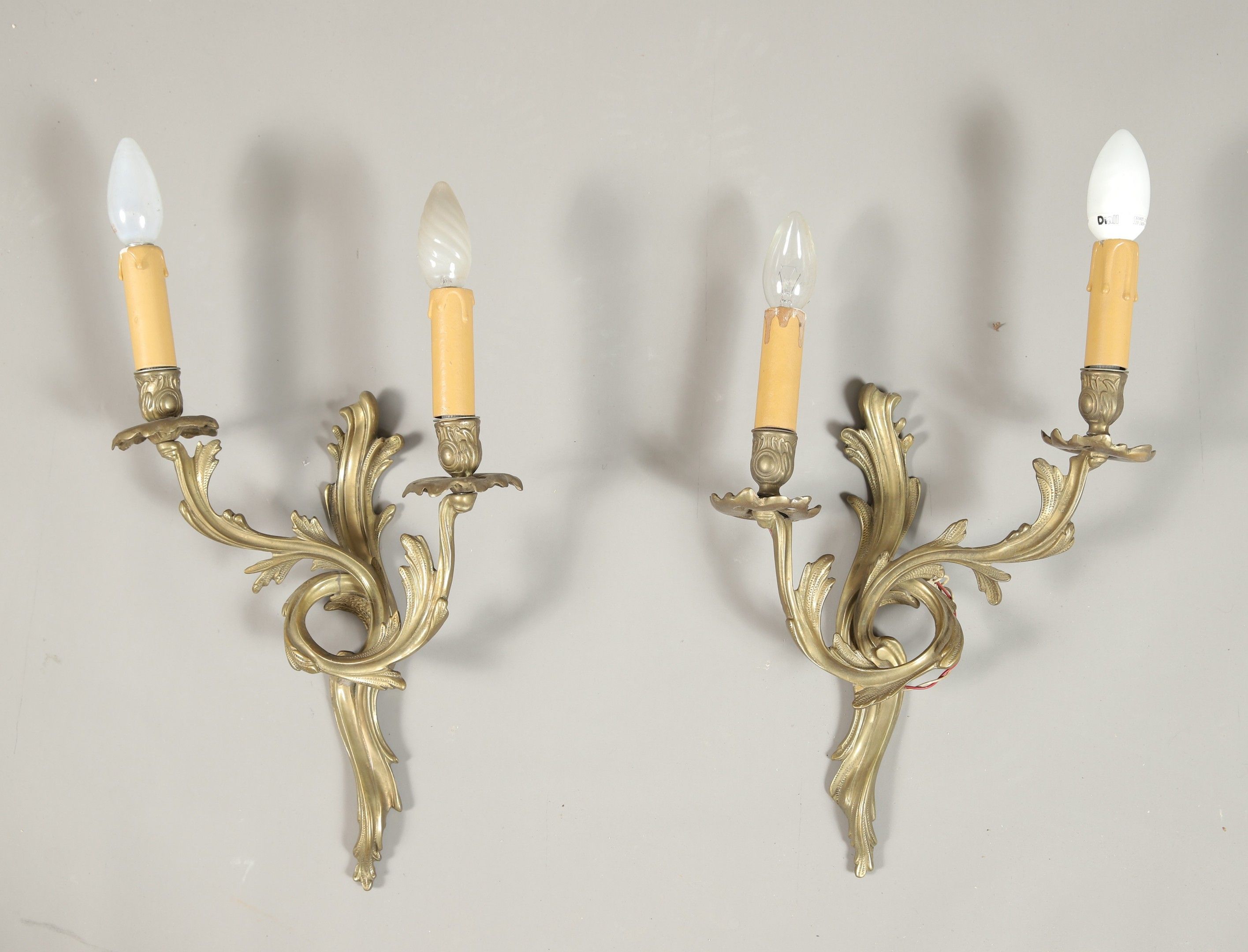 A Pair of two-light bronze wall lights in the Rococo style. Height: 31 cm