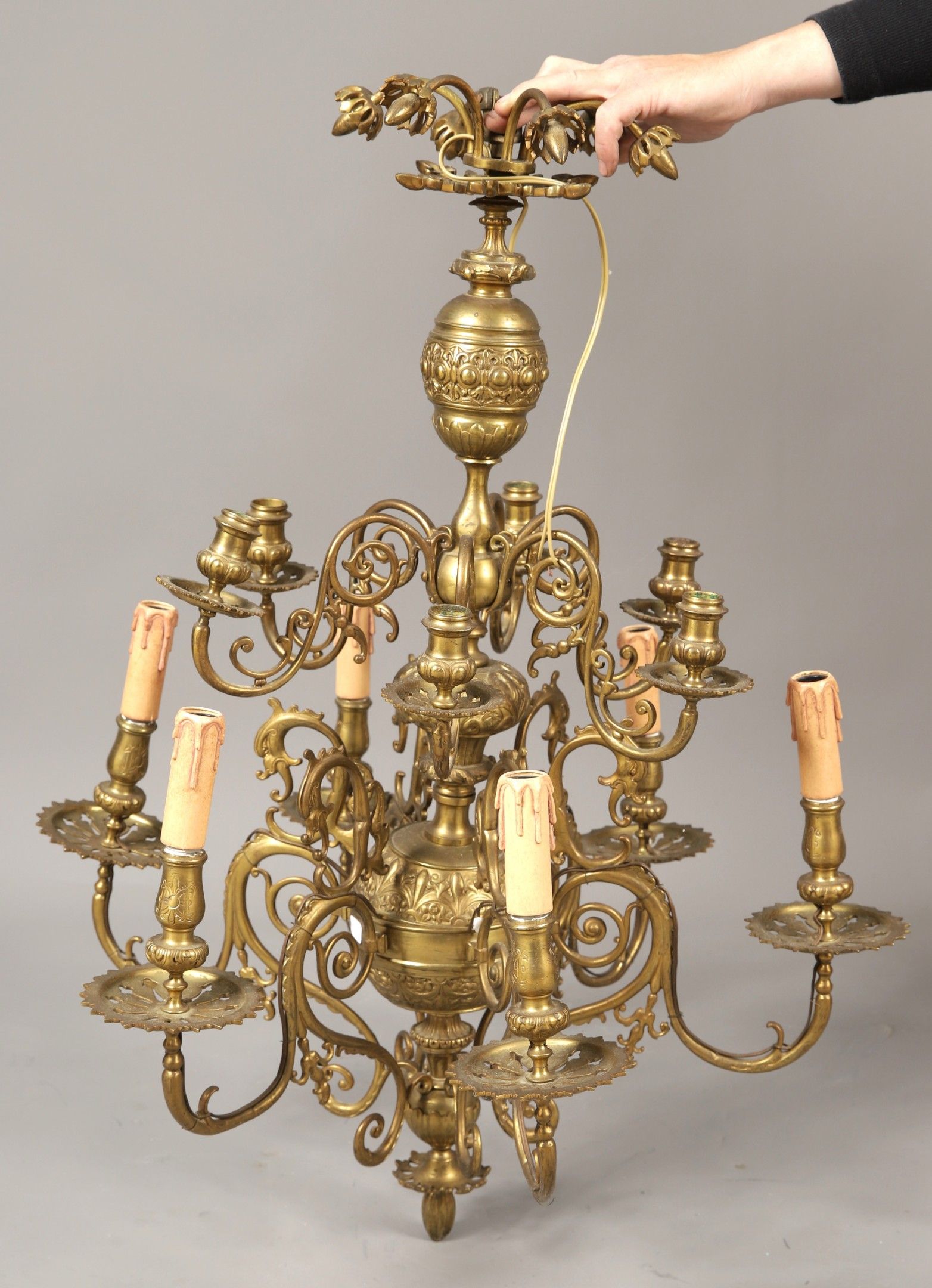 An Empire style bronze and brass LUSTRE with 12 lights in two rows, the shaft decorated with palmettes. Height: 87 cm