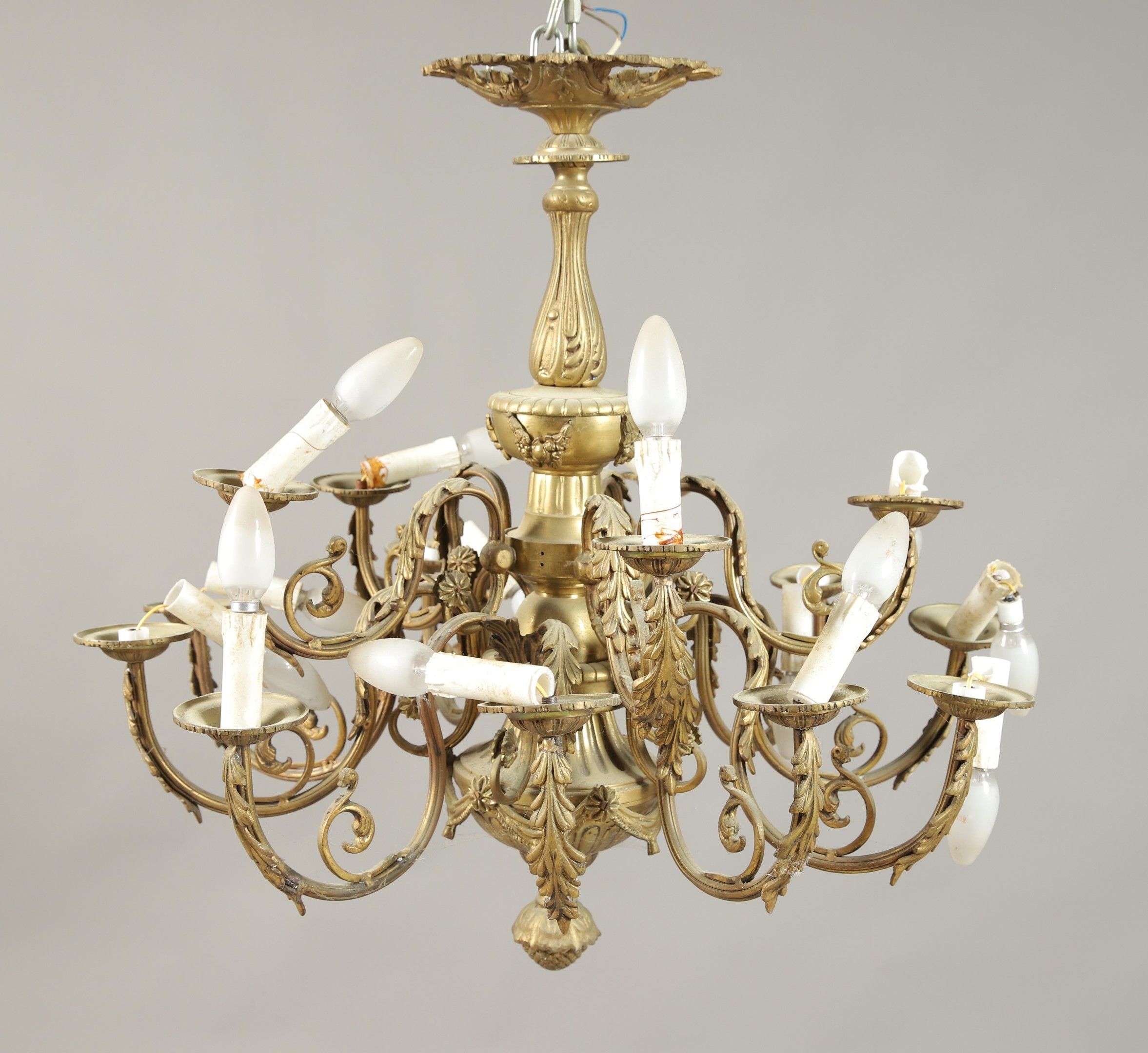 A Louis XVI style bronze two-row 15-light chandelier with a …
