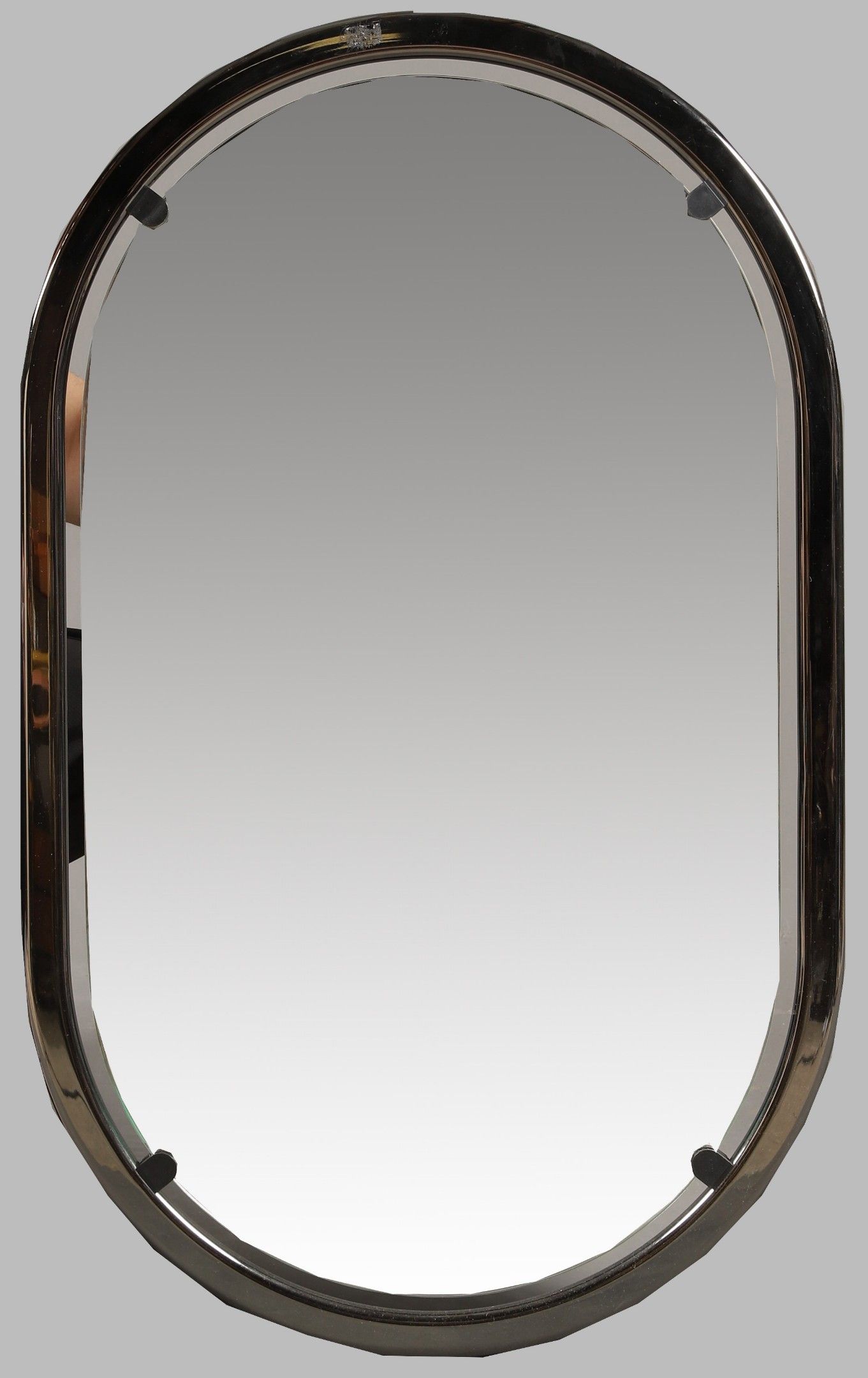 DESIGN. 1) Oak veneered GUERIDON on metal shaft and base. H: 72; Diam: 110 cm. 2) Chromed metal oval mirror. 83 x 51 cm