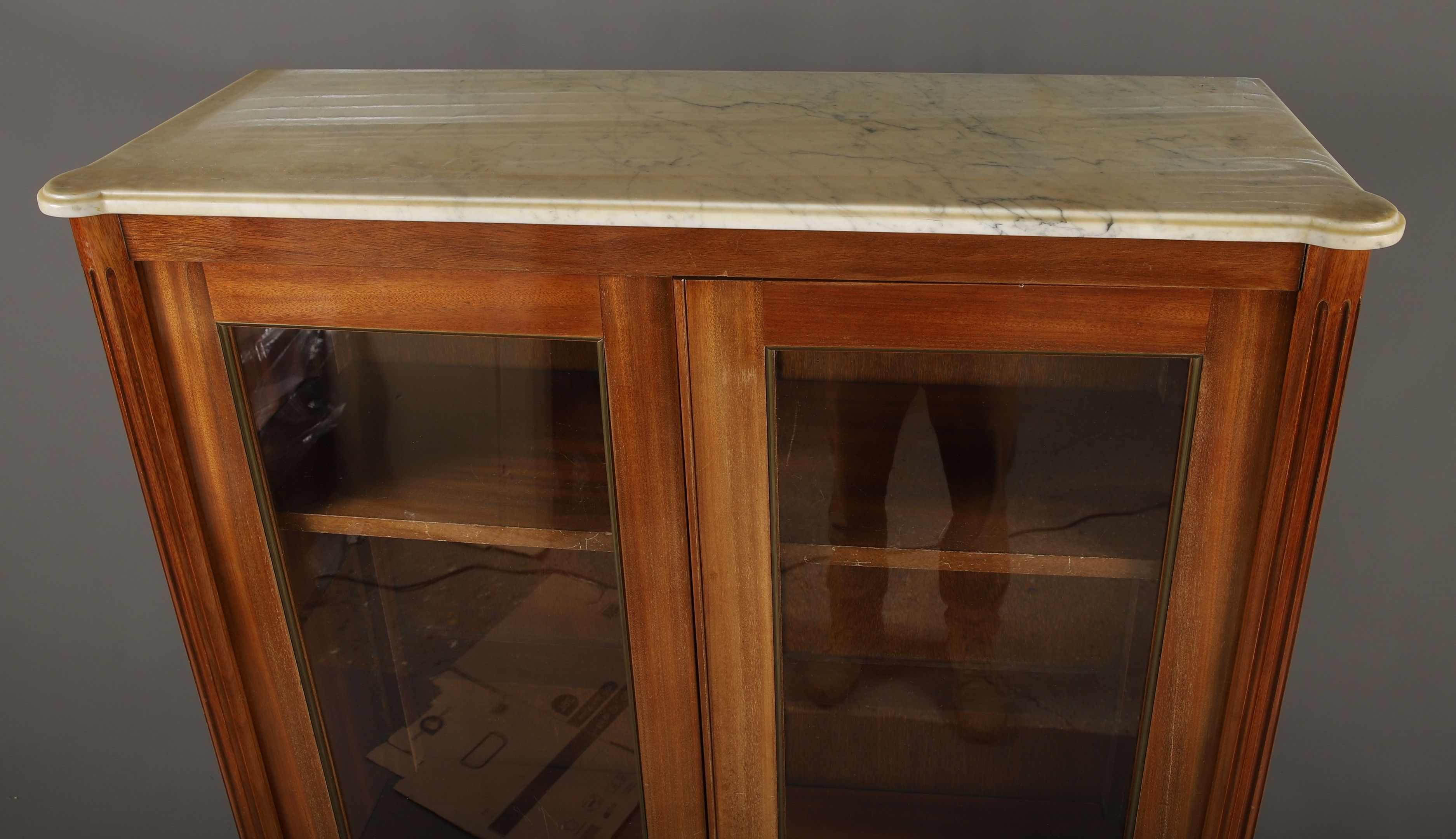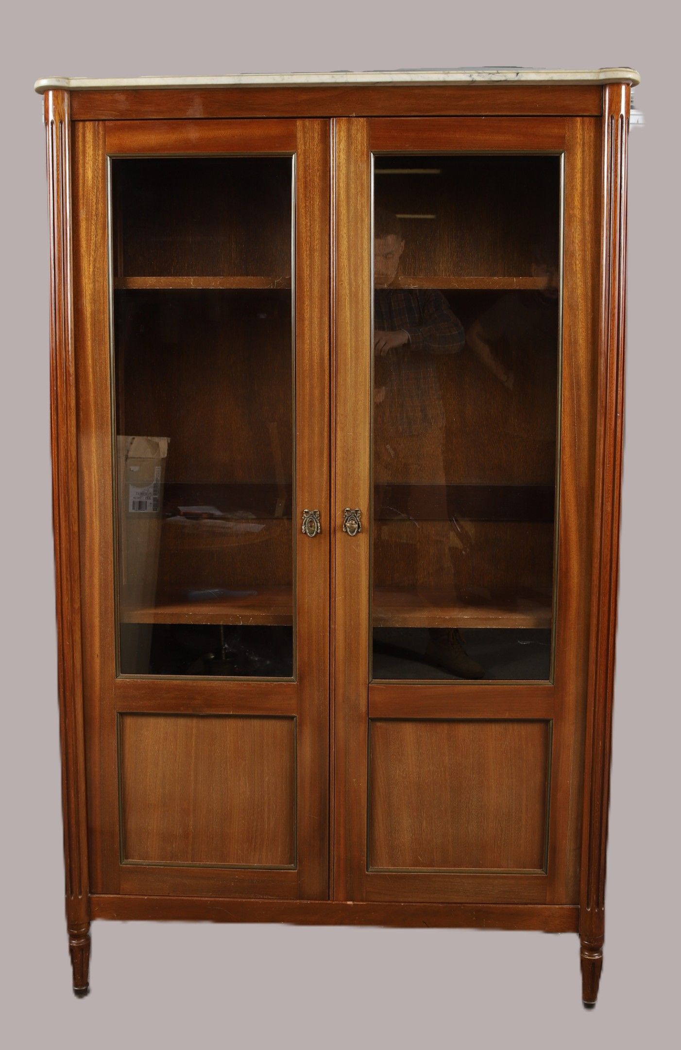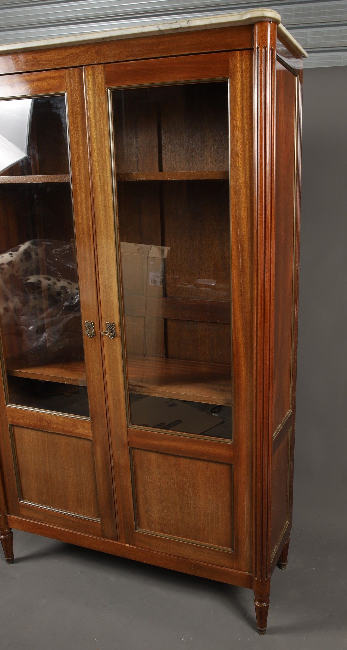 Louis XVI style mahogany VITRINE with rounded jambs decorated with brass strips and fluting, yellow marble top. 167 x 103 x 38 cm