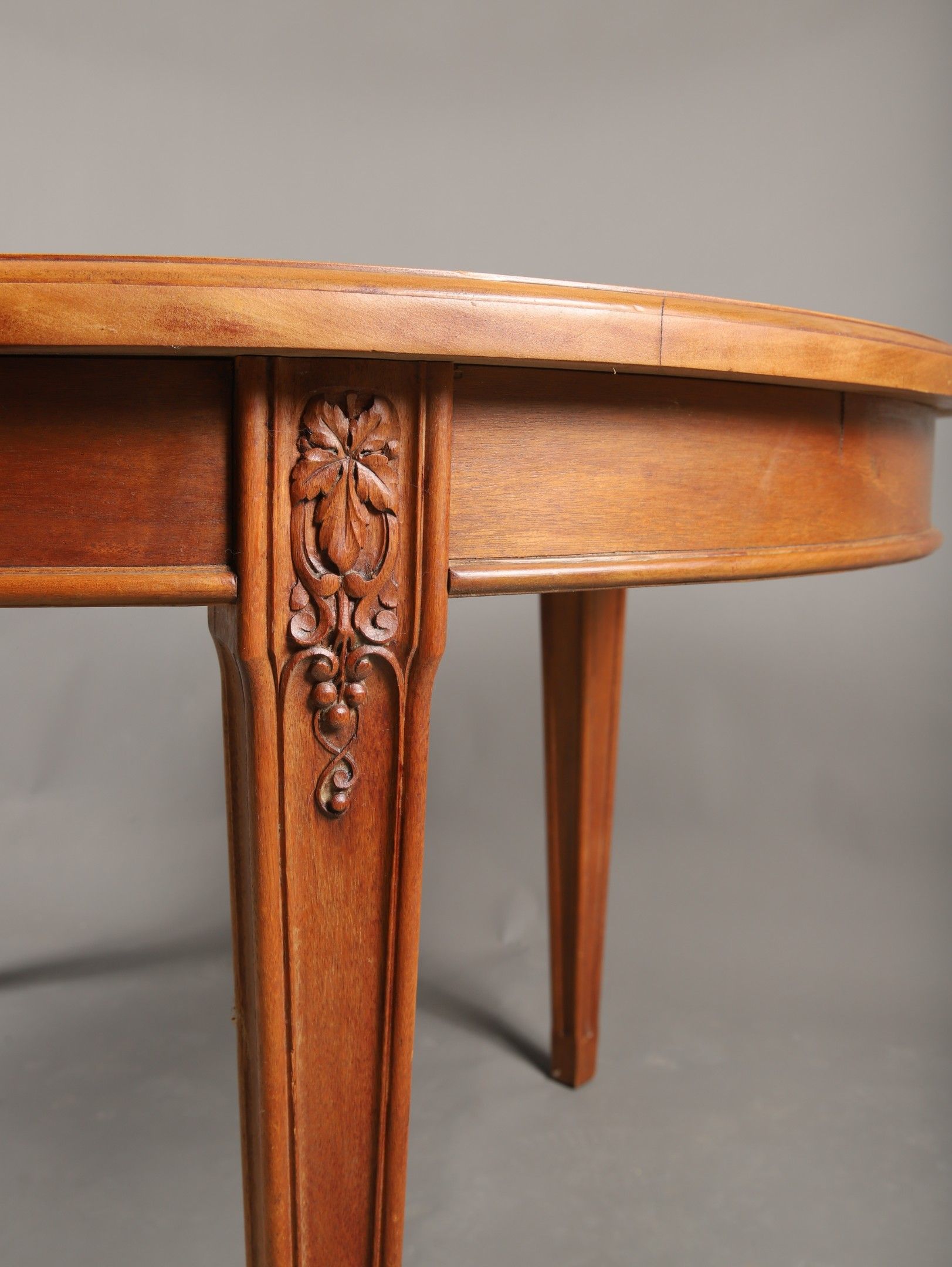 Oval dining room table in cherry wood from the 1910-1920's, sheath legs carved with pampers and mouldings. 73 x 148 x 118 cm