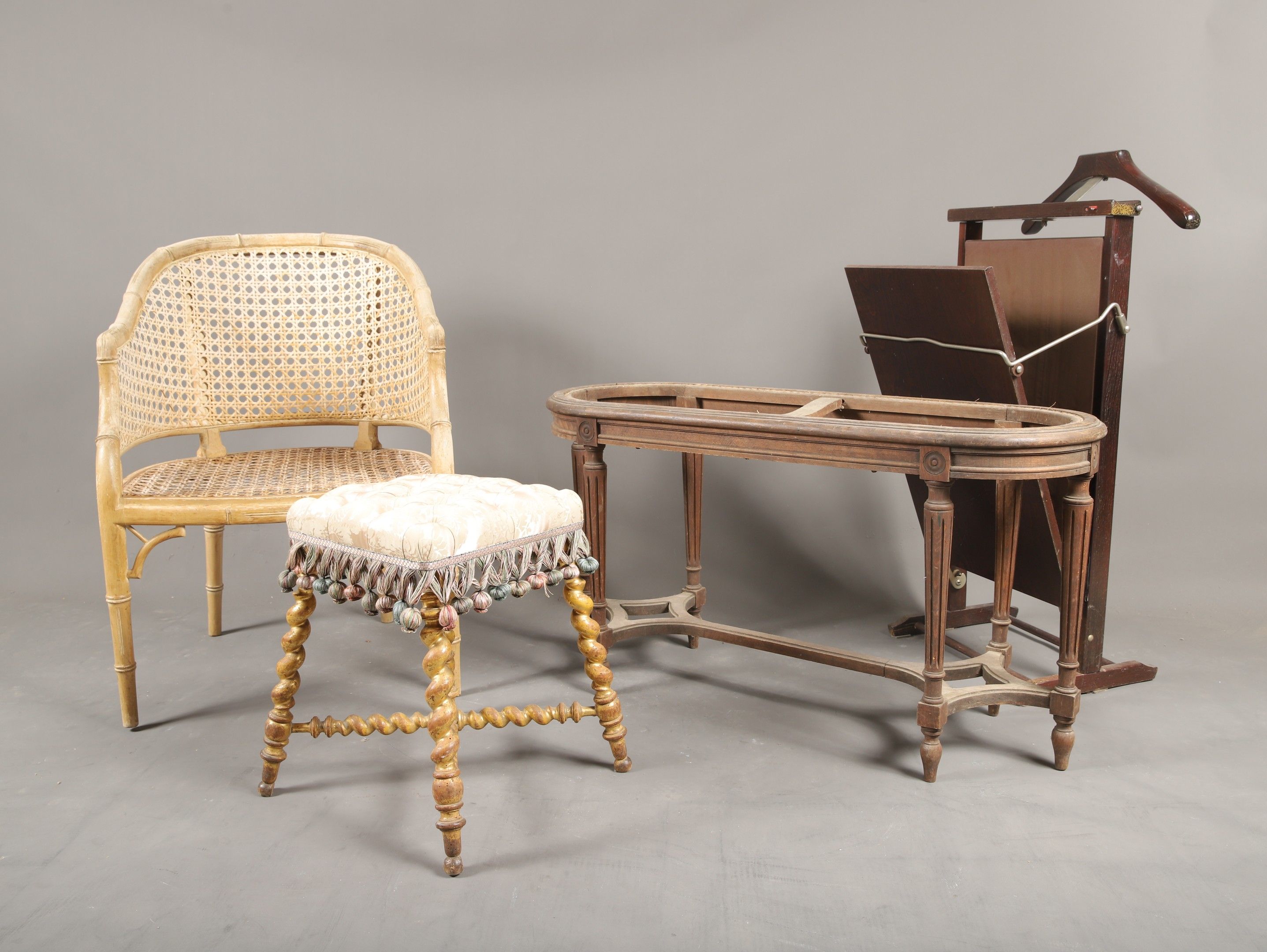 LOT COMPRISING a caned gondola armchair in rattan style wood, a Napoleon III period giltwood stool turned in twists and decorated with trimmings, a Louis XVI style piano bench in natural wood and a valet de nuit. Valet height: 95 cm
