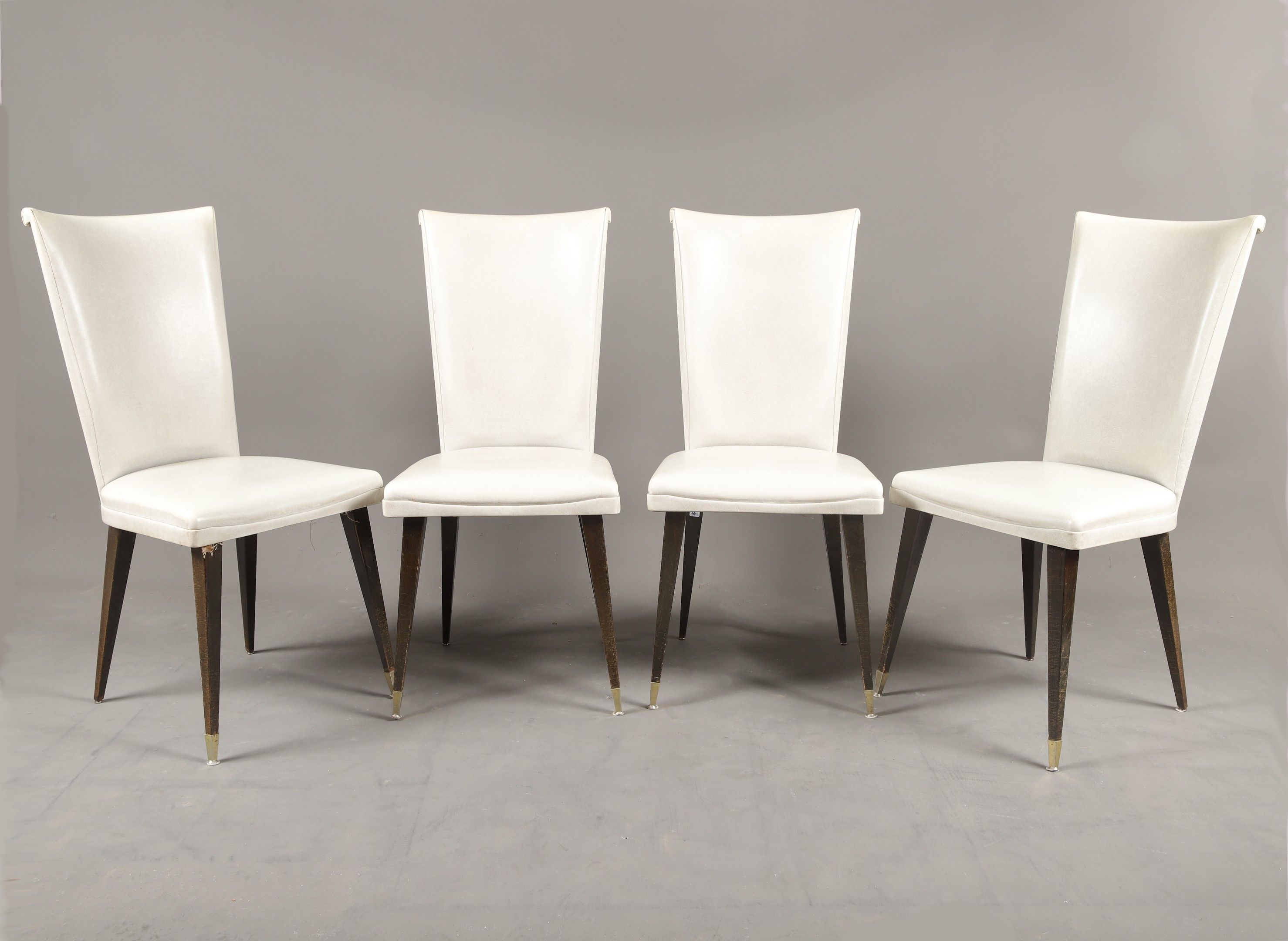SET OF FOUR DINING ROOM CABRIOLE CHAIRS circa 1970, upholstered in leatherette, blackened wooden legs with chrome-plated metal shoes. H: 95 cm (cracks in the skai on the seat of 2 of them)