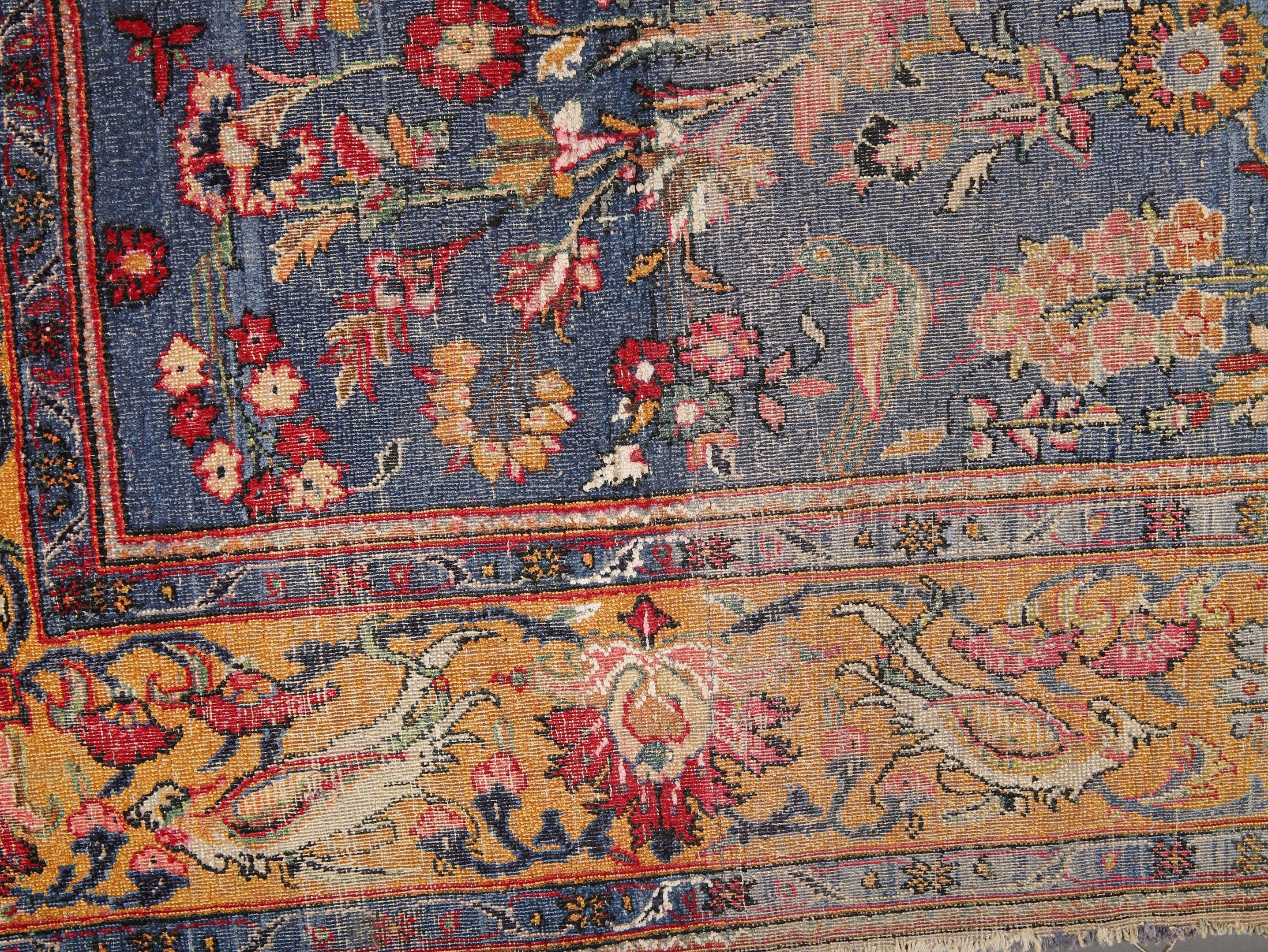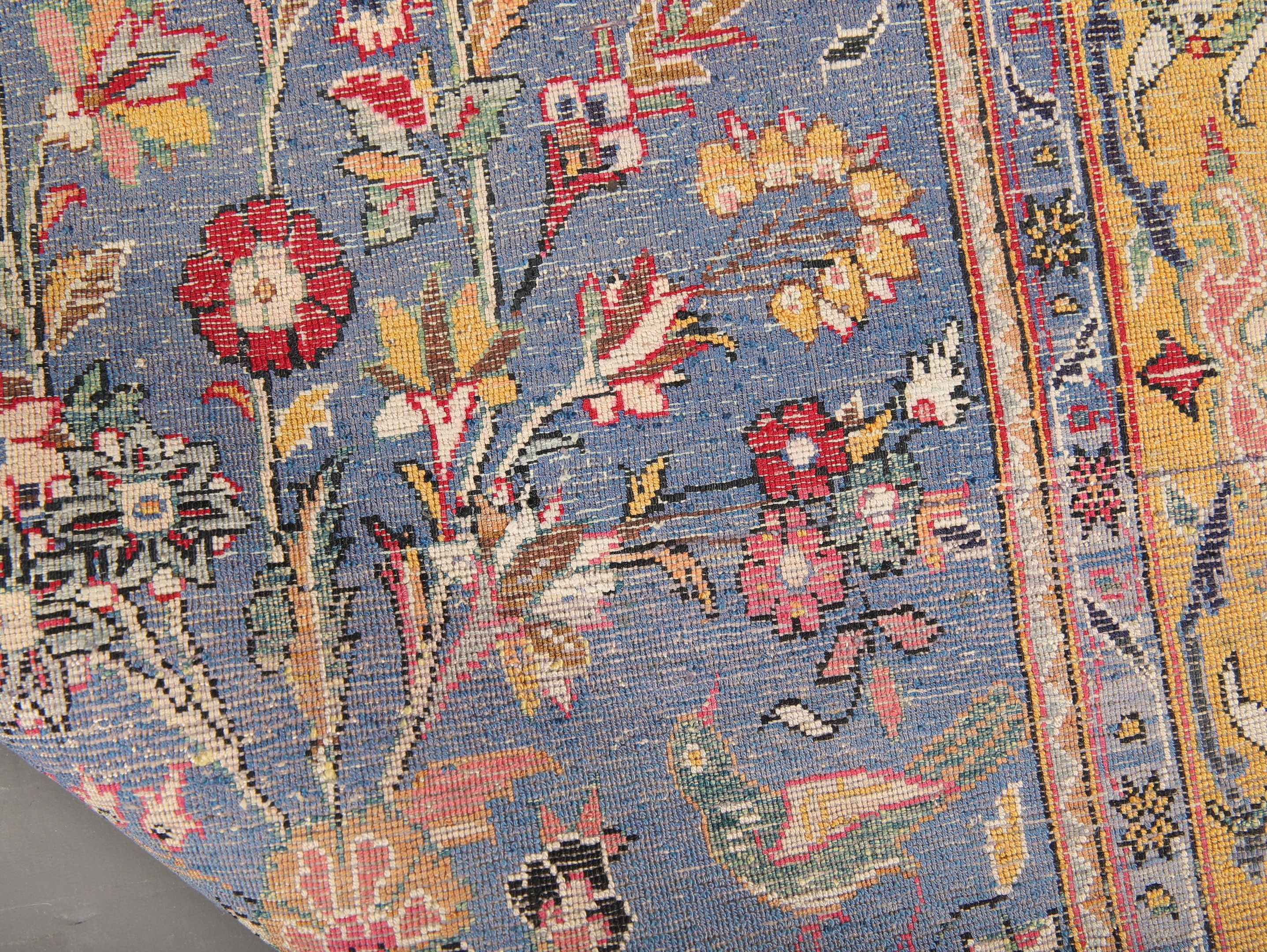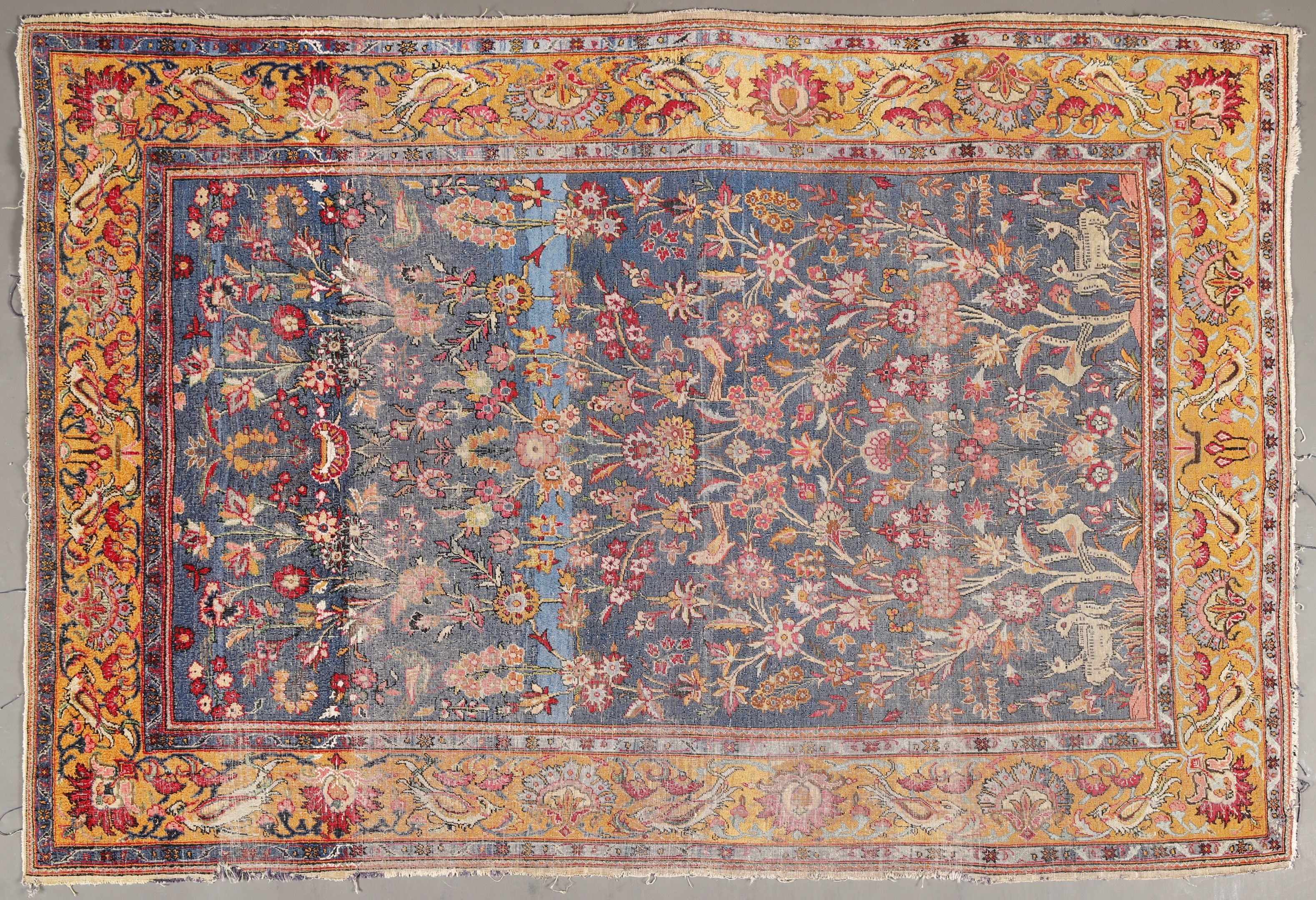 FINE ANCIENT Kachan carpet (Iran) in silk circa 1940 decorated with foliage, birds and animals on a blue background. 149 x 103 cm (very worn)