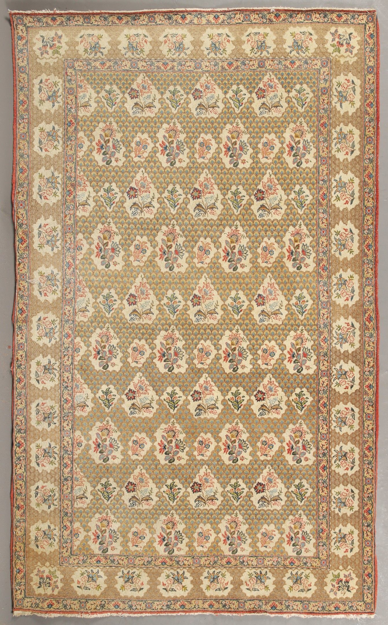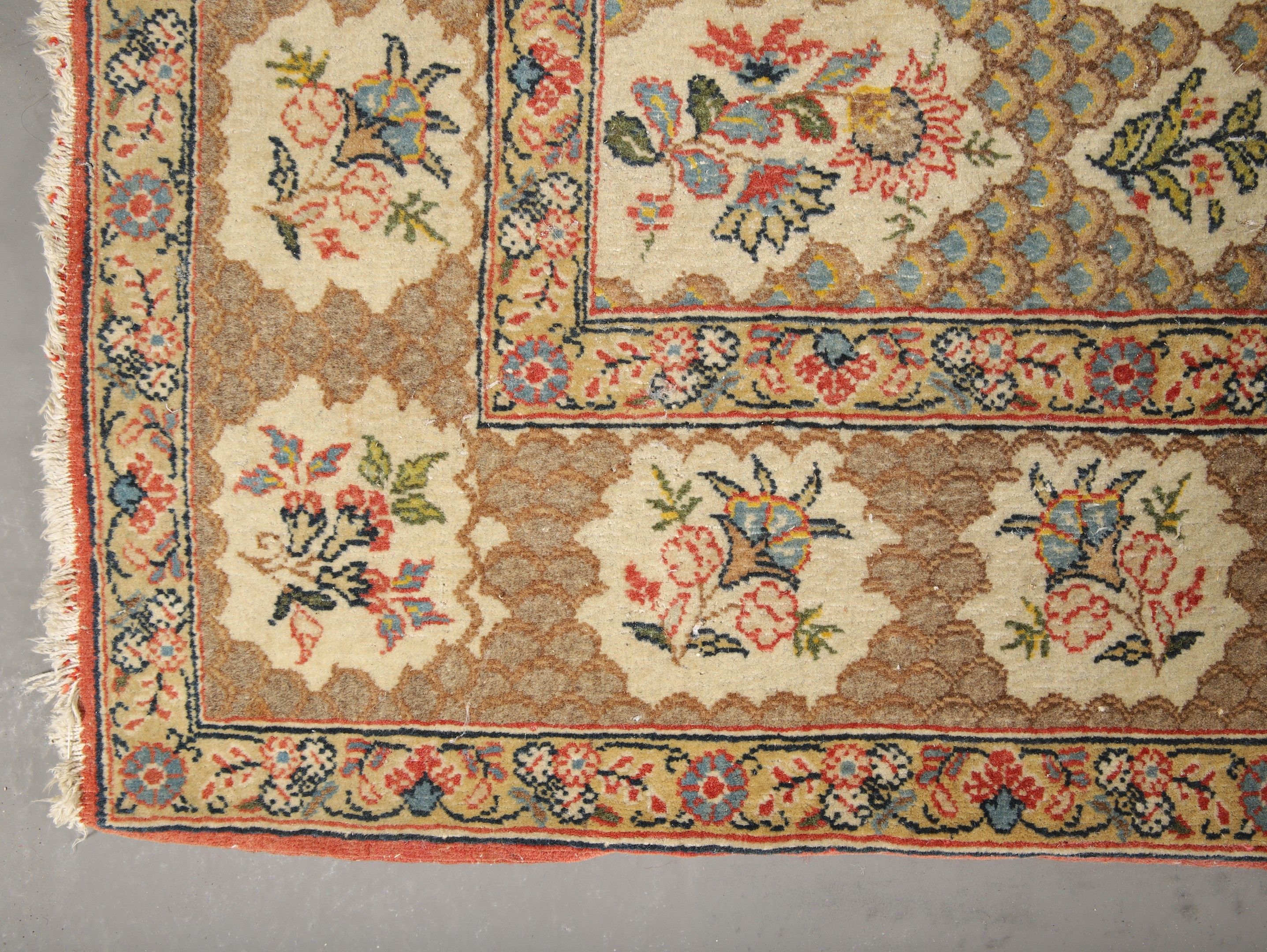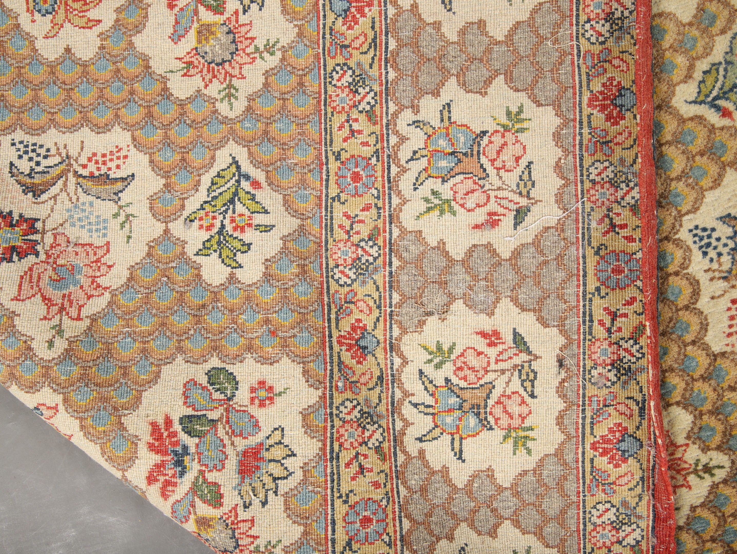 FINE and ORIGINAL GHOUM KORK (Iran) from the Shah's era, circa 1965, in wool and cotton decorated with flowers on a scale background. Density approx. 7,500 knots per dm2. 220 x 140 cm (edges slightly worn)