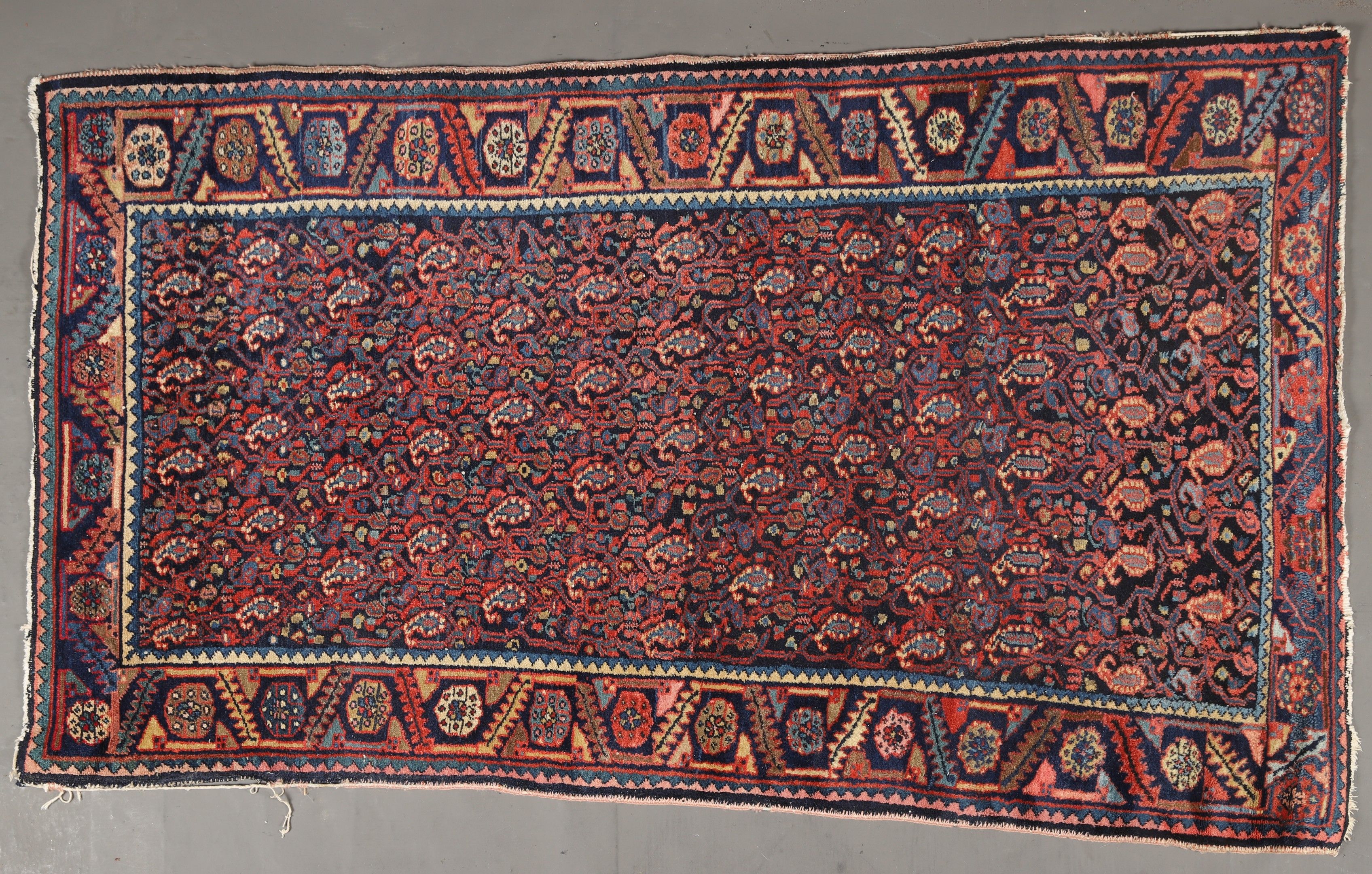 MELAYER RUG (Iran) circa 1940-1950 in wool and cotton decorated with boteh on a black background. 176 x 106 cm (worn selvages)