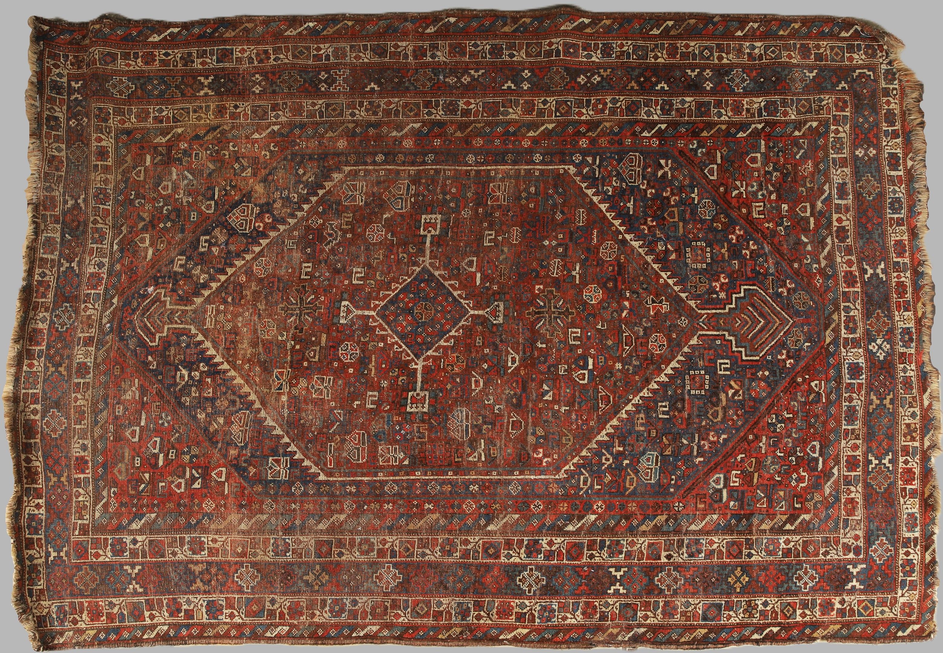 OLD KHAMSEH RUG (Iran) from the late 19th century in wool decorated with medallions on a red and blue background. 273 x 210 cm (very worn)