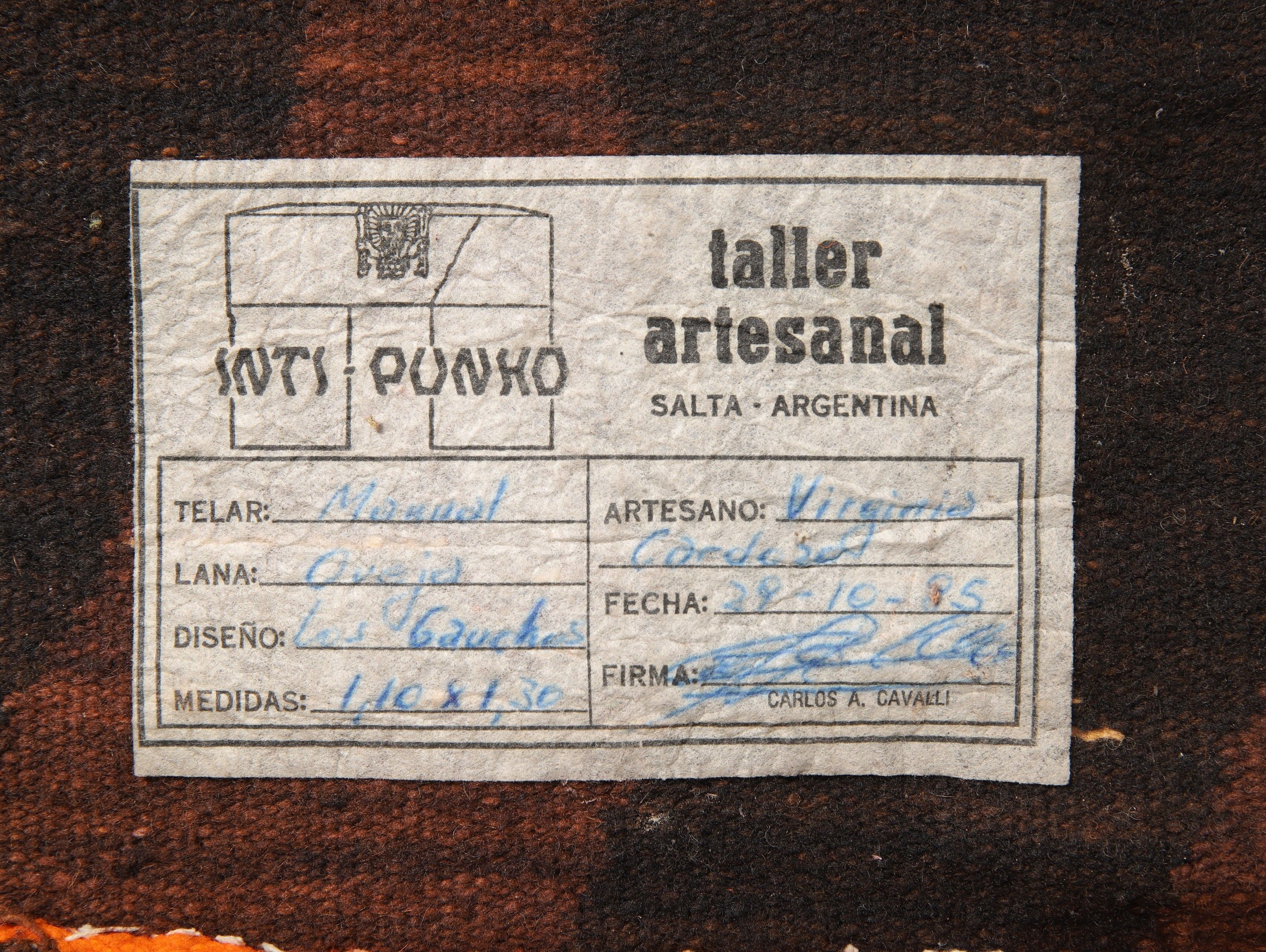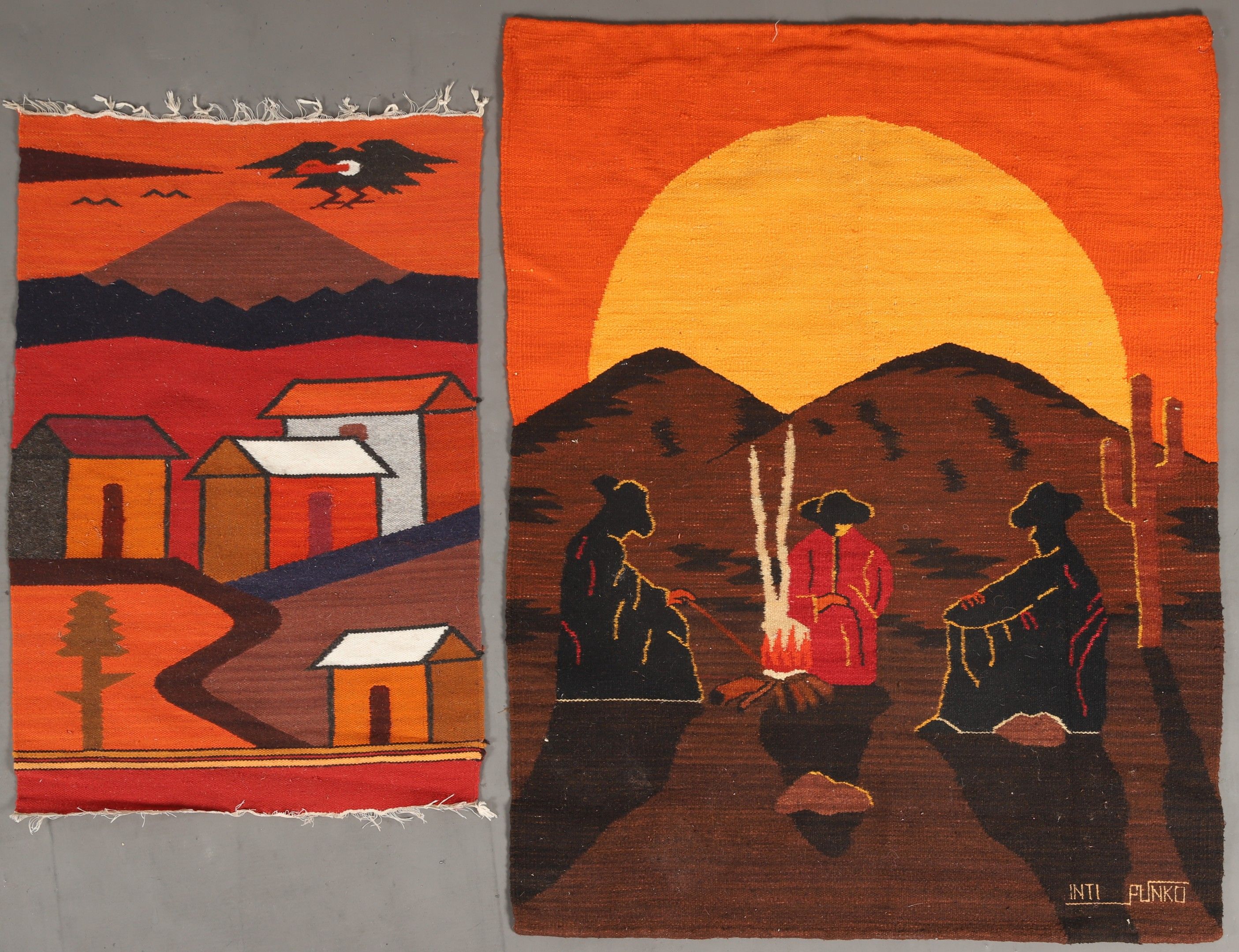 TWO ARGENTINIAN KILIMS in wool, one signed INTI PUNKO depicting gauchos, the other depicting a condor. 130 x 110 and 98 x 67 cm