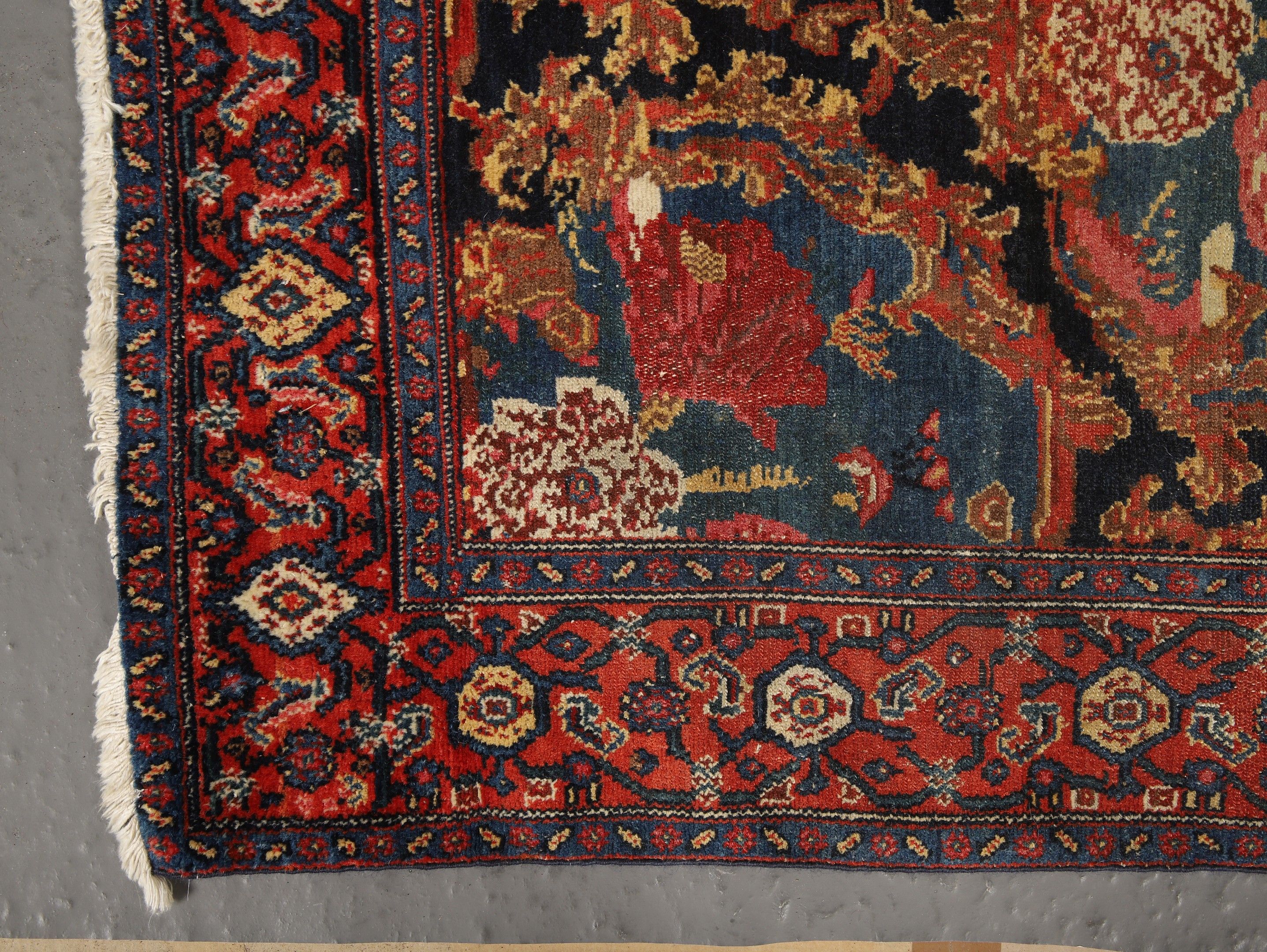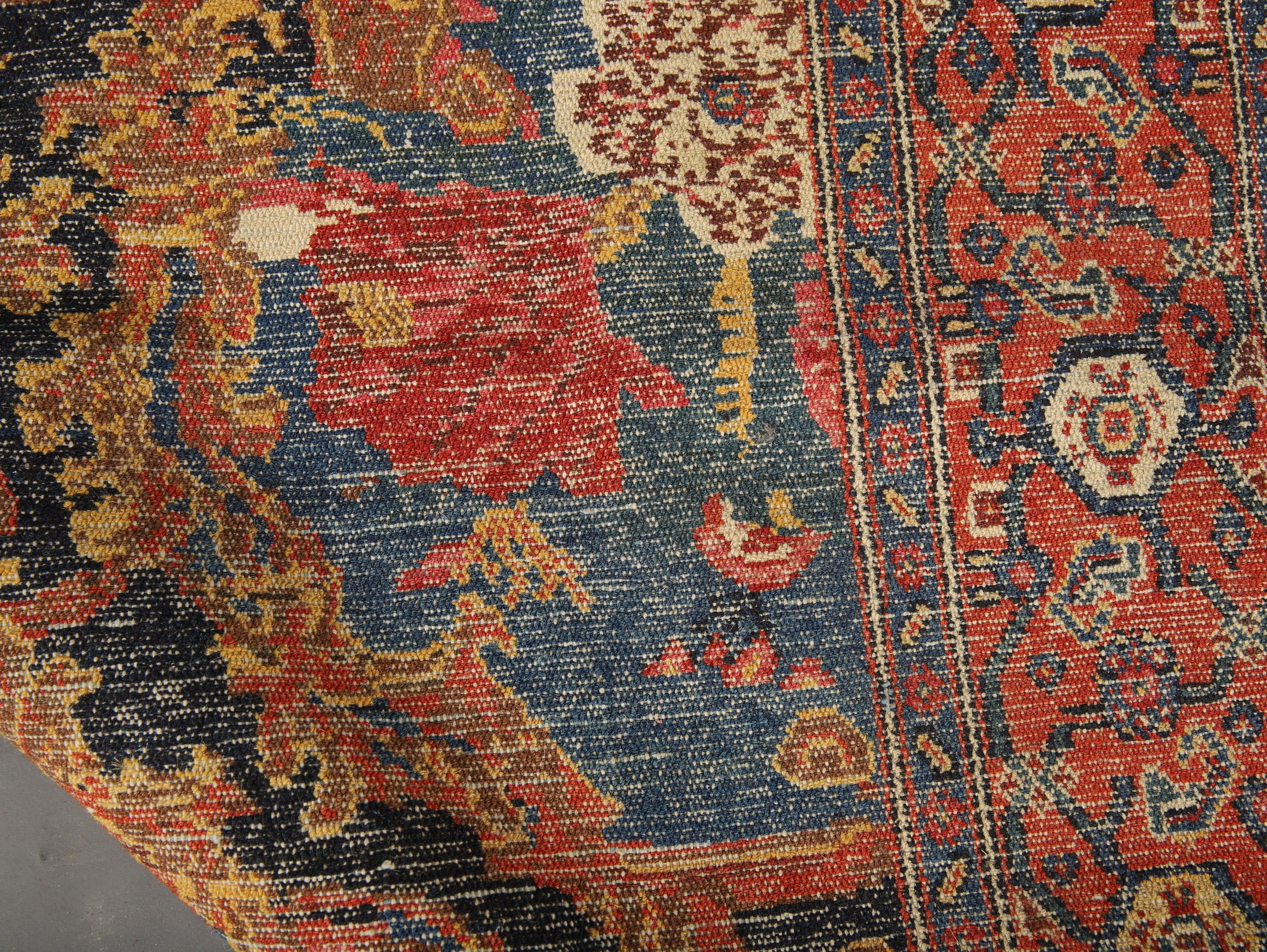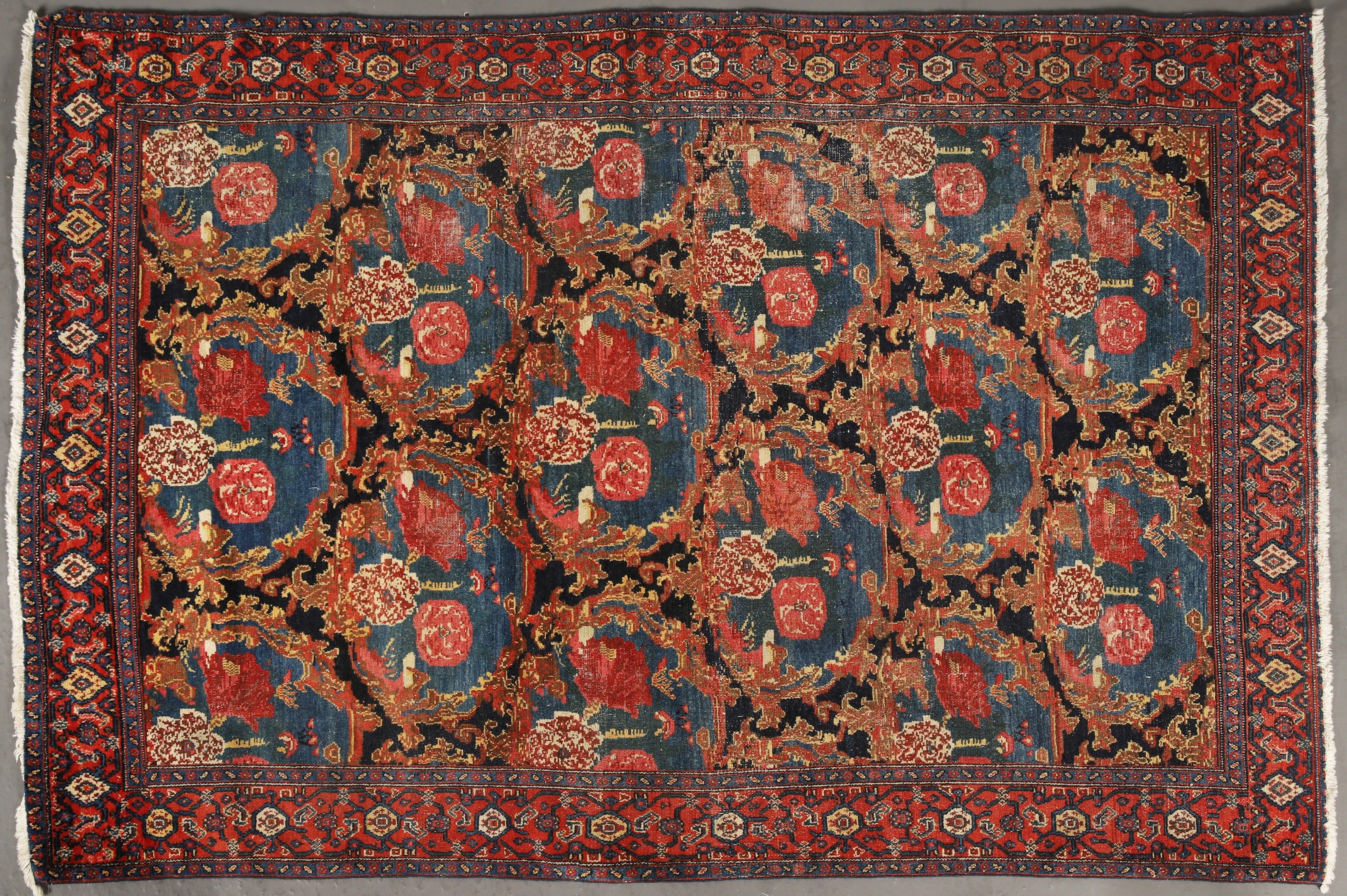 FINE, VERY ORIGINAL and OLD SENNEH CARPET (Persia) in wool and cotton from the early 20th century, decorated with roses on a blue background imitating French Savonnerie carpets. Density approx. 7,500 knots per dm2. 187 x 133 cm (wear)