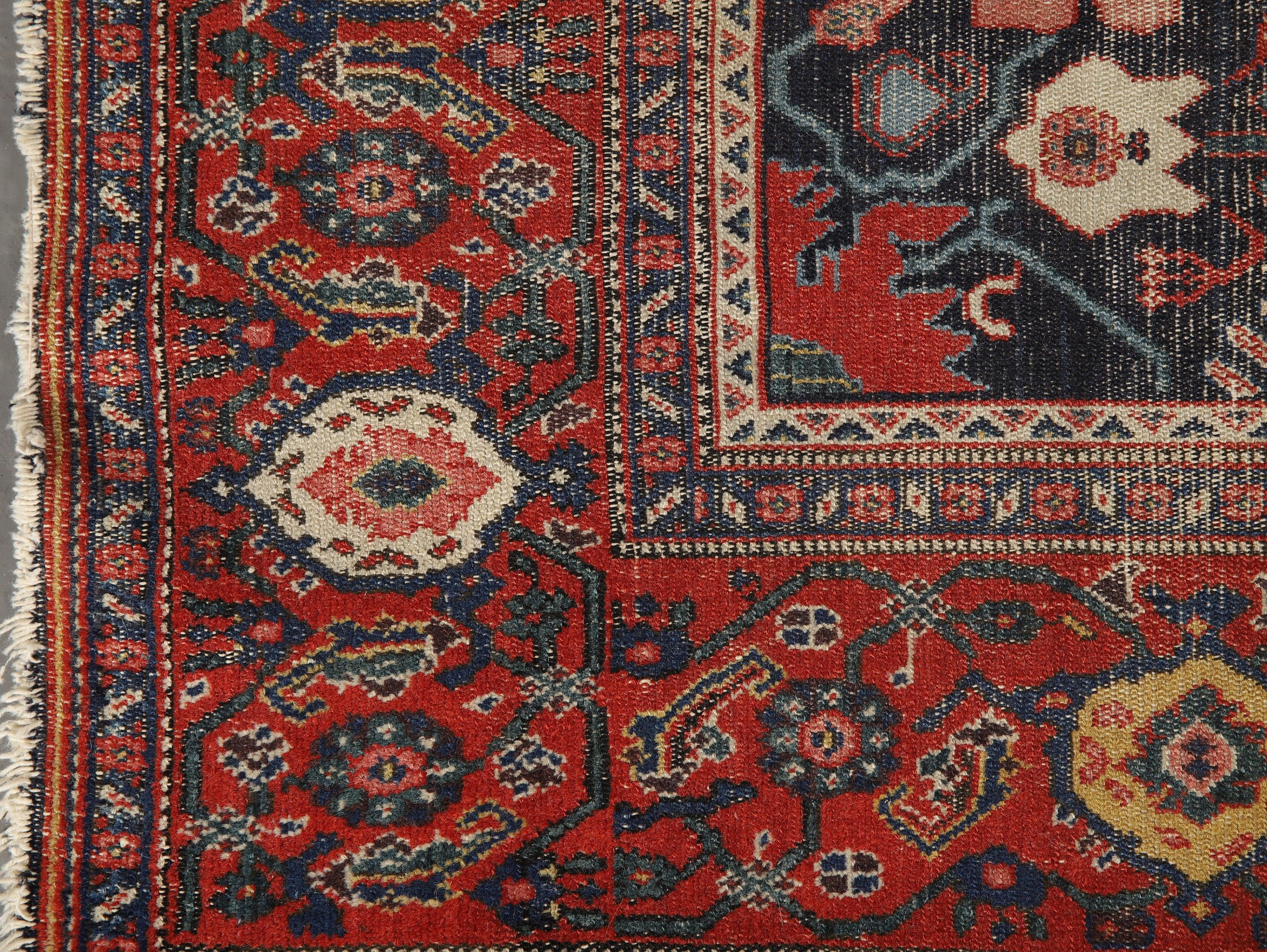 ORIGINAL, FINE AND OLD SENNEH CARPET (Iran) from the first half of the 20th century in wool and cotton decorated with palmettes and flowers on a midnight blue background. Density approx. 7,500 knots per dm2. 200 x 138 cm (natural wear and oxidation)
