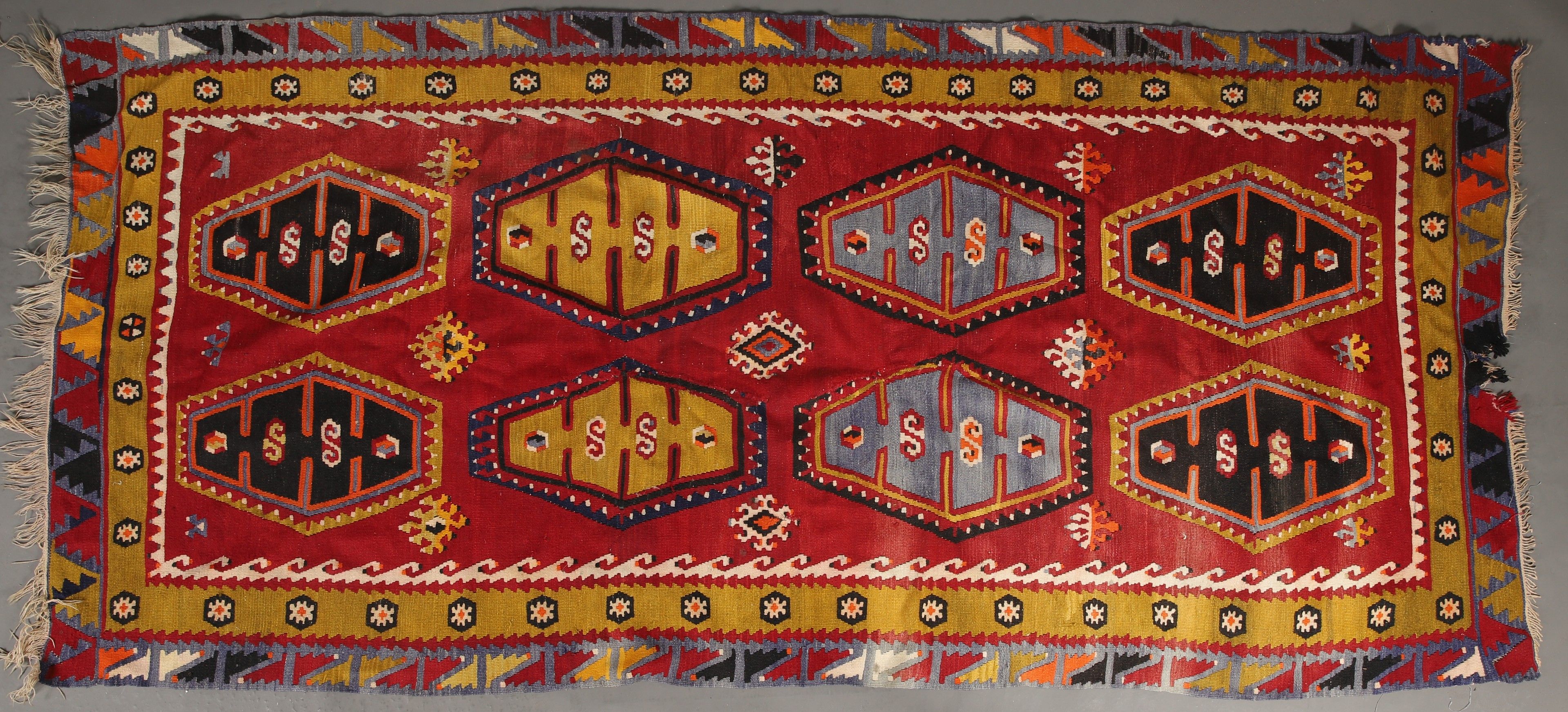 LARGE KILIM CHARCEUIL (Anatolia) circa 1950 in wool decorated with medallions on a red background. 290 x 145 cm (accident)